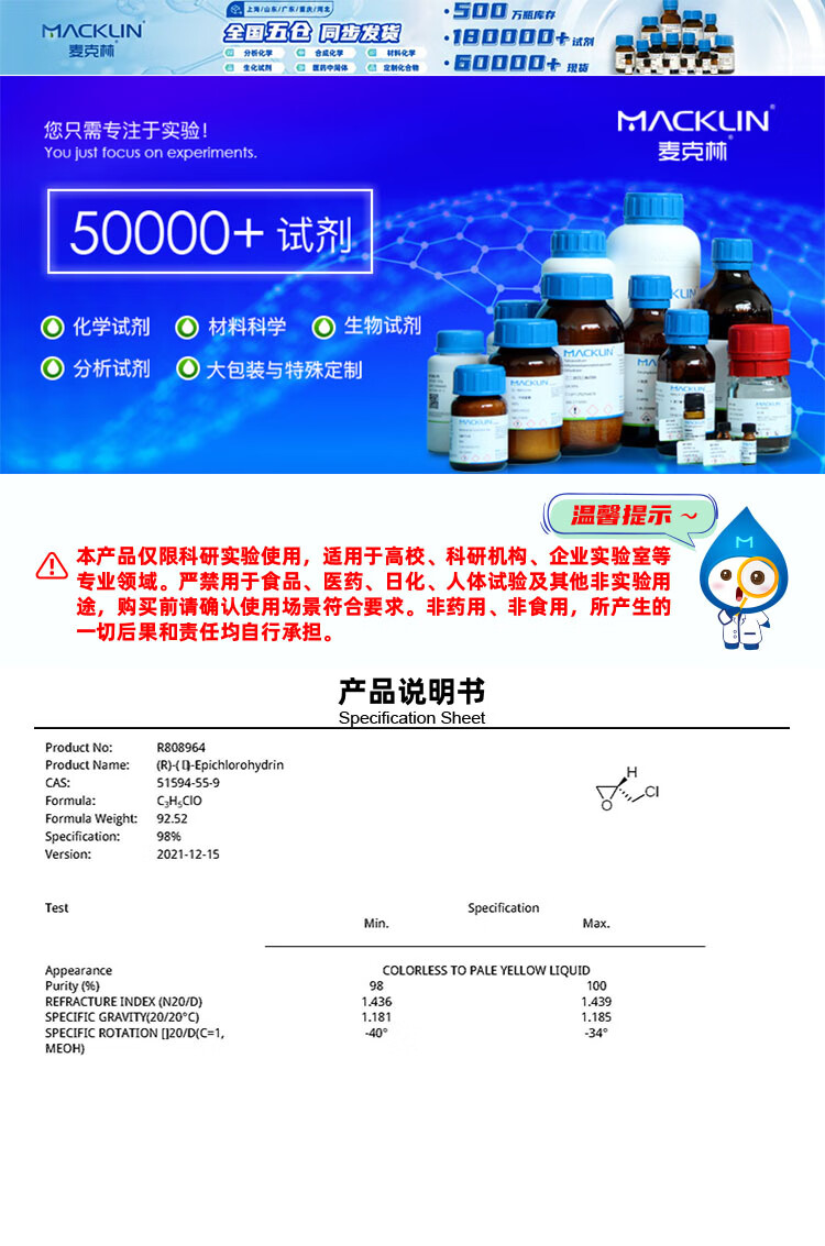 Macklin (|R|)-(-)-Epichlorohydrin CAS 51594-55-9 R808964-100g