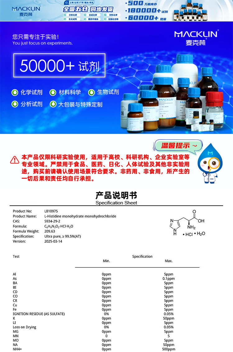Macklin L-histidine hydrochloride, monohydrate CAS 5934-29-2 L810975-5g