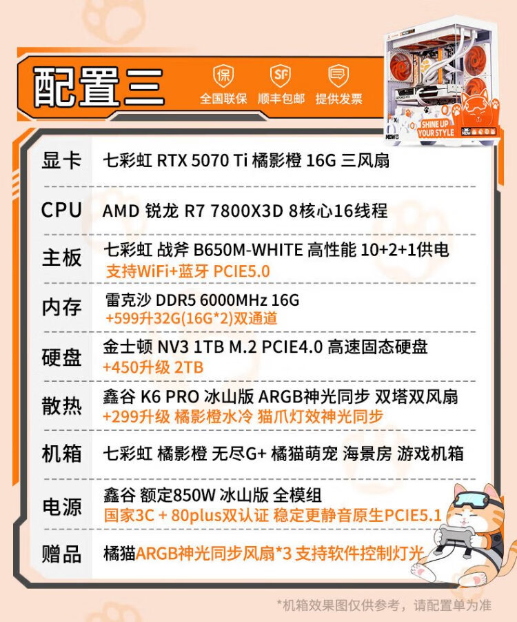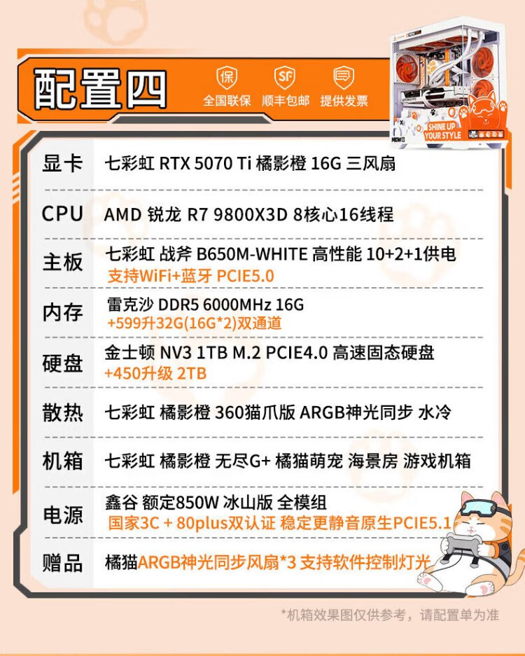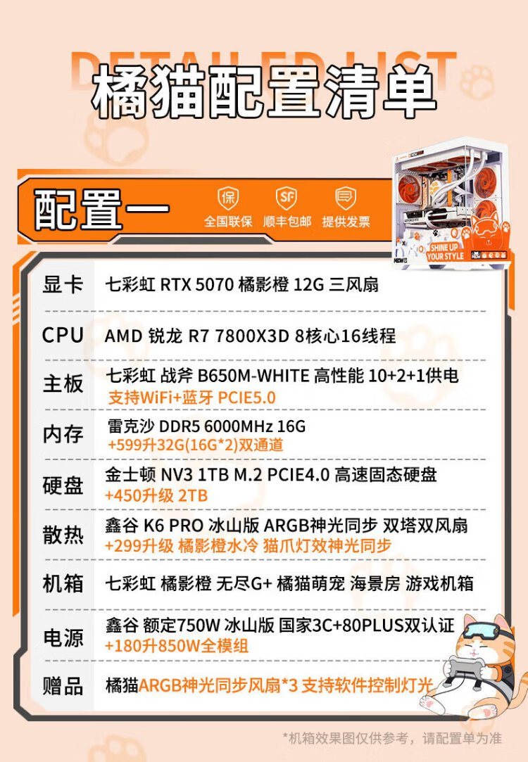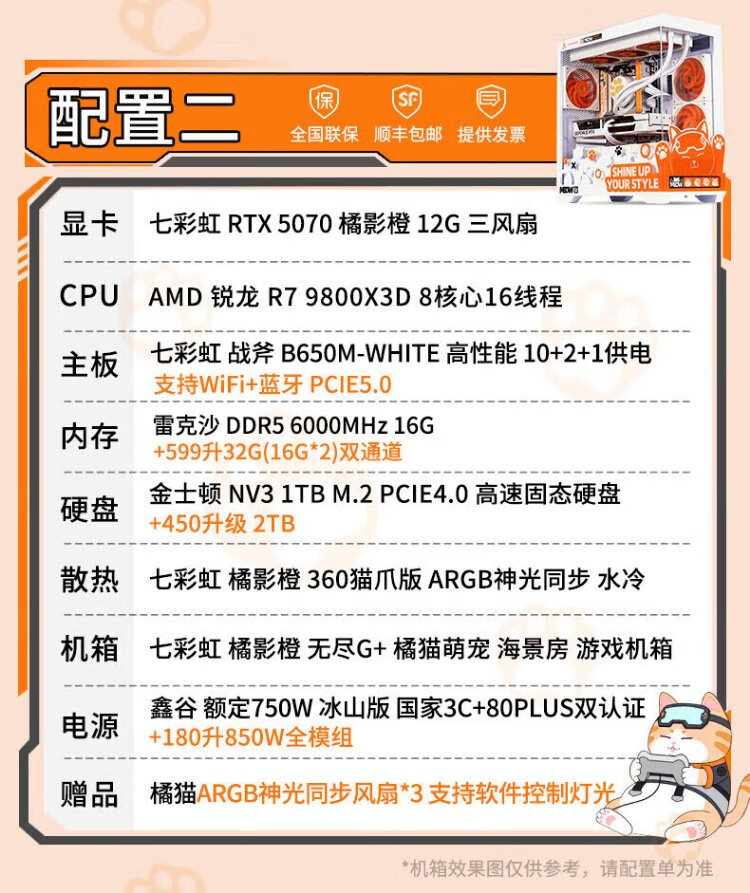 Colorful Orange Shadow Orange RTX 5070 Ti Orange Cat Customized DIY Assembly Desktop Computer 7800X3D Host AMD Ryzen 9800X3D Delta Fearless Compact Live Broadcast Machine Configuration Two 9800X3D + 5070 Orange Shadow Orange