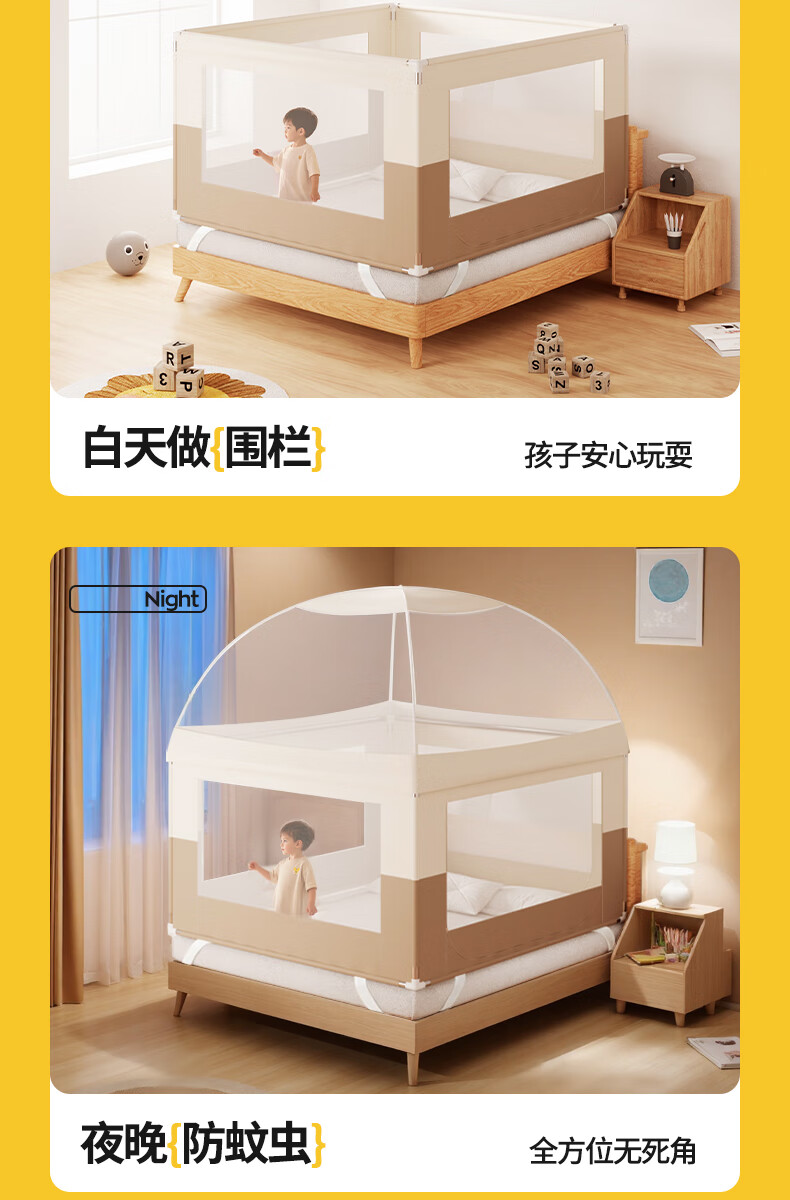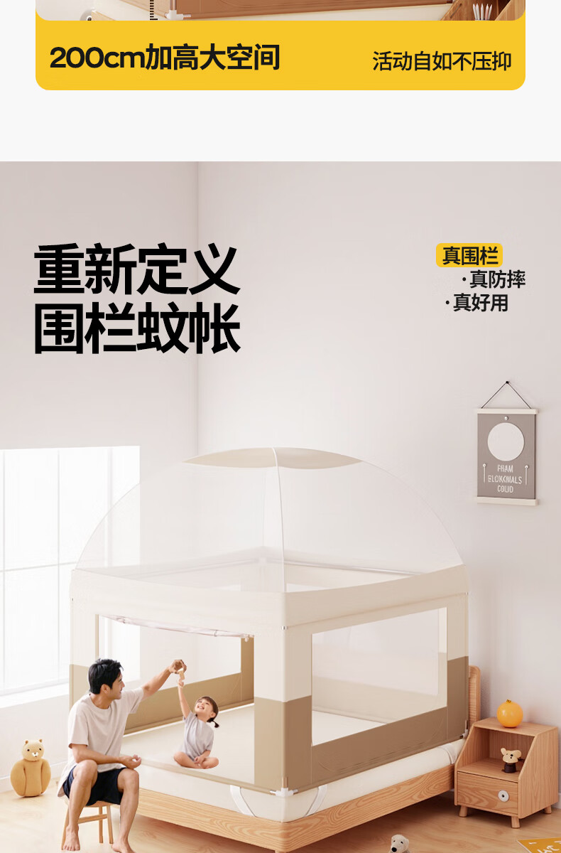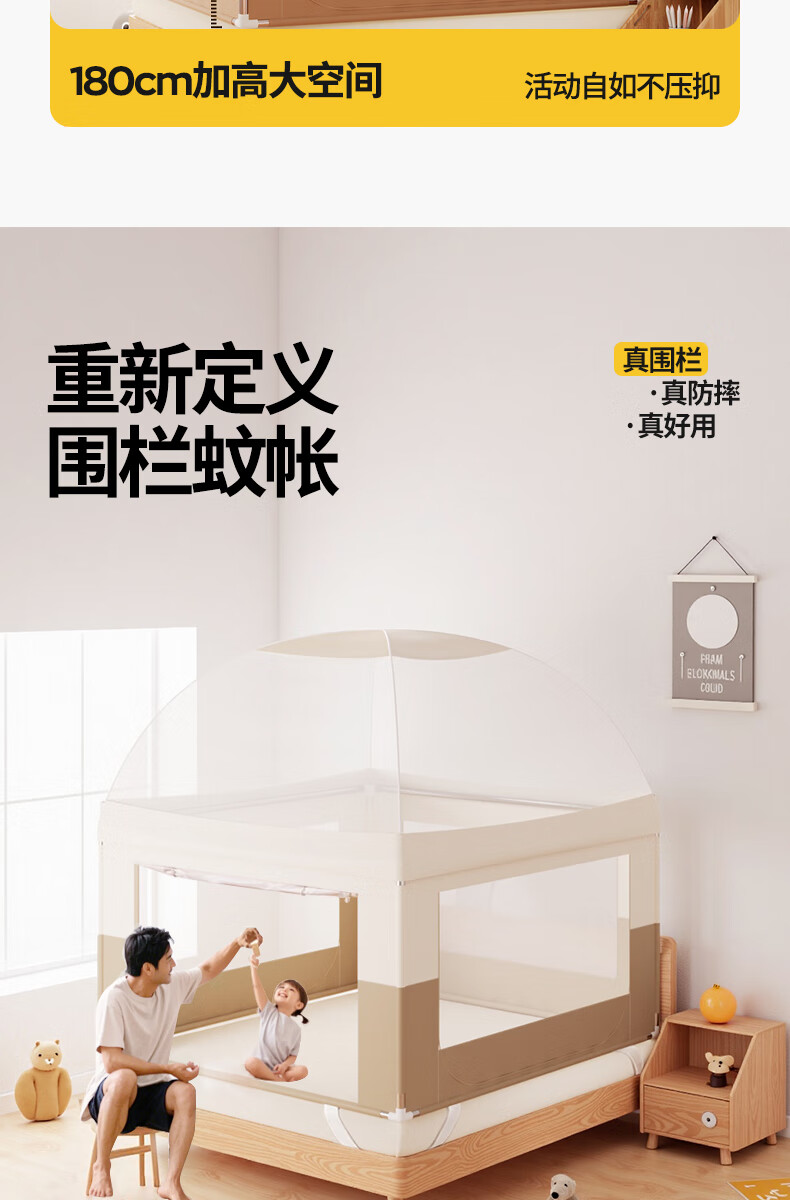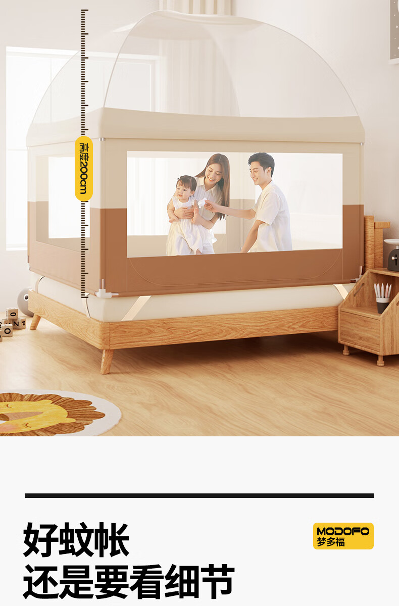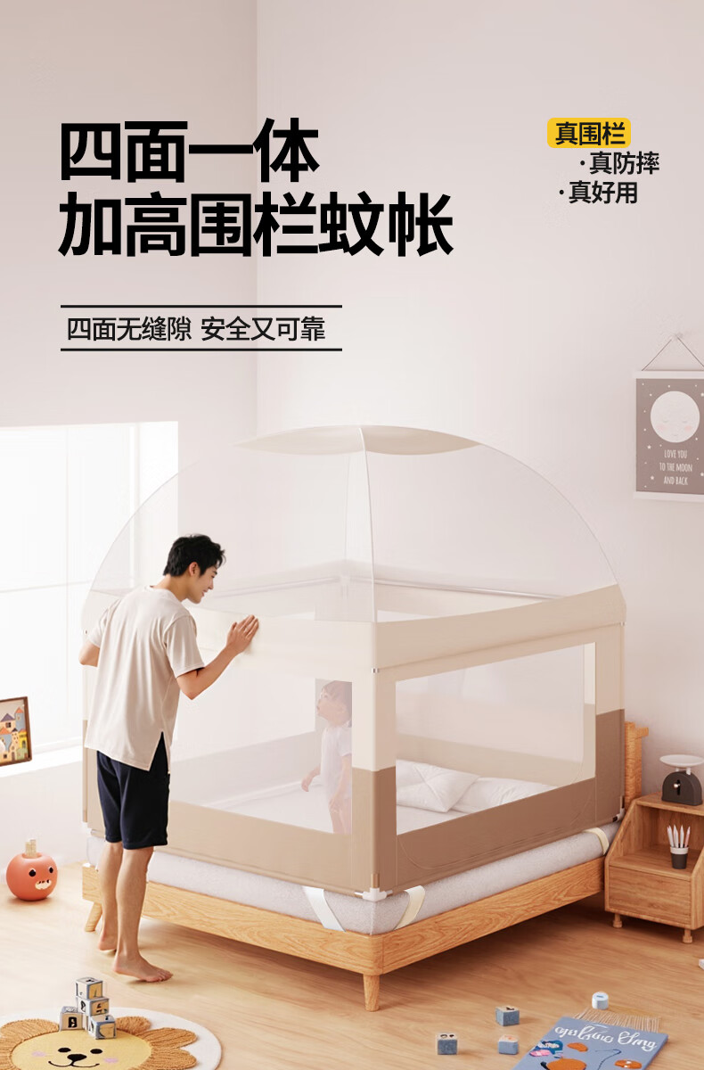Montover anti-fall bed fence pattern mosquito net frame one-piece fully surrounded and installation-free 1.8x2m household baby three-door upgrade model bed guardrail + yurt mosquito net + dustproof soft light top 180cm*200cm*180cm 1.8m bed