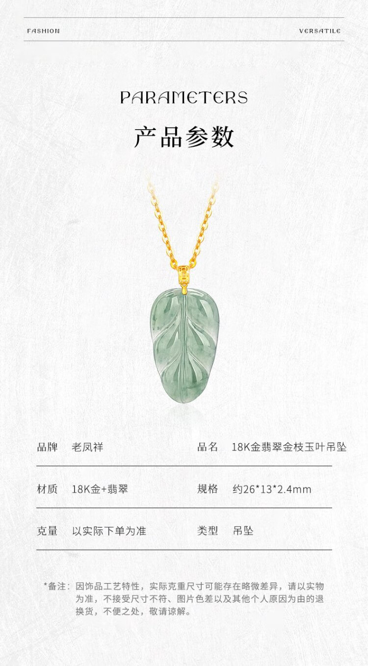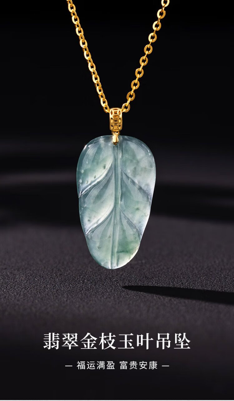 Lao Fengxiang 18K gold gold necklace, gold branches, jade leaves, jade pendant, birthday gift for wife, gold jewelry for girlfriend, 18K gold jadeite, gold branches, jade leaves, pendant