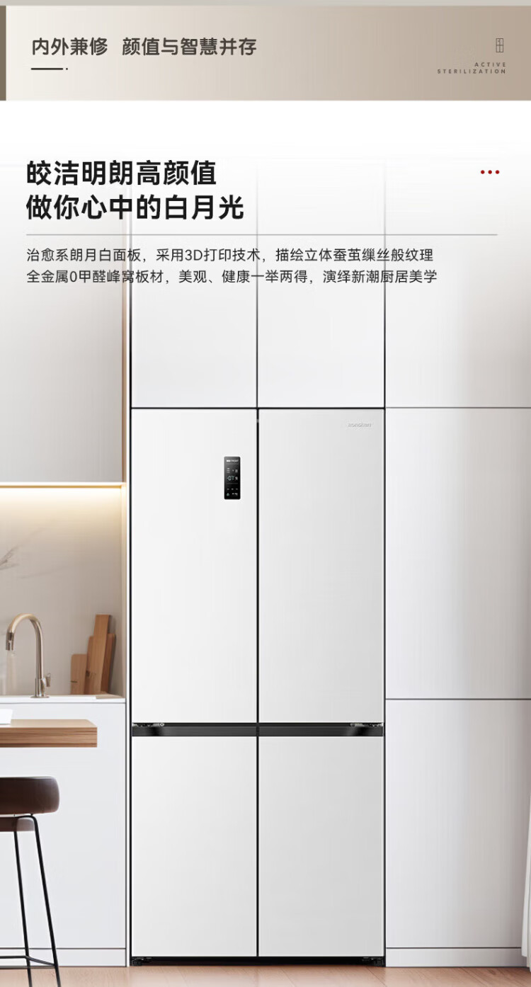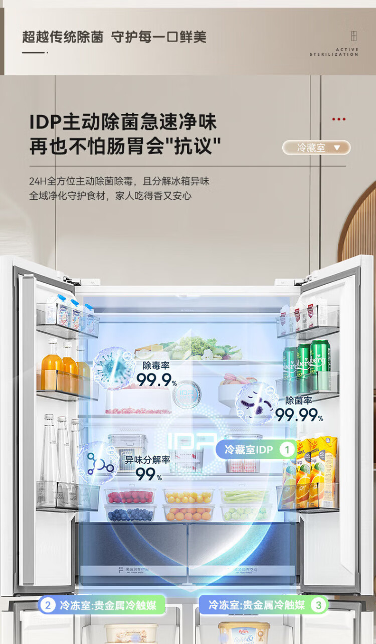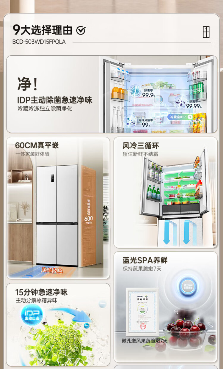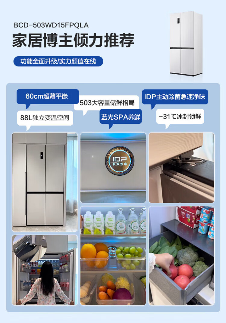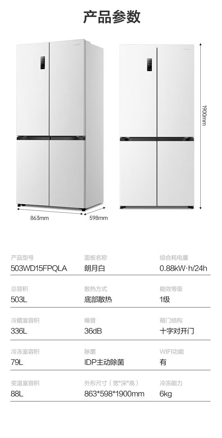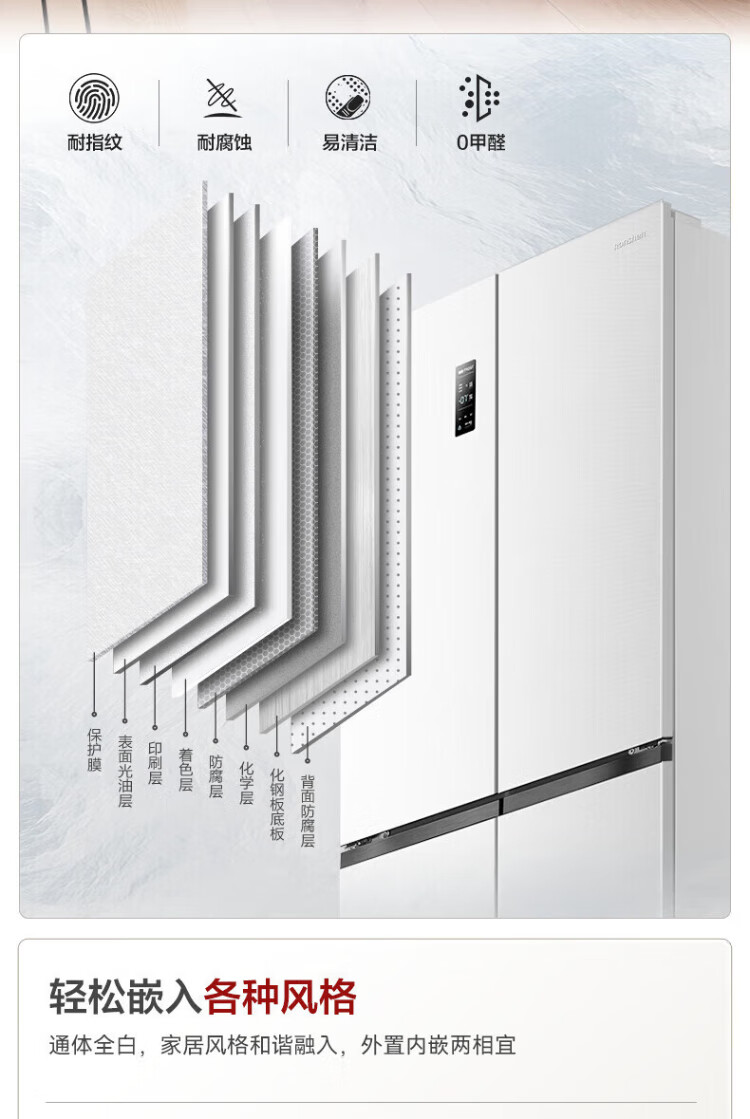 Rongsheng 503proIDP clean smell cross-door four-door household refrigerator thin zero embedded bottom heat dissipation first-class energy efficiency air-cooled frost-free frequency conversion trade-in appliance subsidy IDP blue light freshness BCD-503WD15FPQLA white