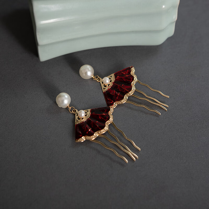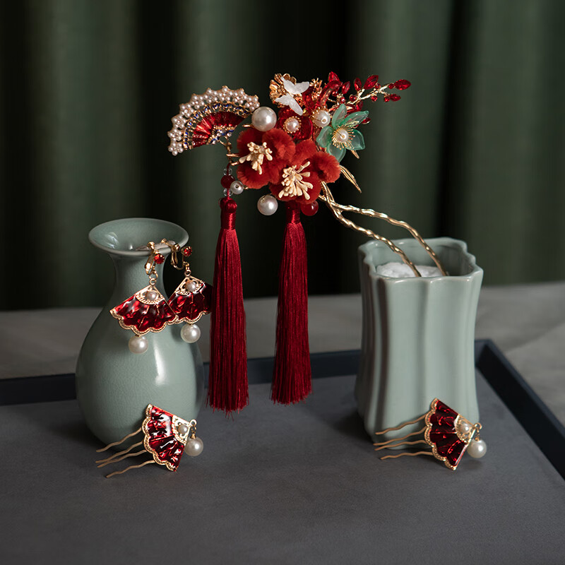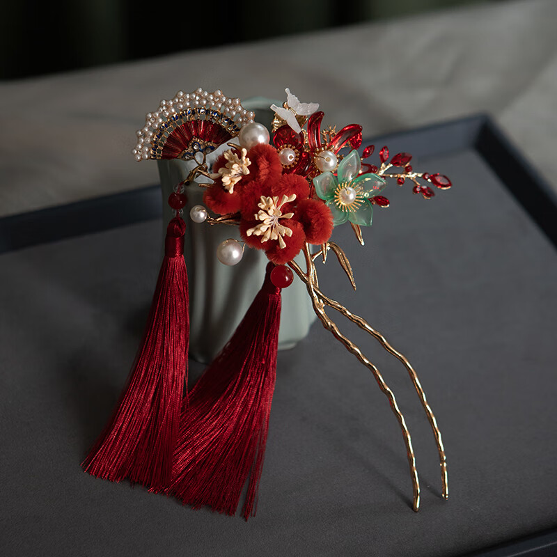 Shijun (SHIJUN) Bridal Toast Wear Red Hair Accessories Xiu Hetou Clothing Step Fan Shape New Chinese Style Hairpin Wedding Dragon and Phoenix Coat Cheongsam Suit