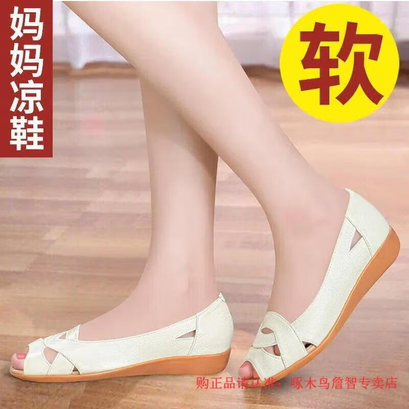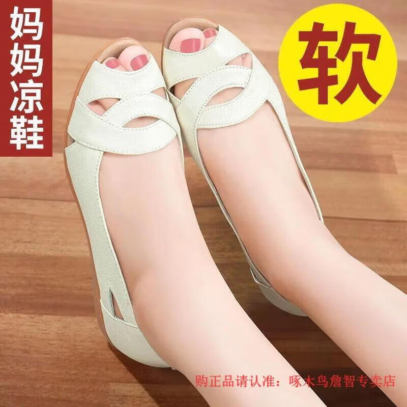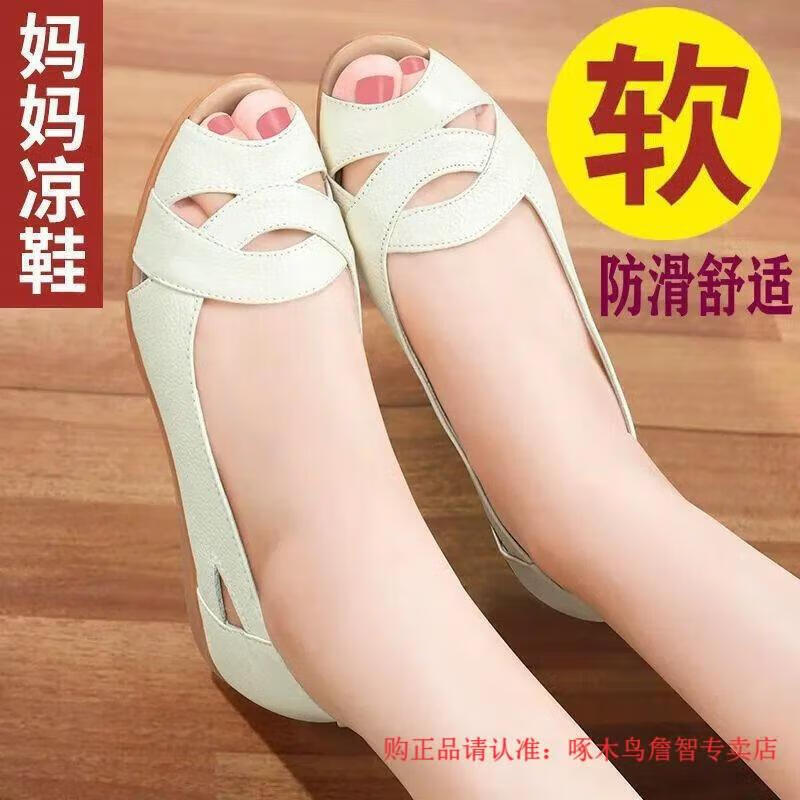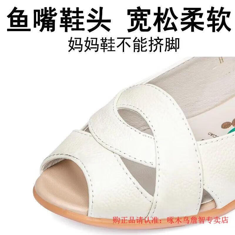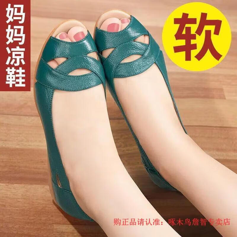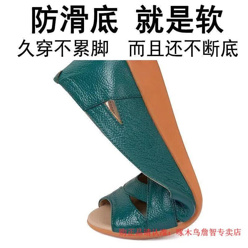 Woodpecker middle-aged women's shoes summer new soft leather large size fish mouth shoes for middle-aged and elderly people flat non-slip soft sole comfortable mom sandals military green 38