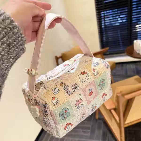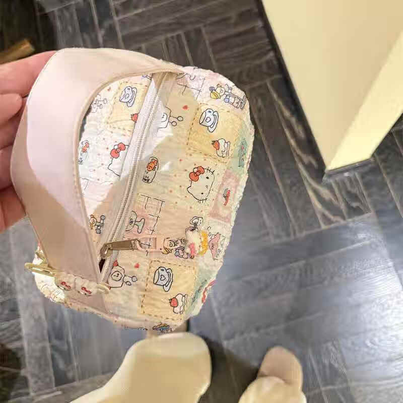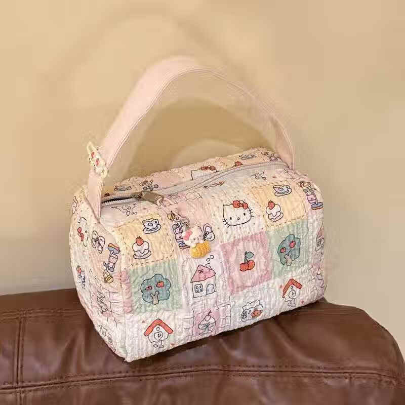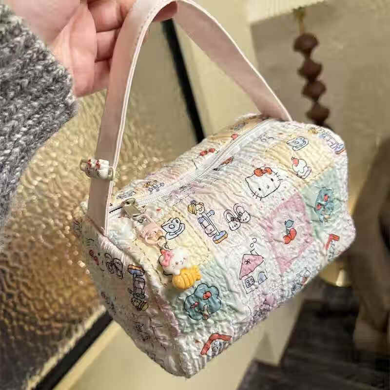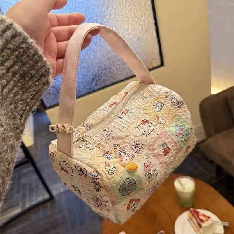 2025 new cartoon cat convenient makeup and toiletry bag, travel storage bag, large capacity three-dimensional handbag, pink plaid cat pillow bag