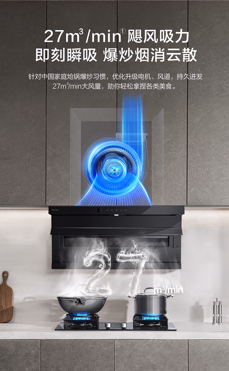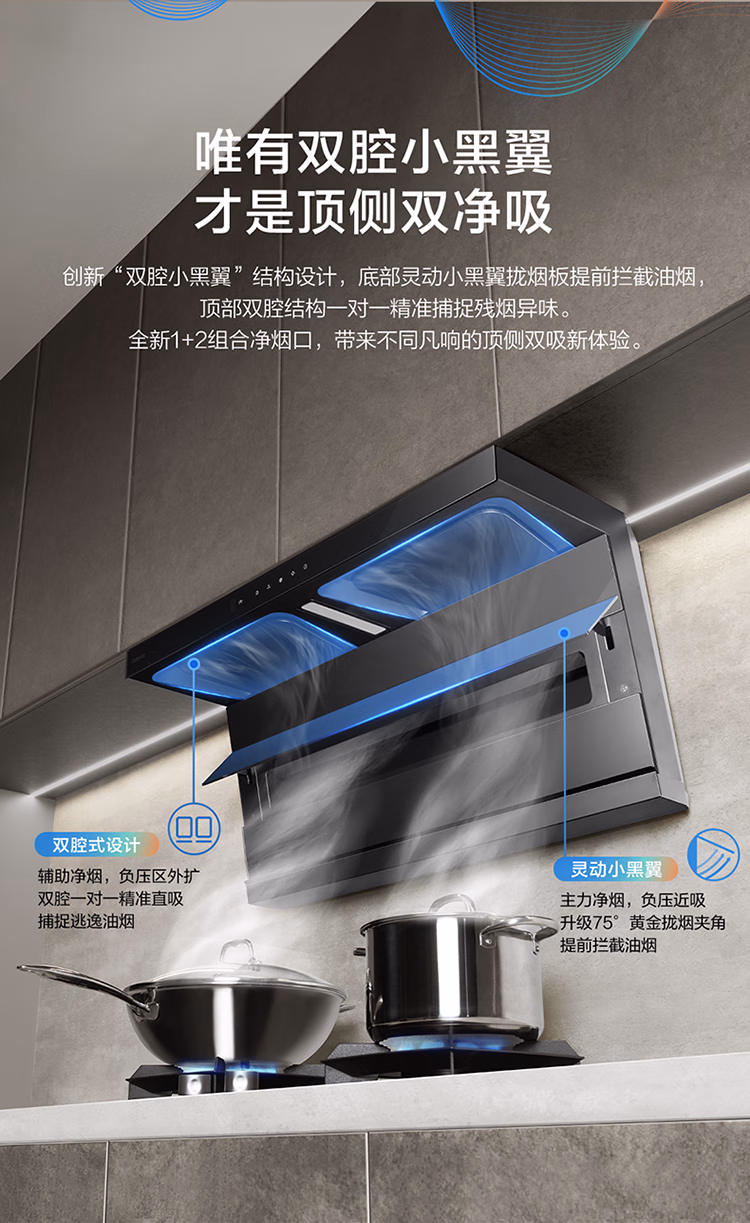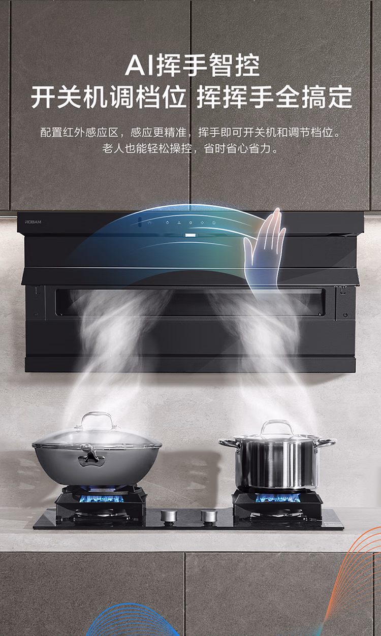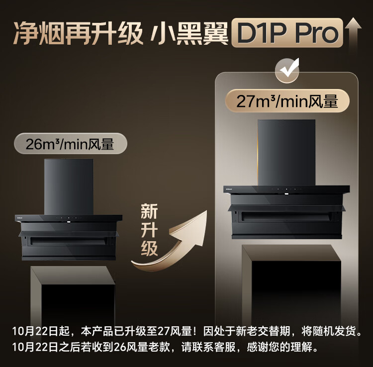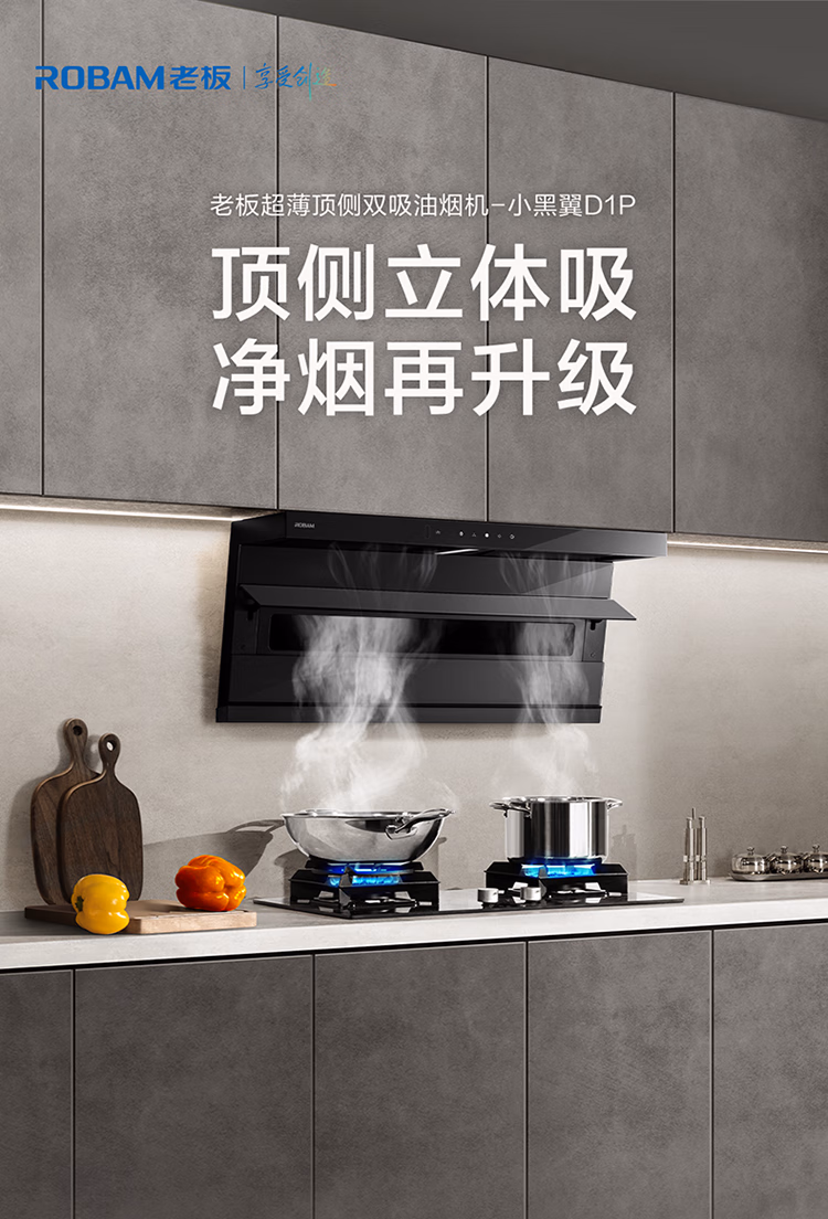 Robam range hood, small black wing upgraded model, juneng suction D1P, top side double suction 27 cubic meters large suction range hood gas stove set 7-shaped range hood (single hood) national subsidy 20%