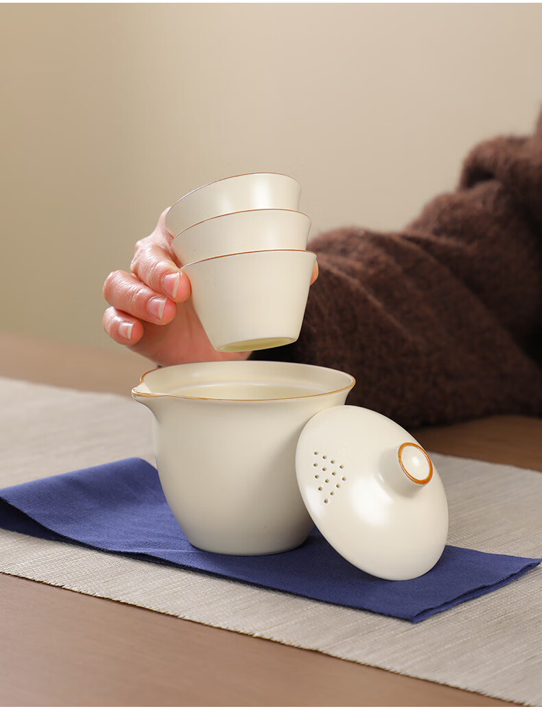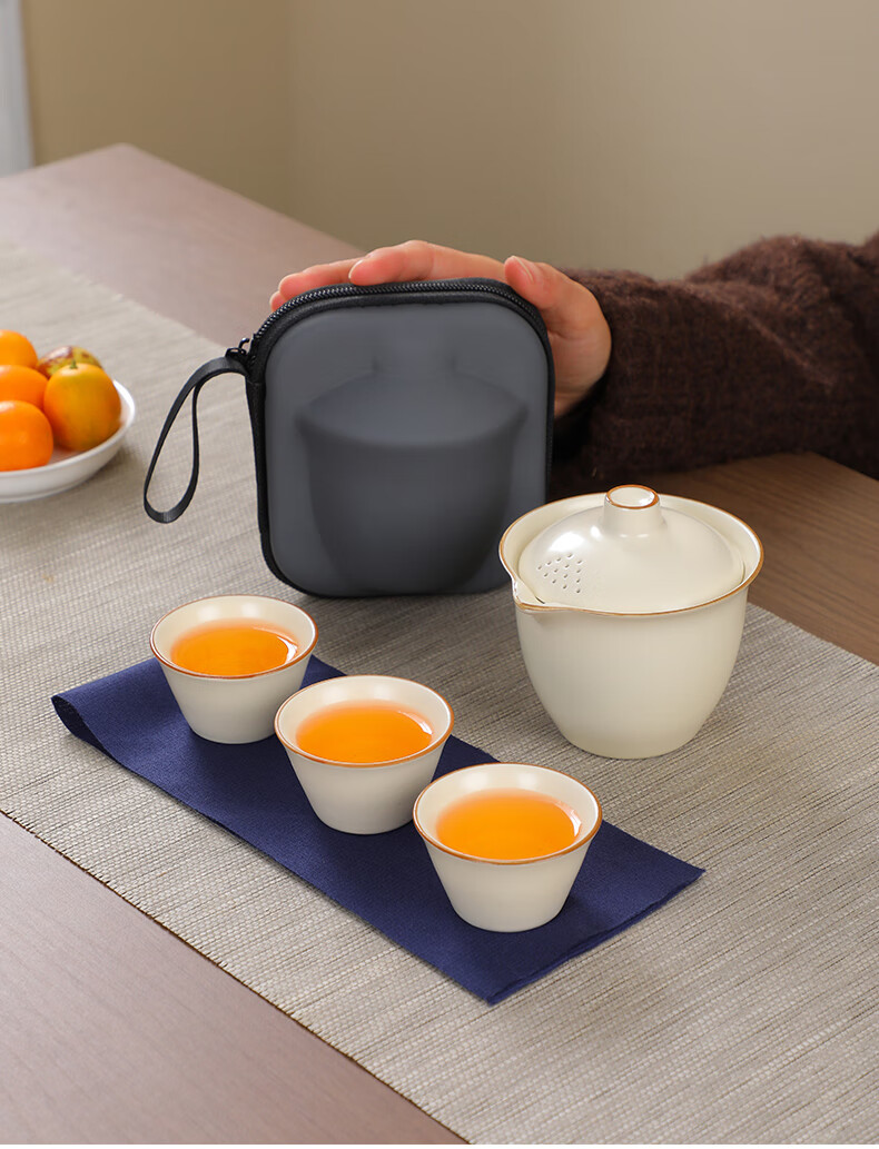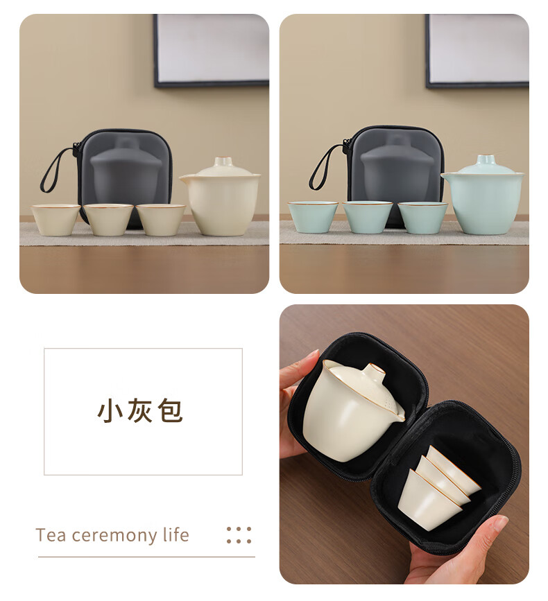 Ru kiln travel tea set portable ceramic quick cup for one person, one pot and three cups, outdoor camping hand-grabbed kung fu teapot, sky blue (one pot, three cups) + travel bag