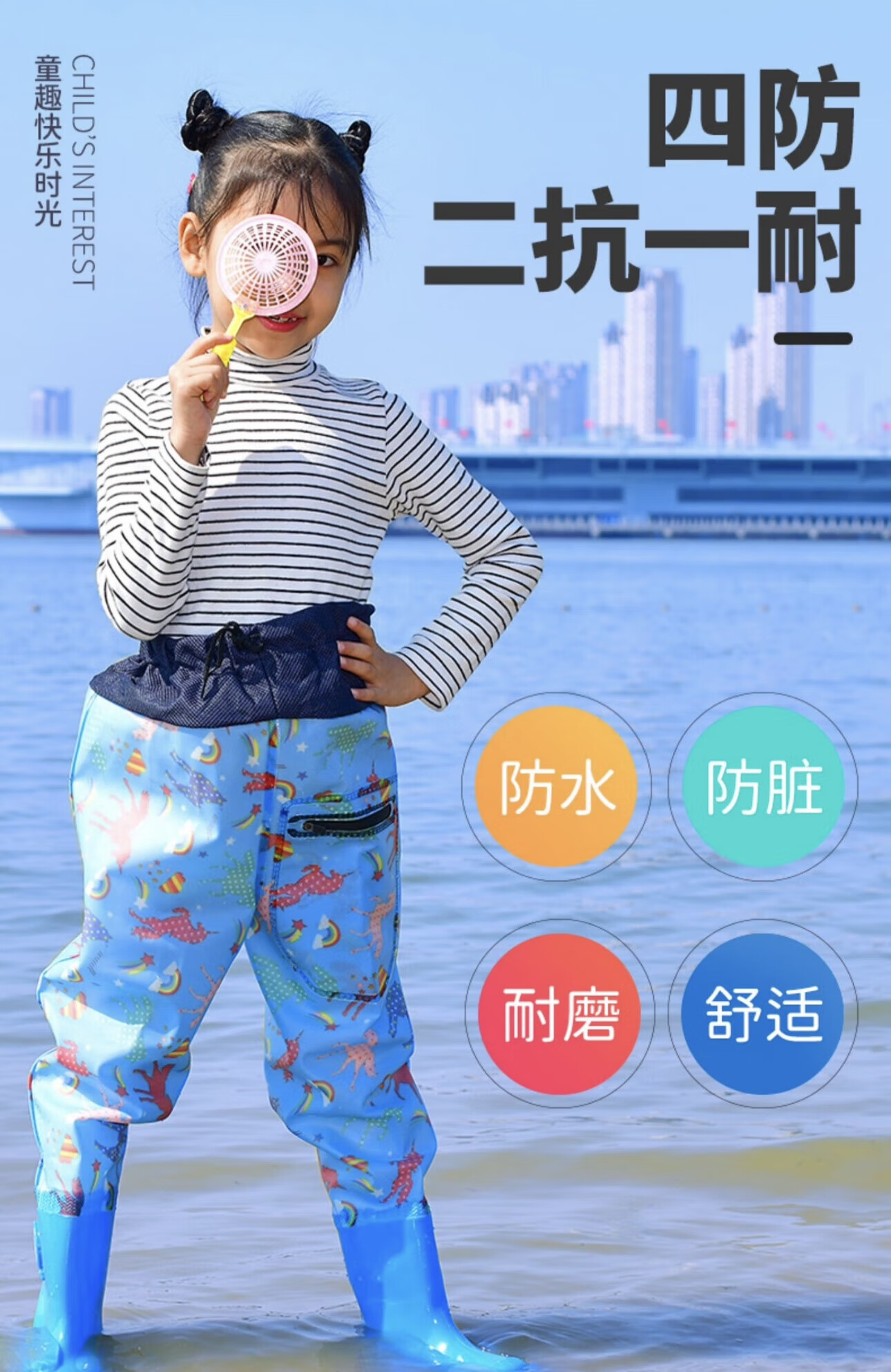 Children's waders, sea wear, wading clothes, baby wading pants, waterproof one-piece rain boots, play water clothes, fish fishing, water fork pants, blue size 35, shoe inner length 22cm