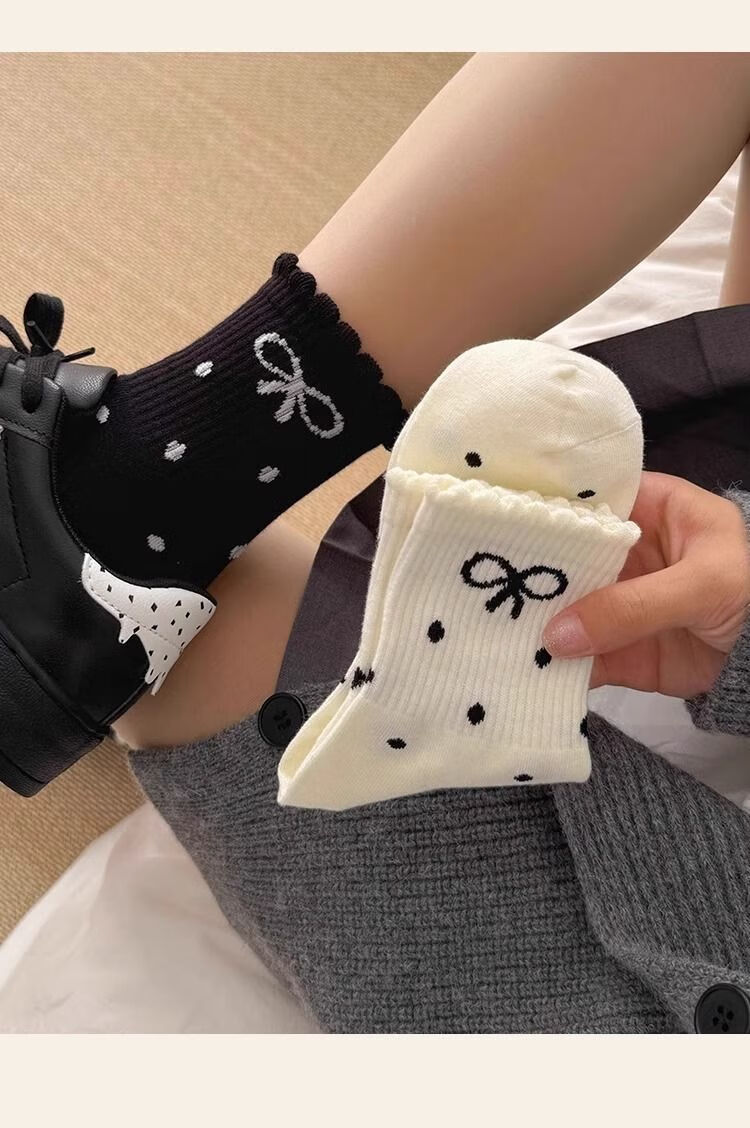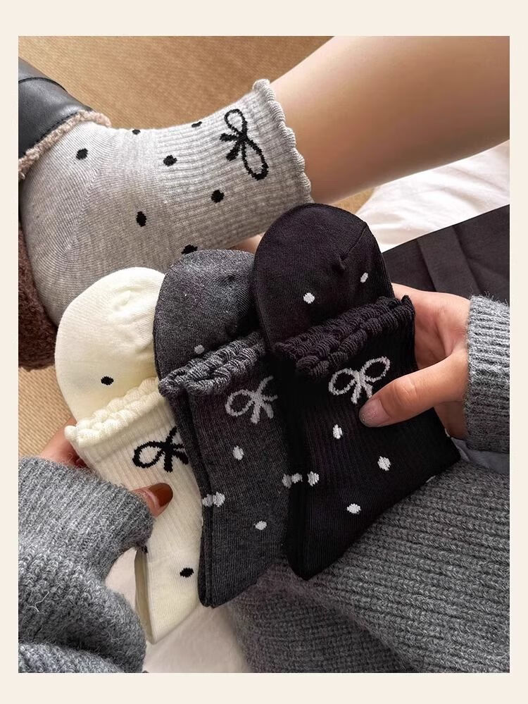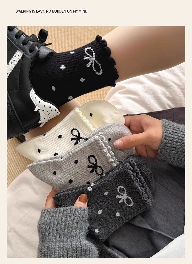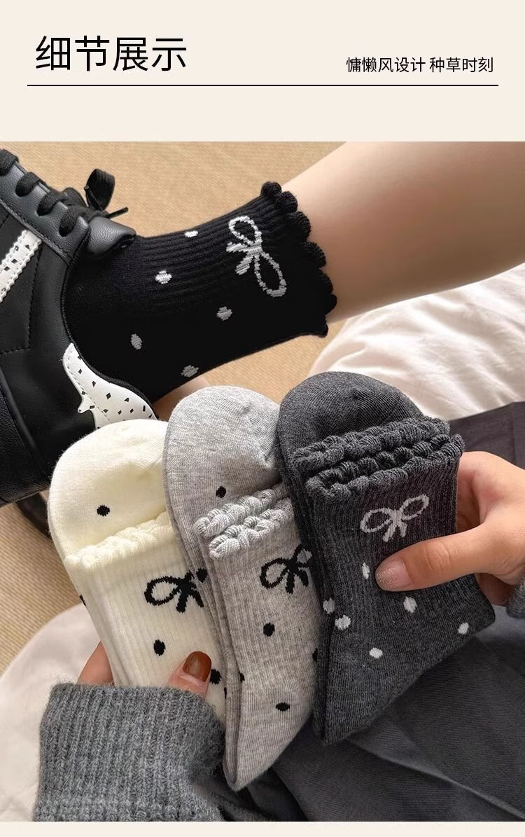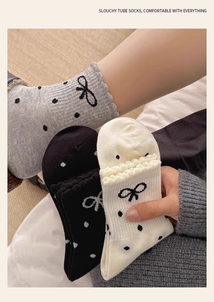 Socks for women, mid-calf socks, student style, solid color bow, Japanese cute polka dot lace with daddy shoes, pile of socks, 5 pairs, random colors, one size fits all