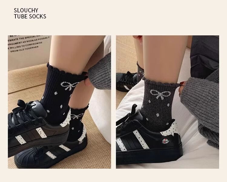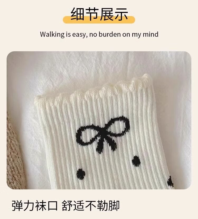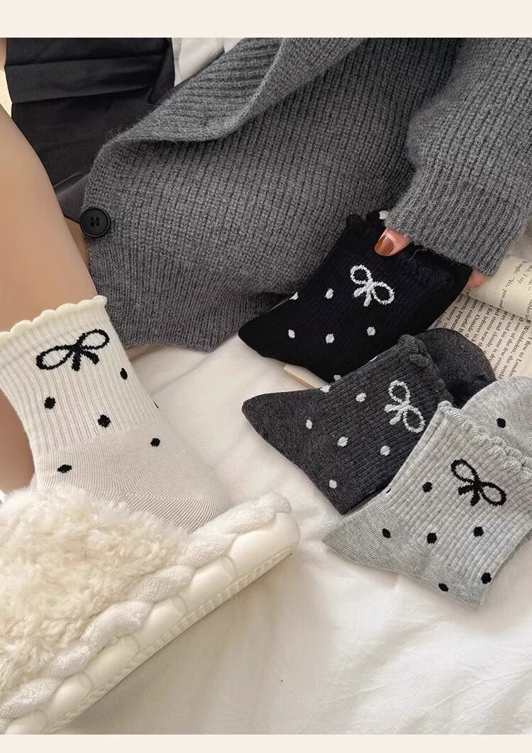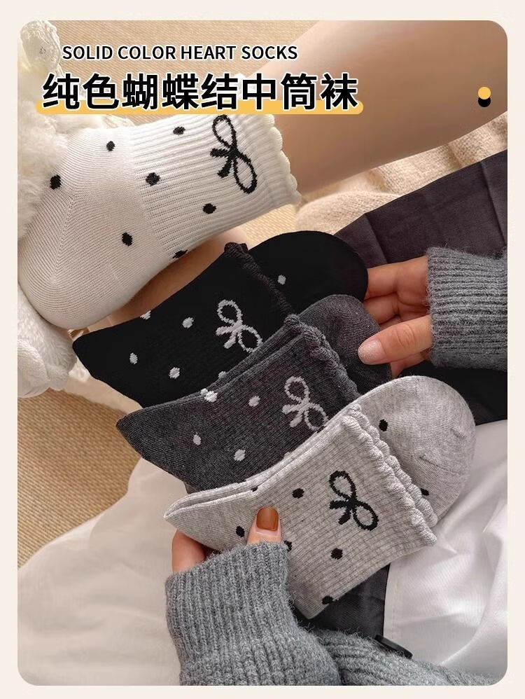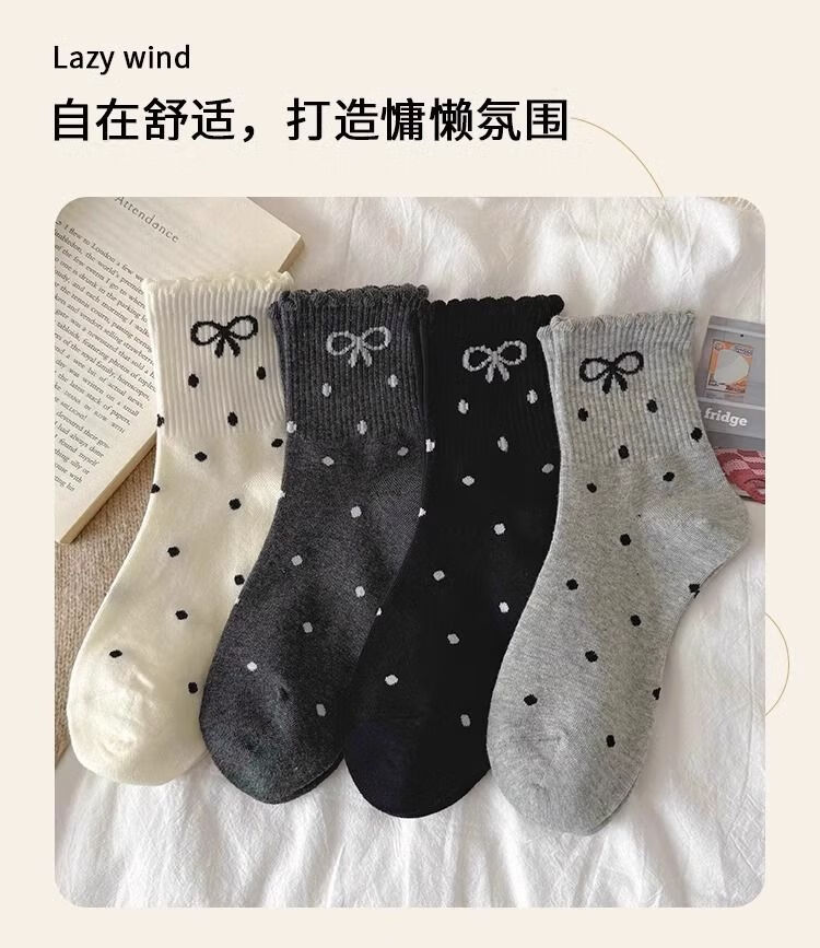 Socks for women, mid-calf socks, student style, solid color bow, Japanese cute polka dot lace with daddy shoes, pile of socks, 5 pairs, random colors, one size fits all