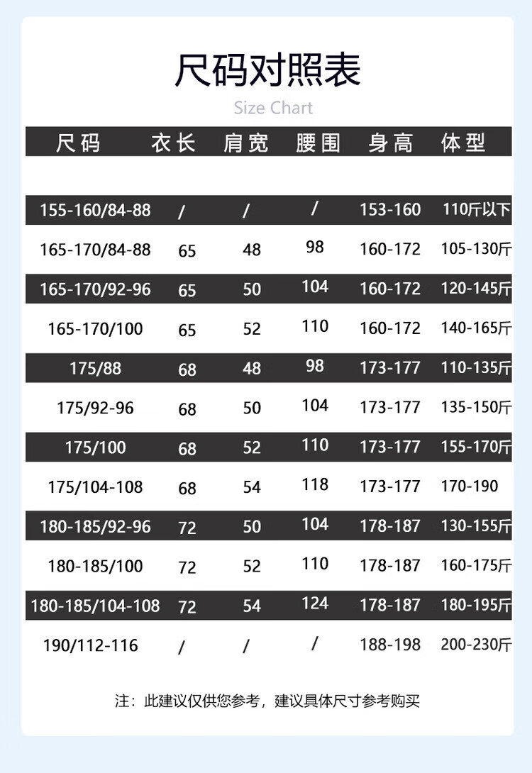China (cm) 160-165/84-86 165-170 / 88-90 167-172 / 92-96 168-173 / 98-102 170-176 / 106-110