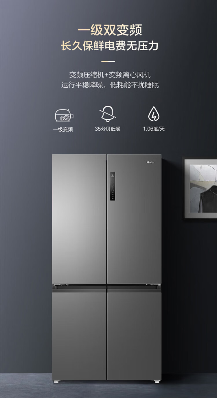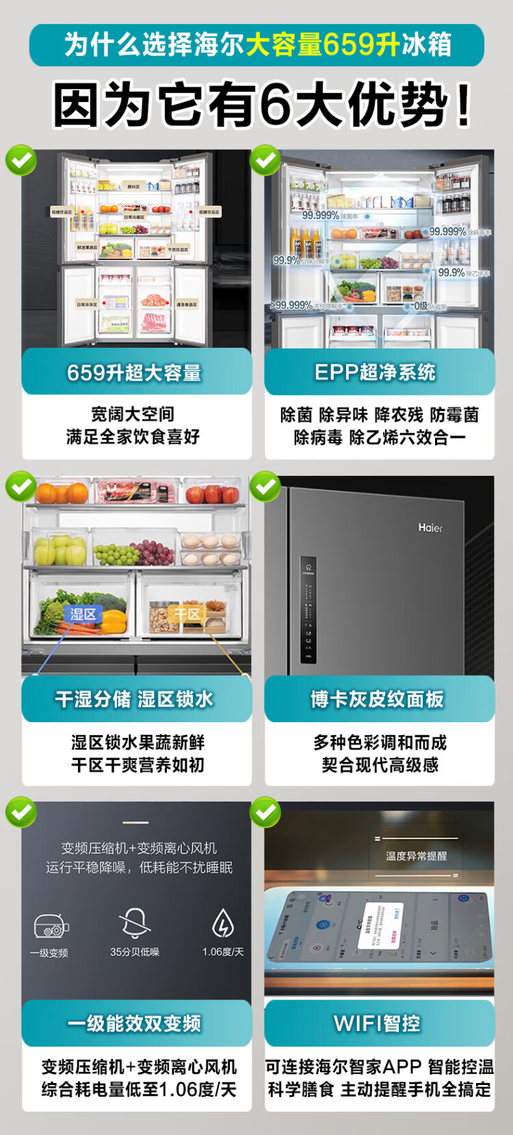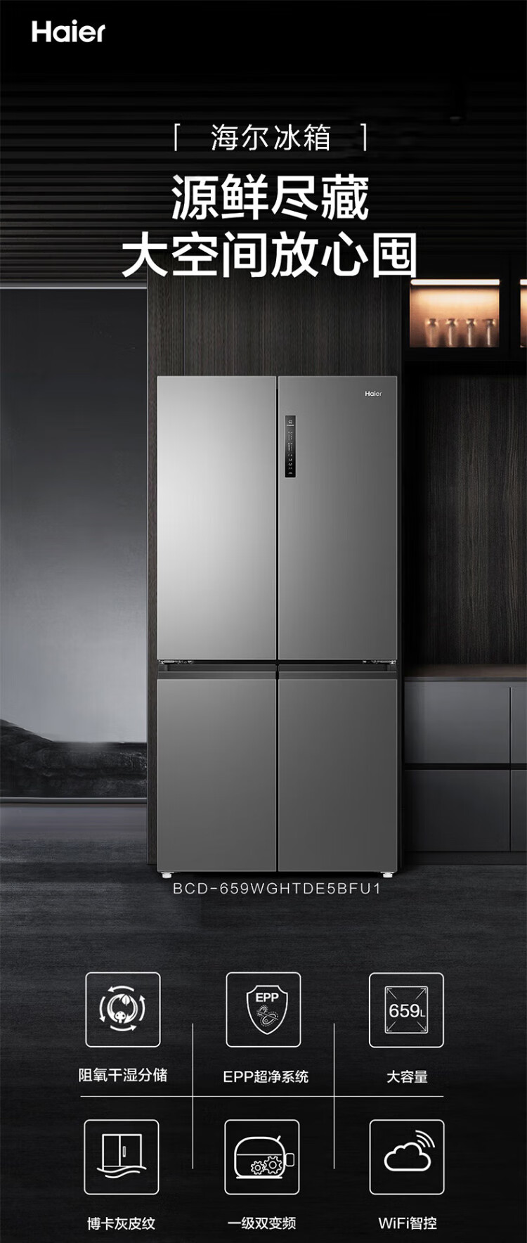 Haier refrigerator 659 liters four-door cross-door first-class energy efficiency dual frequency conversion air-cooled frost-free EPP ultra-clean system household super large capacity refrigerator government subsidy 20% 659 liter super large capacity + oxygen barrier dry and wet storage