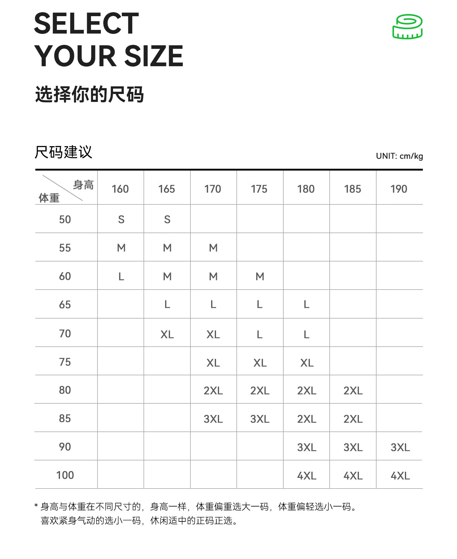 China (cm) 165 / 88-90 170 / 96-98 175 / 108-110 180 / 118-122 185 / 126-130