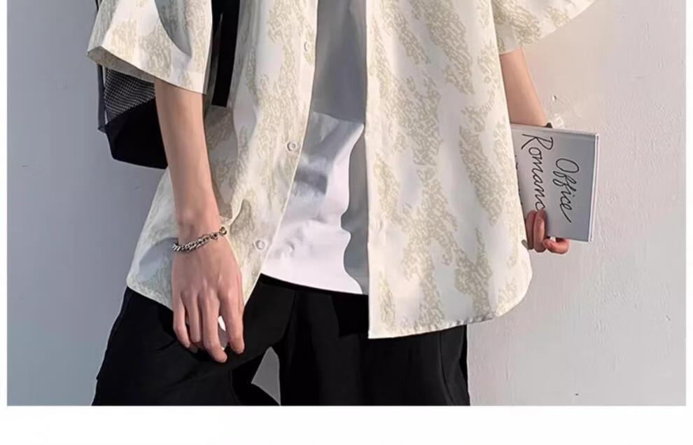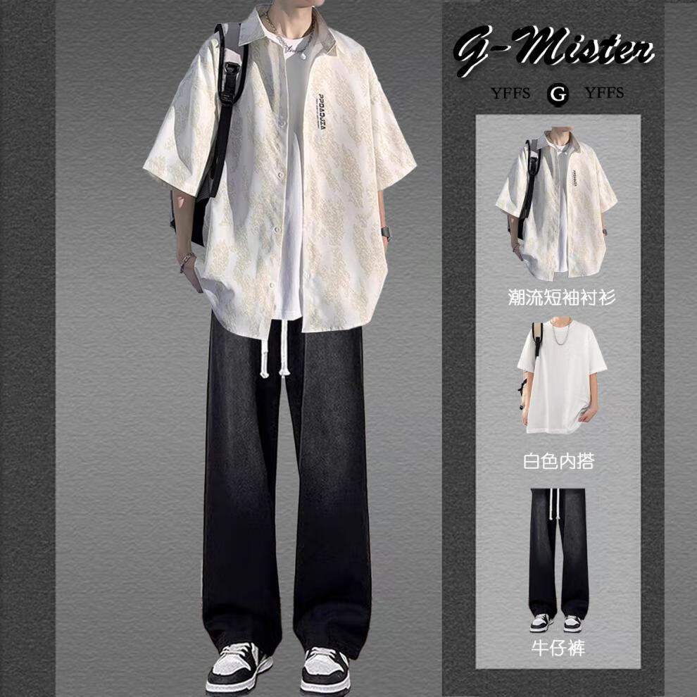 Anchu summer style new short-sleeved shirt men's summer casual suit high-end with handsome flower shirt three-piece trendy short-sleeved shirt white + short sleeves + jeans blue three pieces XL high quality recommended 120-140Jin Jin equals 0.5 kg