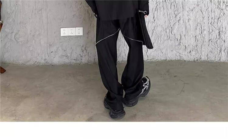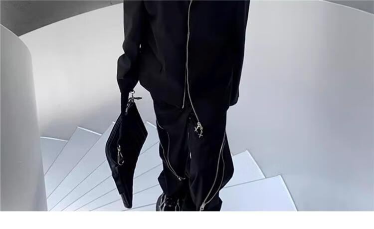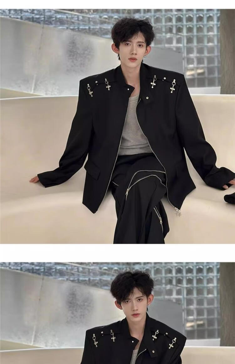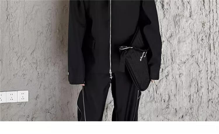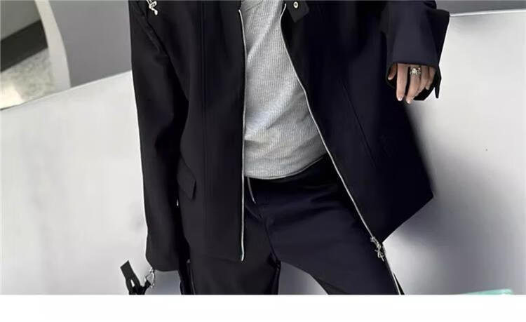 An Chuxia American high street shoulder padded blazer men's metal airplane buckle design jacket autumn handsome street suit black jacket + gray T-shirt + zipper pants 3-piece set XL store priority delivery
