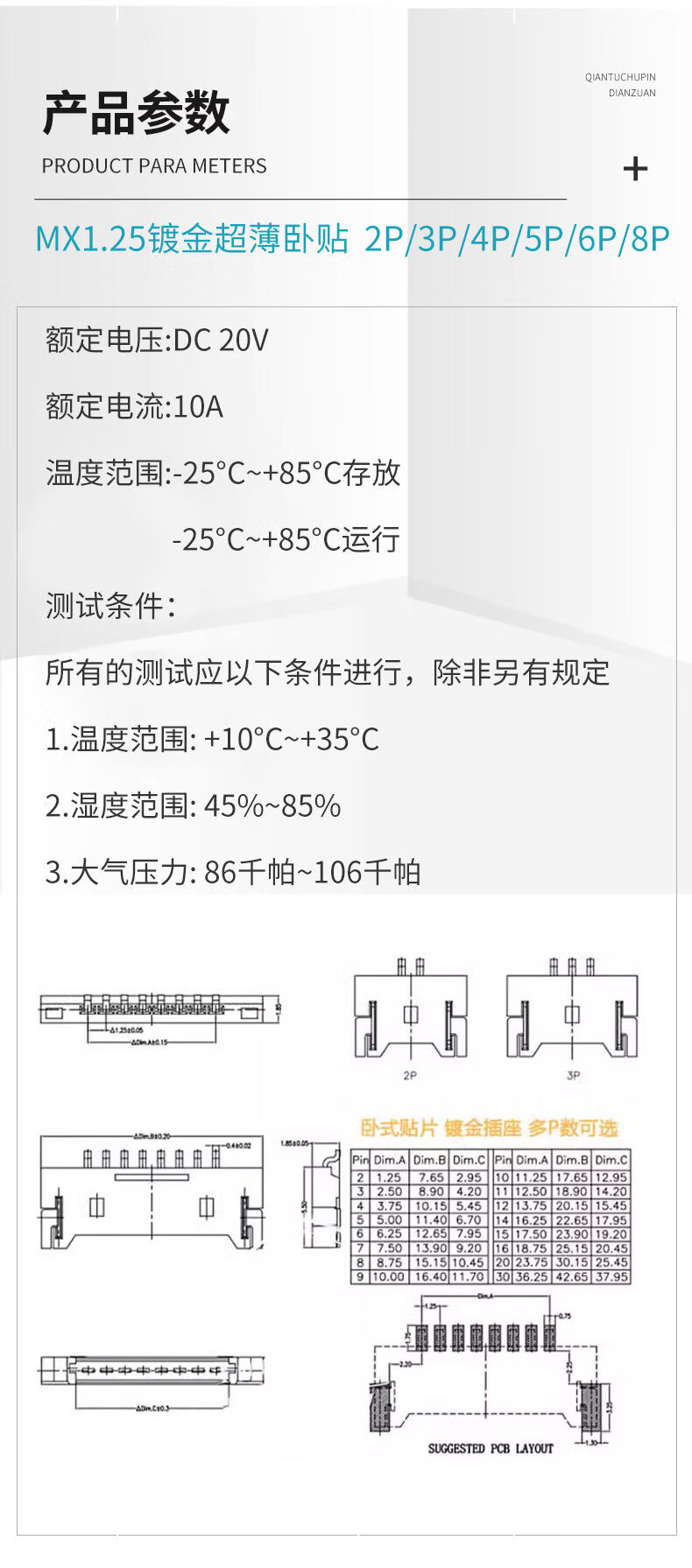 Zejie MX1.25mm pitch patch socket horizontal vertical patch 2/3/4/5/6/7/8/9/10P connector MX1.25 gold-plated ultra-thin horizontal patch 4p (10 pieces)