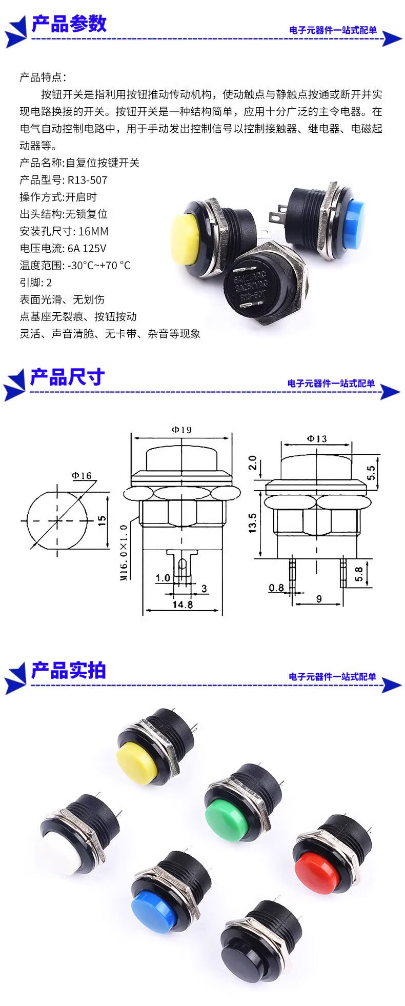 Zejie key switch R13-507 button point switch 16MM round lockless self-reset switch red green yellow black red lockless (2 pieces)