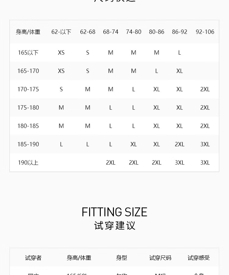China (cm) 165 / 88-90 170 / 96-98 175 / 108-110 180 / 118-122 185 / 126-130