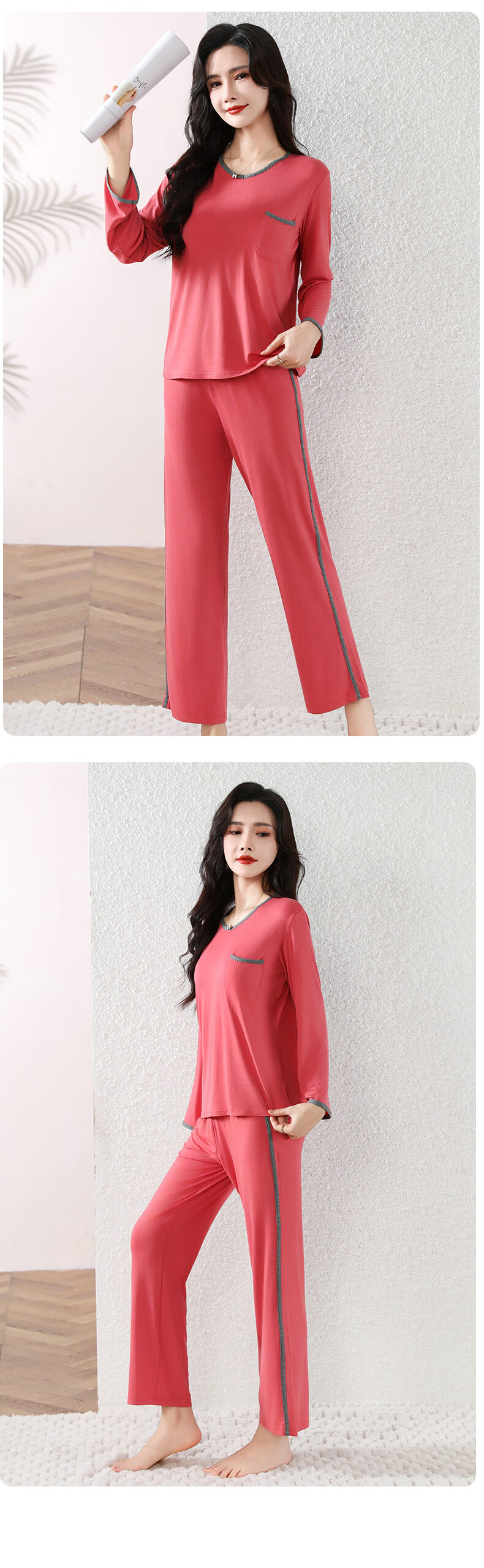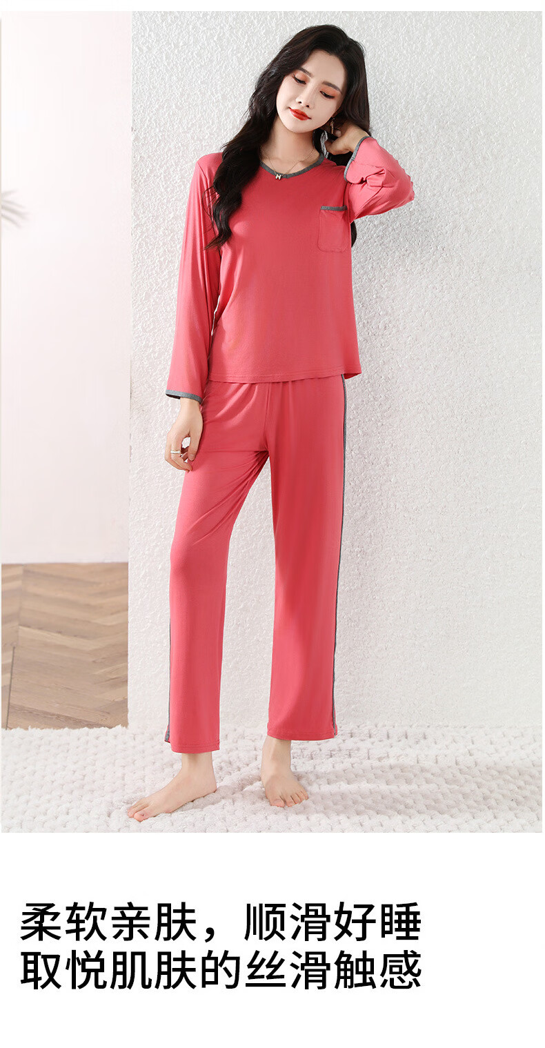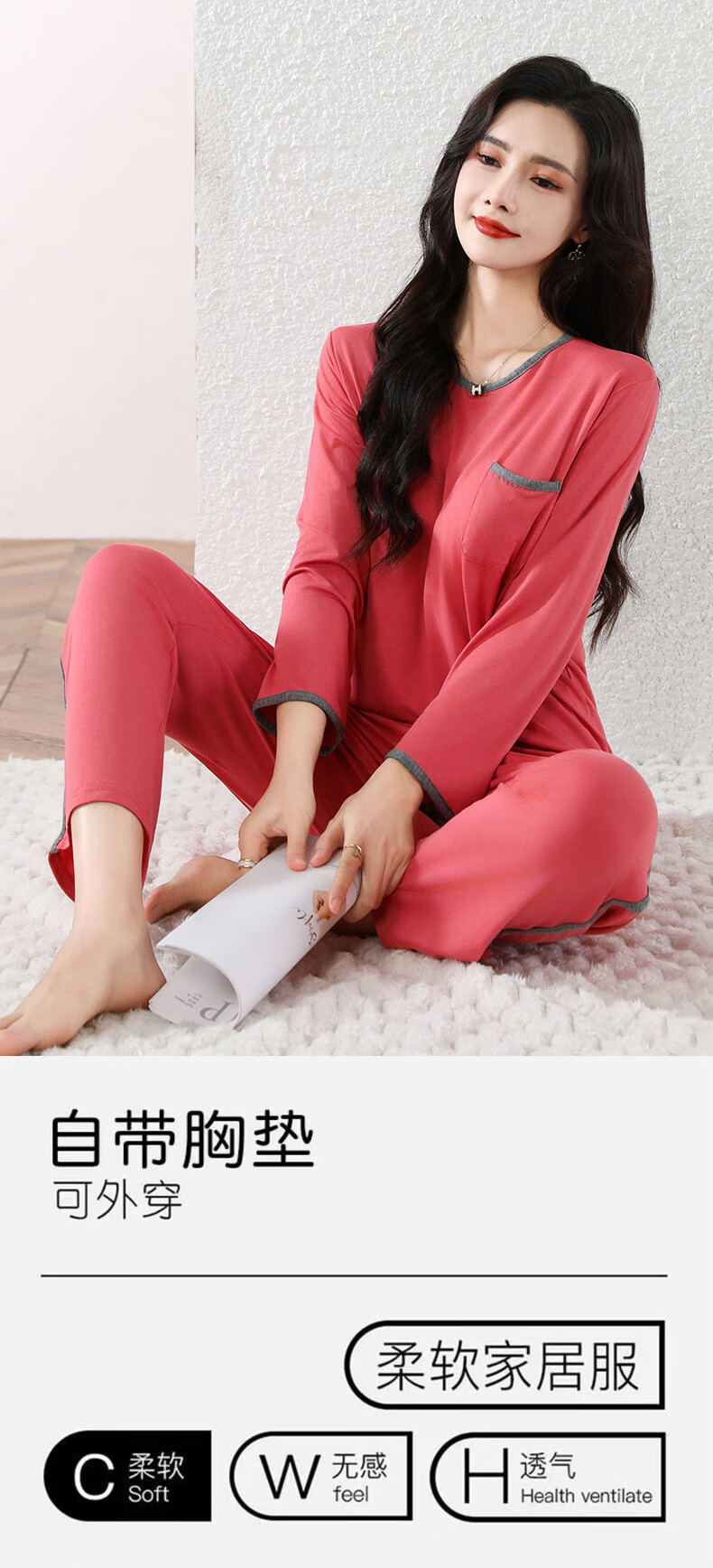 Dan Nanwei Spring and Autumn New Model Modal Pajamas for Women with Breast Pads, Loose Large Size Summer Home Clothes Set, Long Sleeves and Pants for Outerwear, Brick Red (Long Sleeves + Pants) XL (115-135Jin Jin equals 0.5kg)