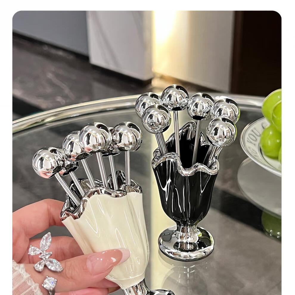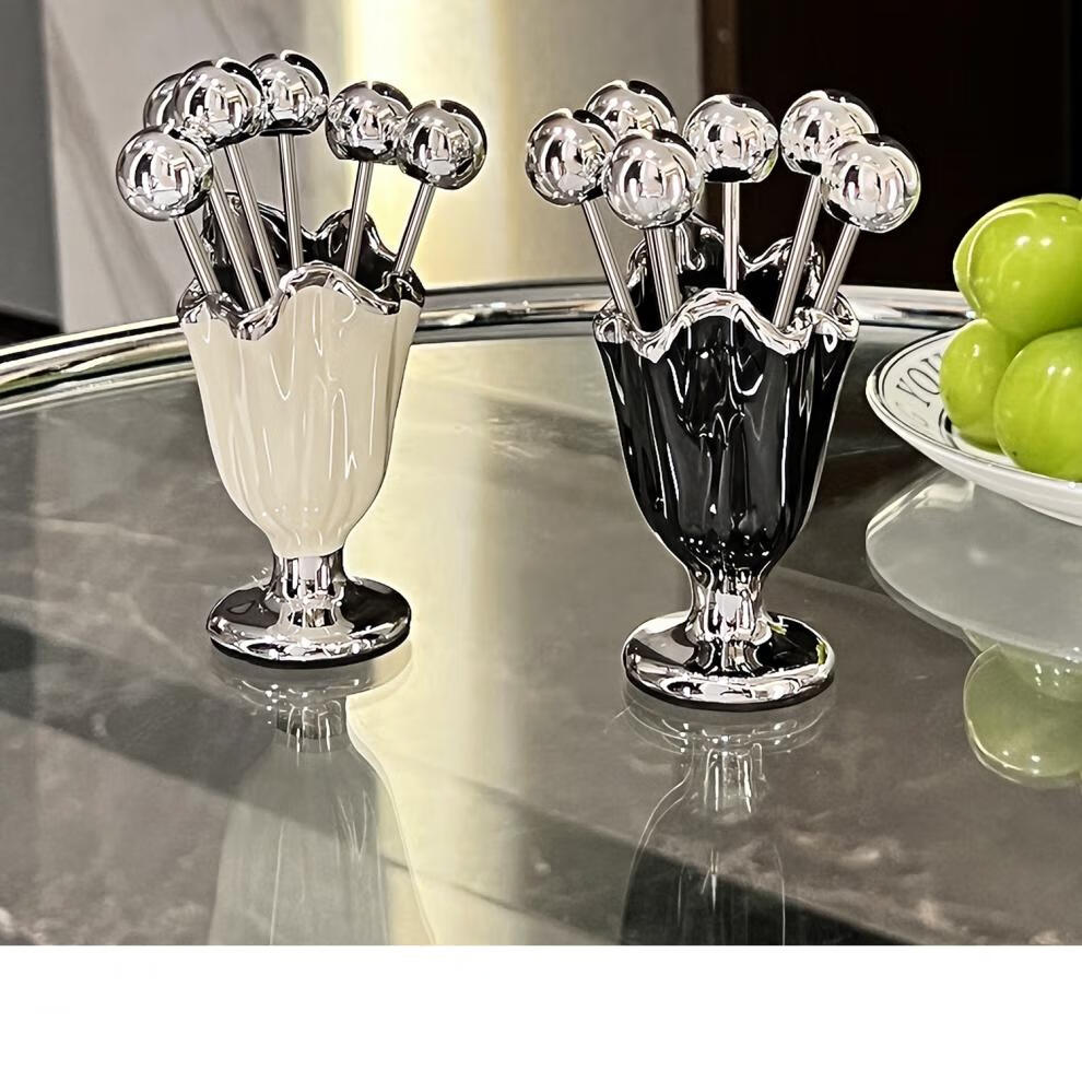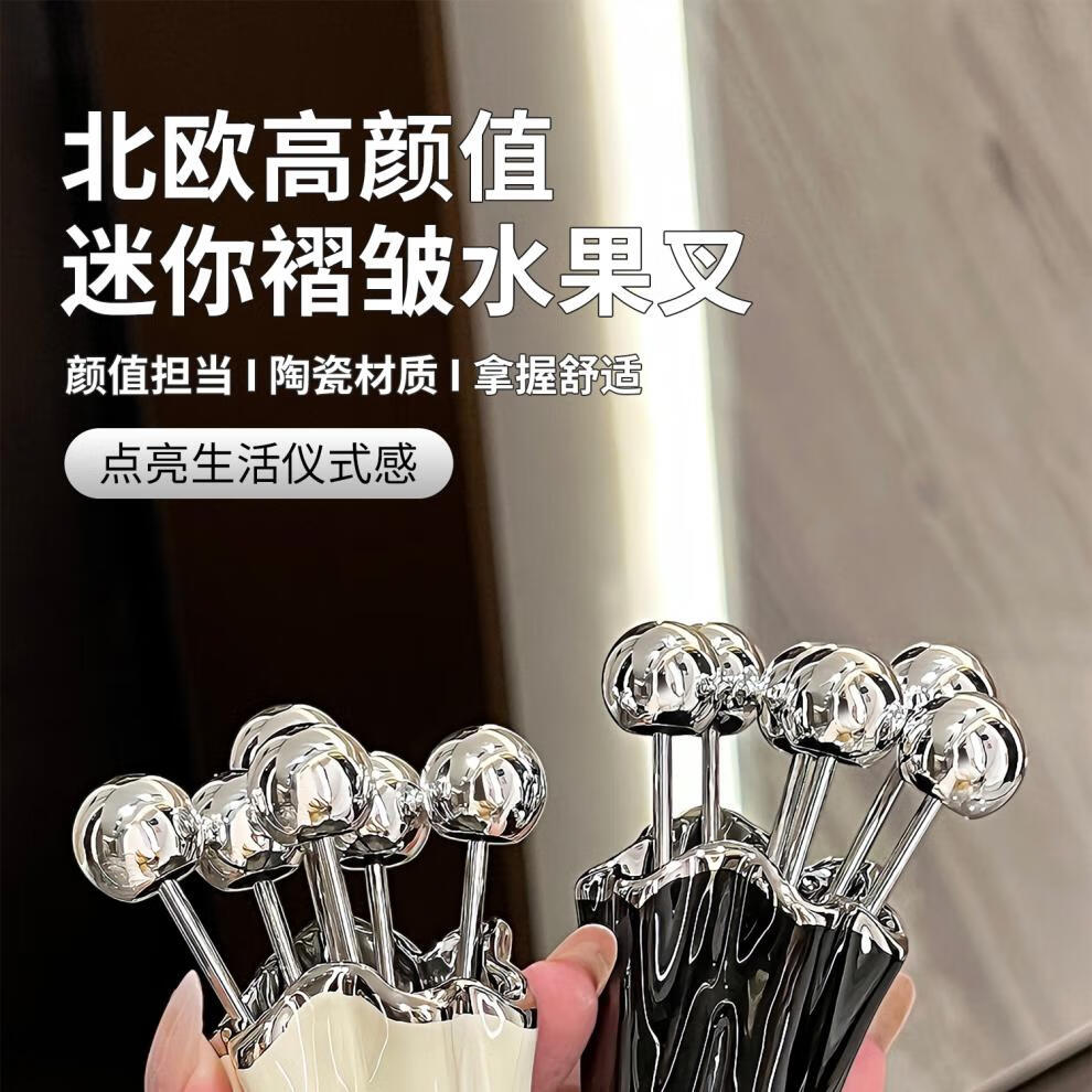 He Jiagong's high-looking stainless steel fruit fork household light luxury children's safety small fork set dessert pick sense mini pleated fruit fork + 6 small forks (milk white a