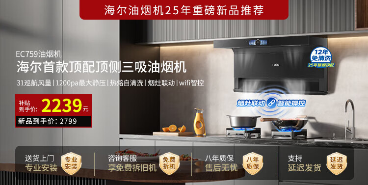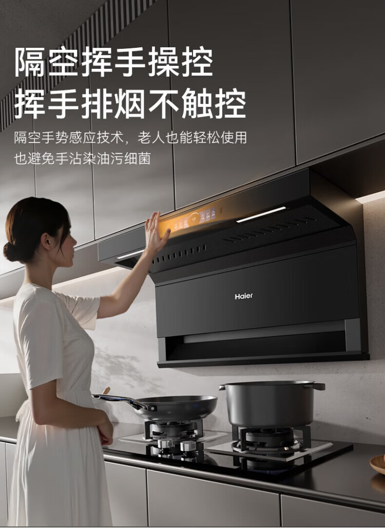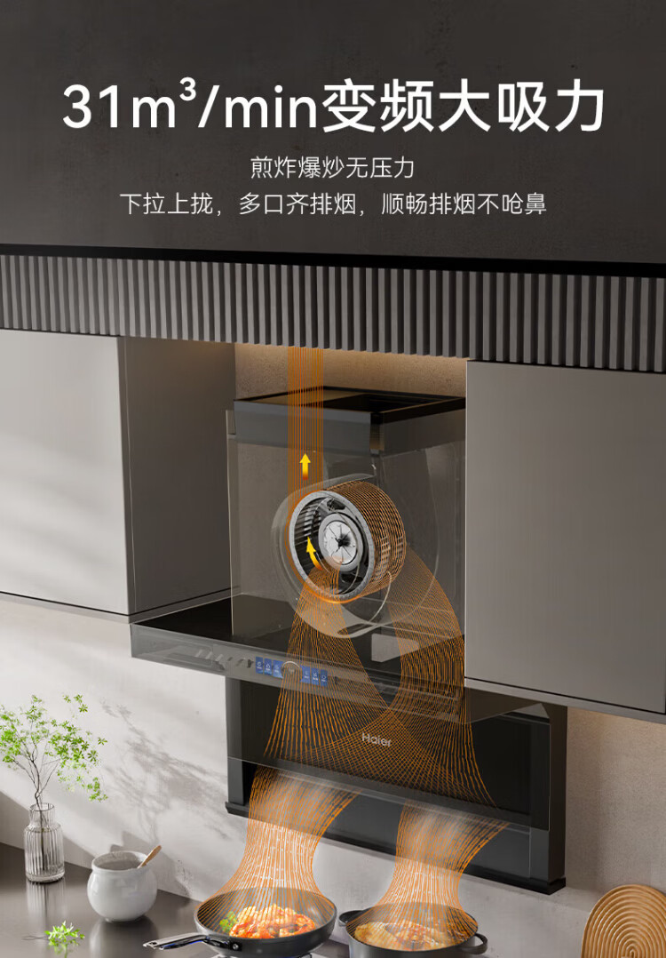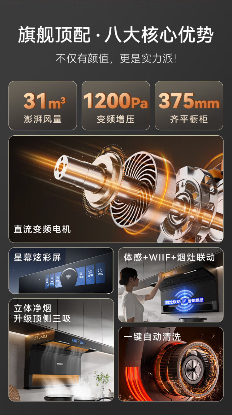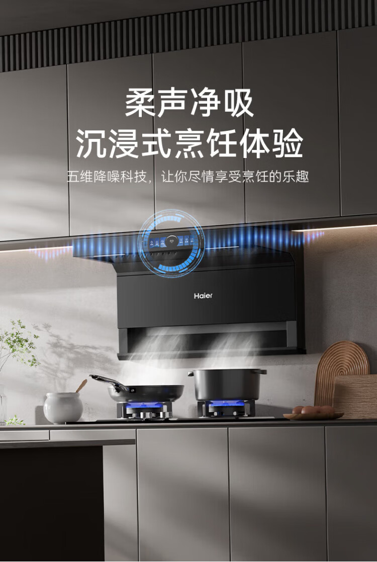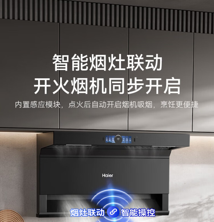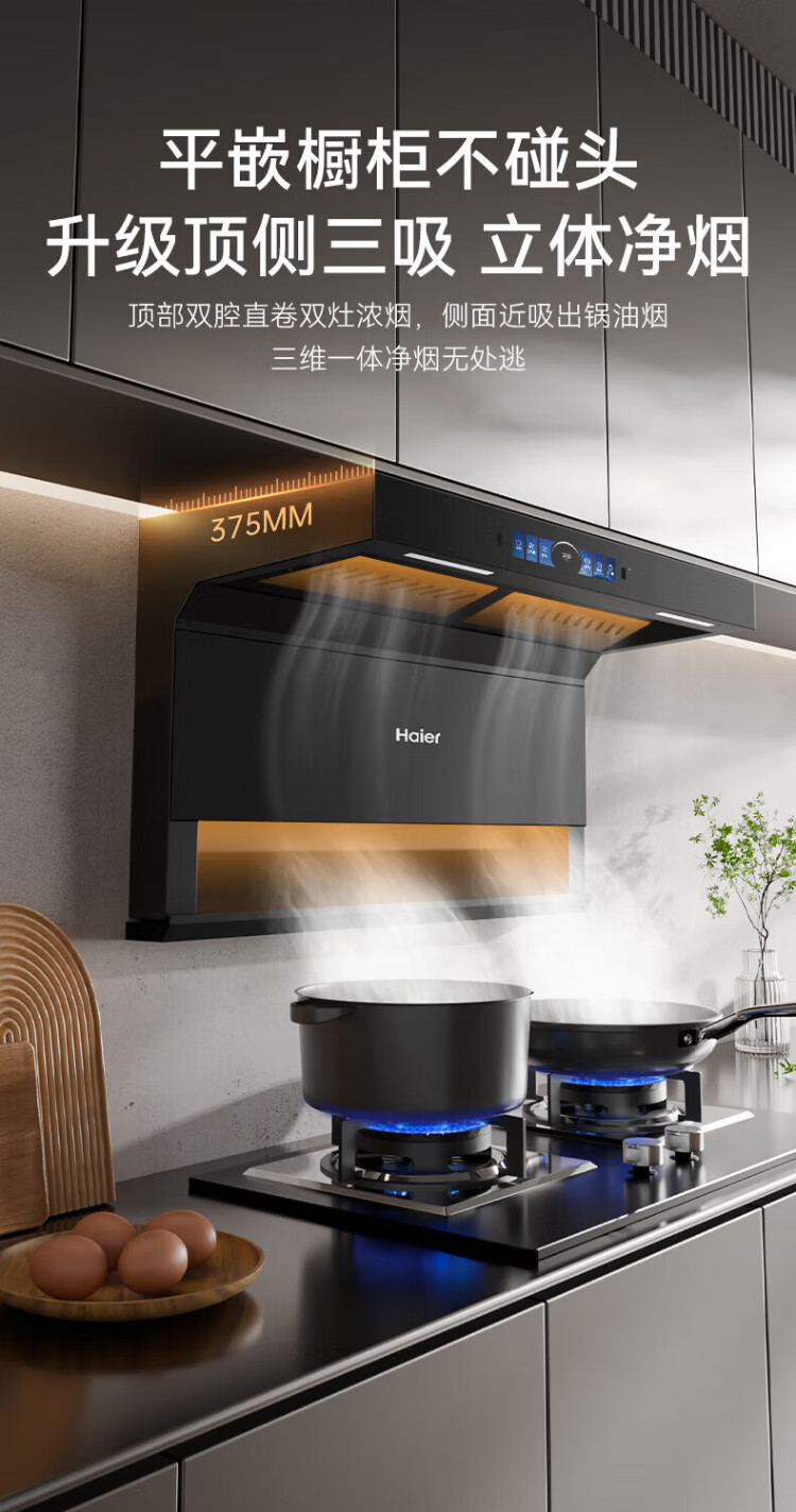 Haier variable frequency range hood 31 cubic meters large air volume suction gas stove set top side double three-suction kitchen two-piece set suction and exhauster hot melt self-cleaning 973 upgraded version 759 high-end 3-piece set hood + fierce fire stove + 16L first-class energy efficiency water servo
