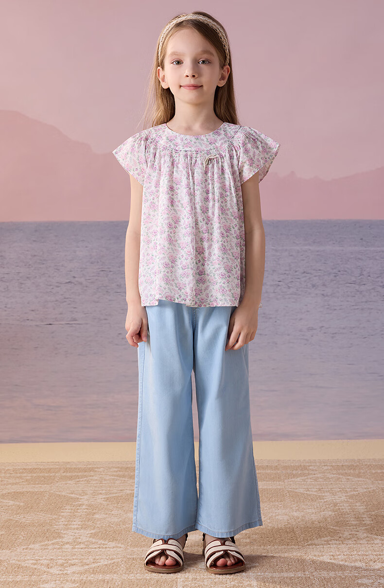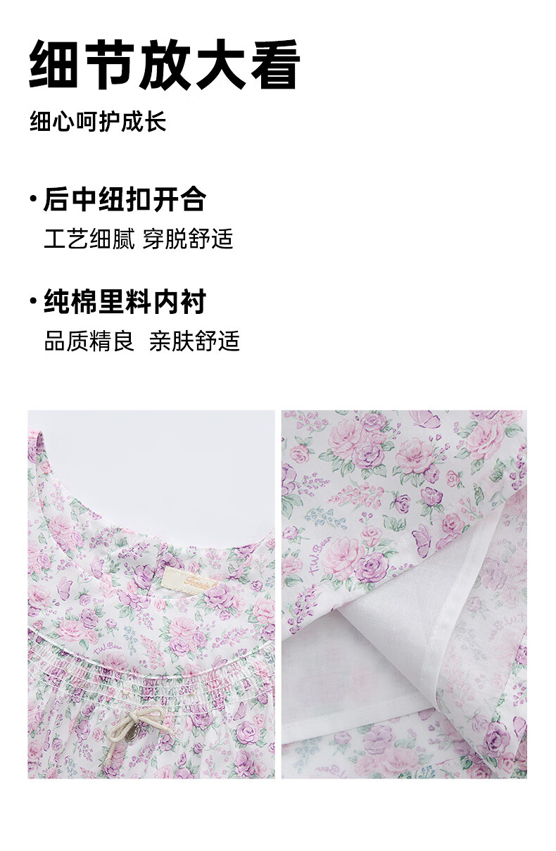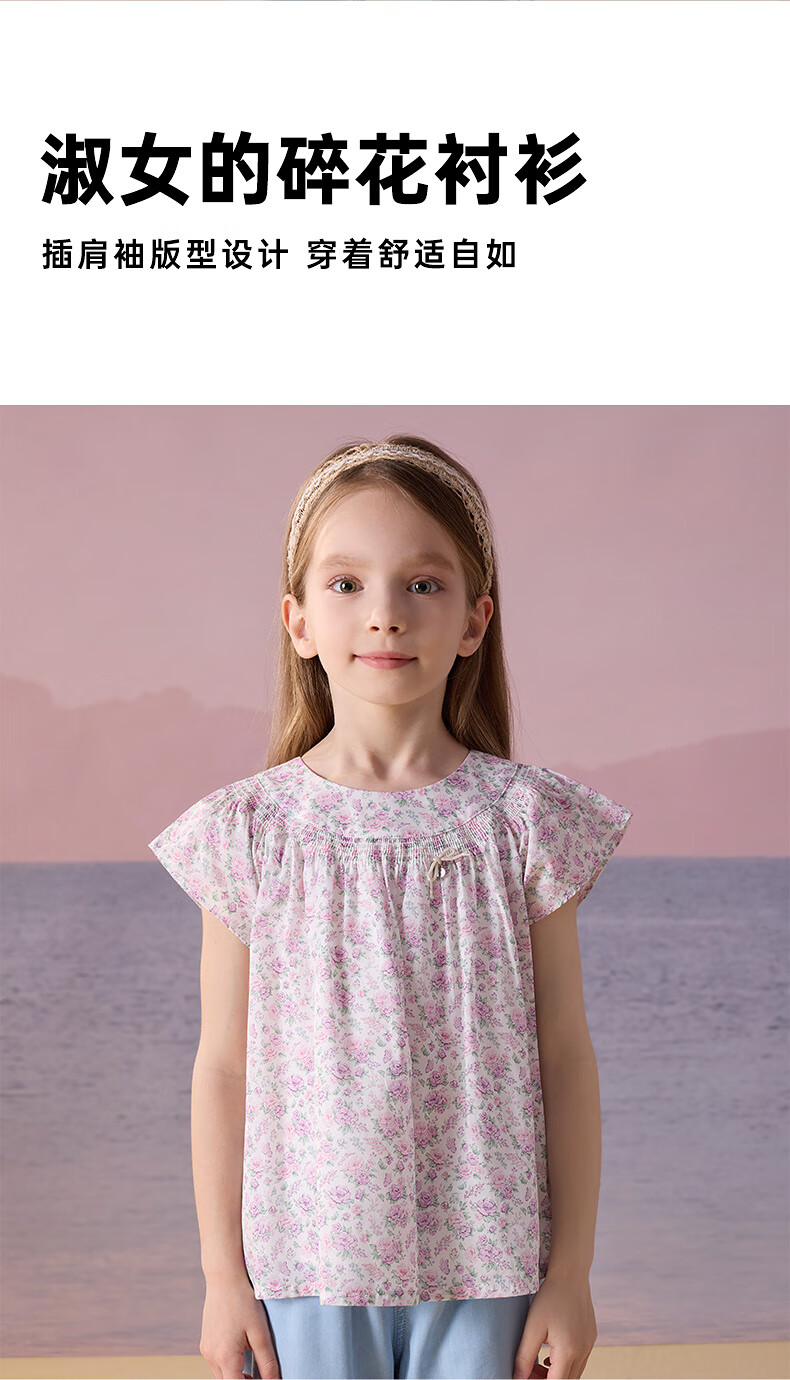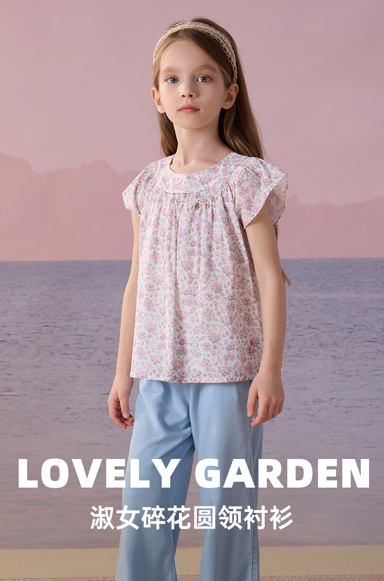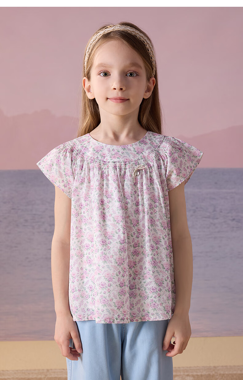 Teenie Weenie Kids Little Bear Children's Clothes Girls' Sweet Floral Round Neck Short-Sleeved Shirt Light Purple 160 cm