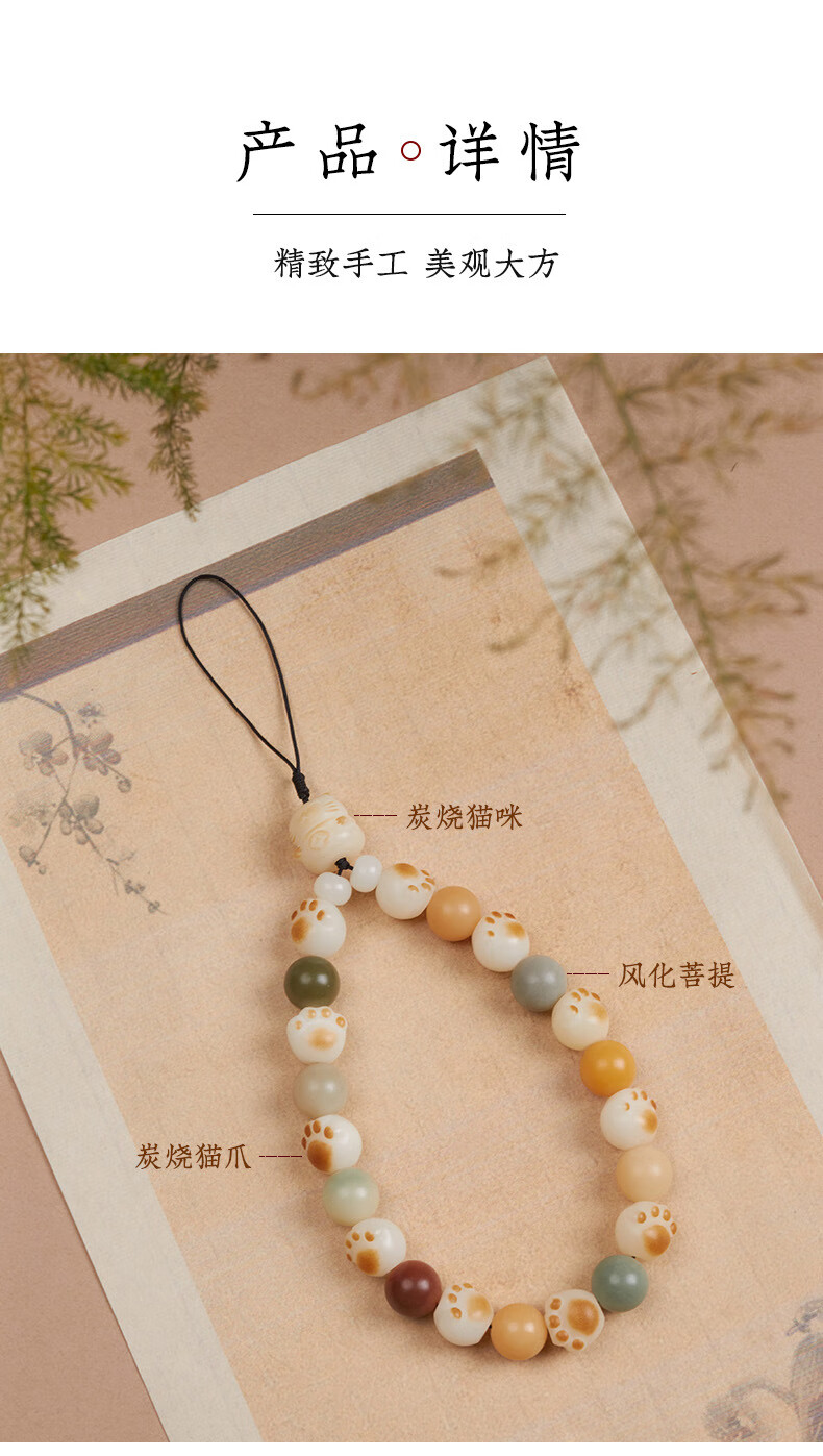 Jiuhuashan White Jade Bodhi Bracelet Mobile Phone Chain Lanyard Wrist Pendant Toy Accessory Birthday Gift Practical for Girlfriend Charcoal-Burned Cat Claw Mobile Phone Chain