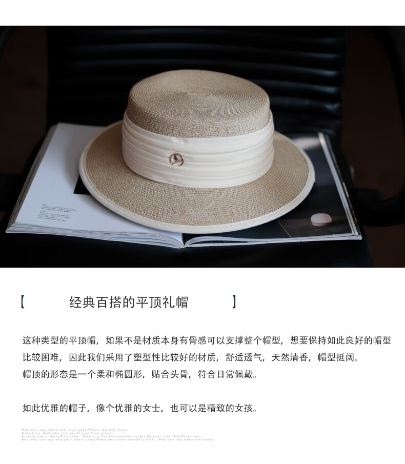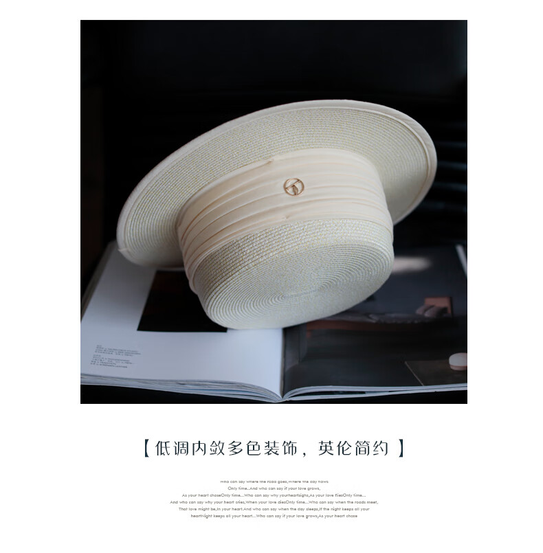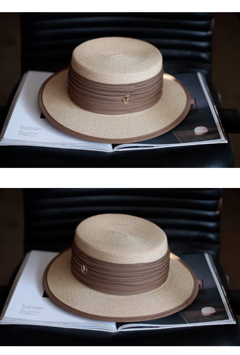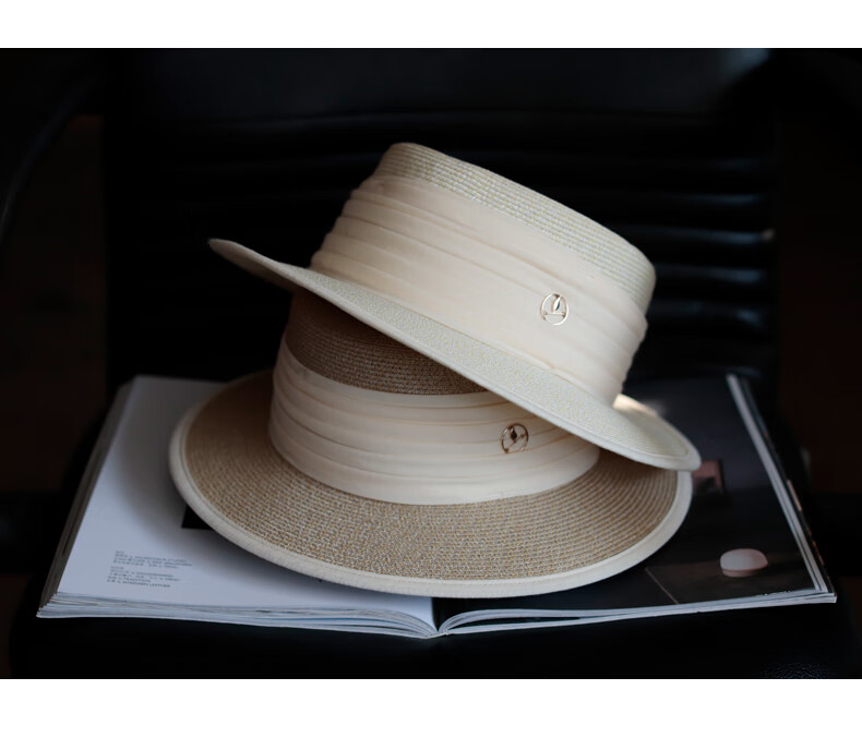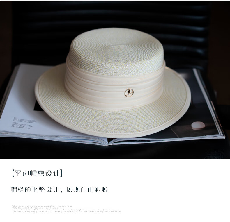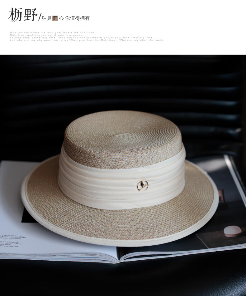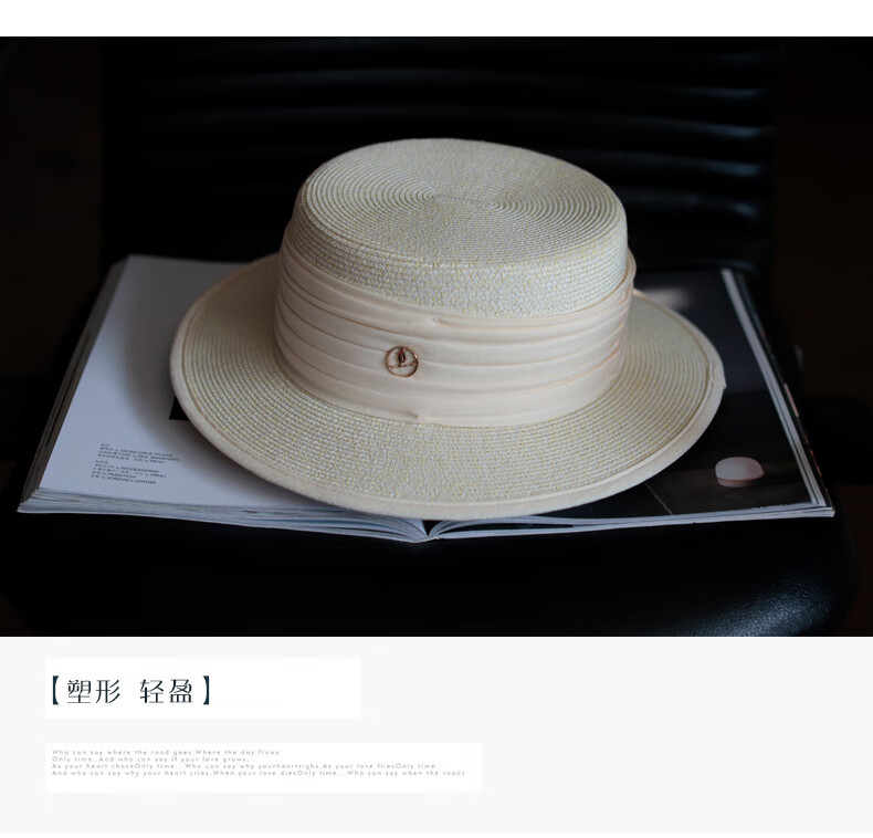 Tochino straw hat spring and summer new style French flat top small fresh wide brim sun hat pleated white sun protection sun hat beige rice belt M (56-58cm) one size fits all adjustable