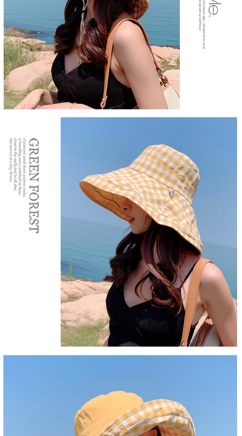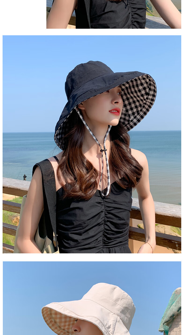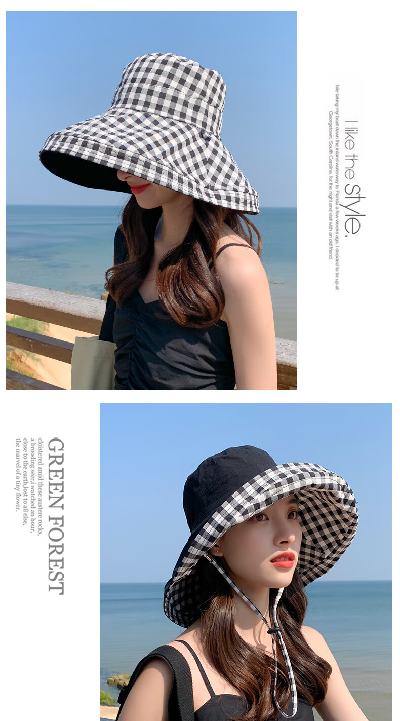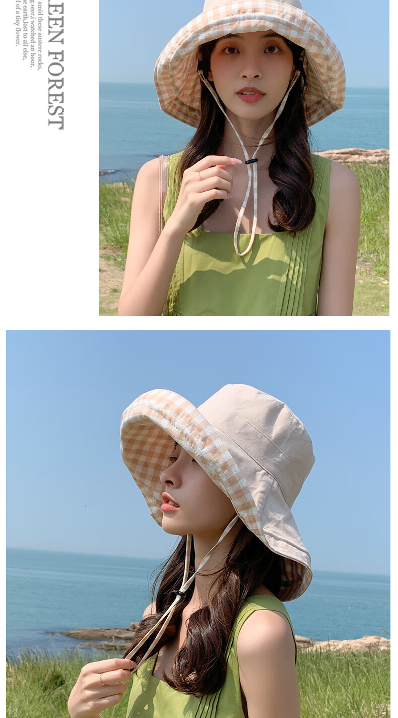 Woodpecker (TUCANO) double-sided plaid fisherman hat for women, spring and summer foldable sun visor, large brim sun hat to cover face, Korean version, trendy, khaki, double-sided (55-60cm)