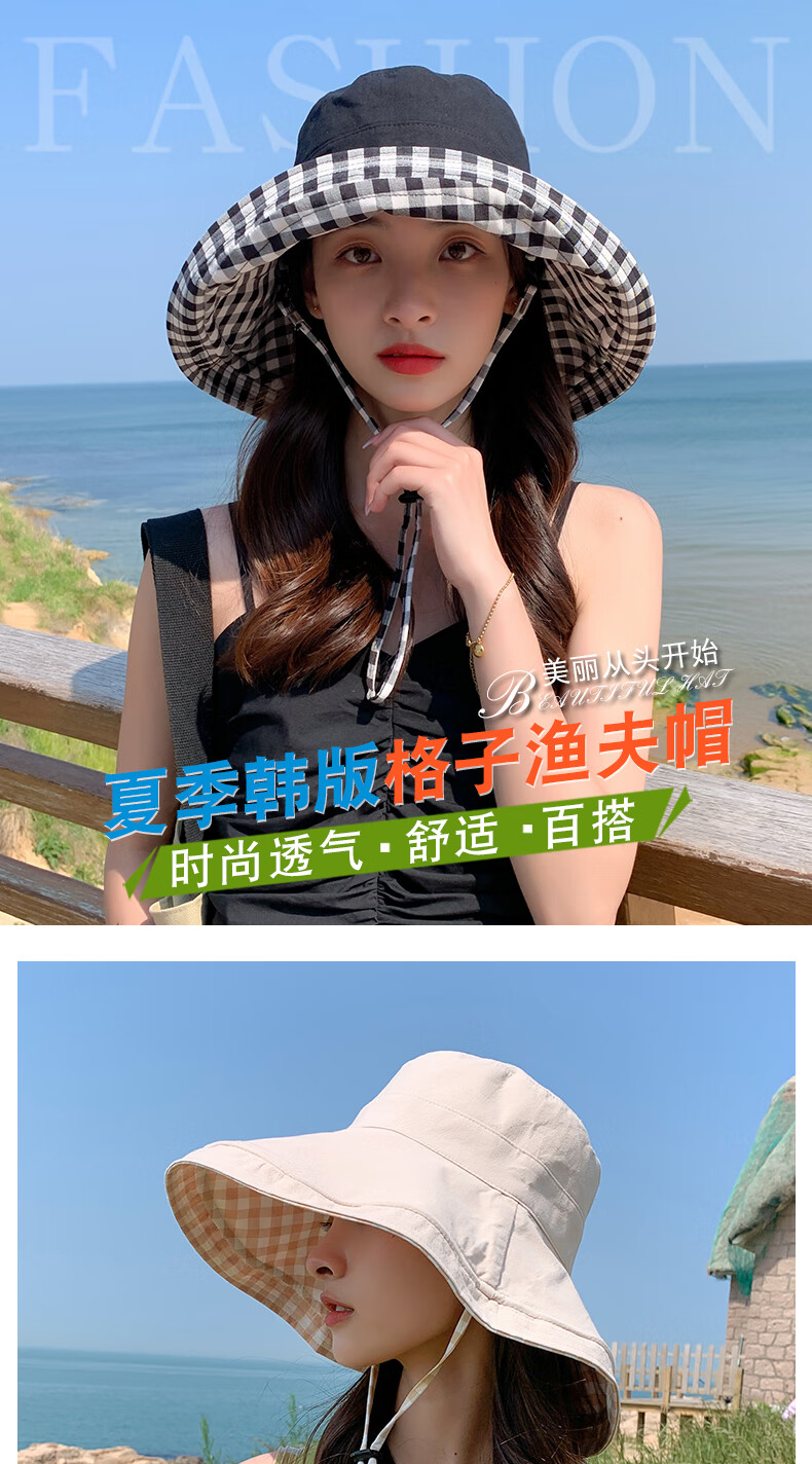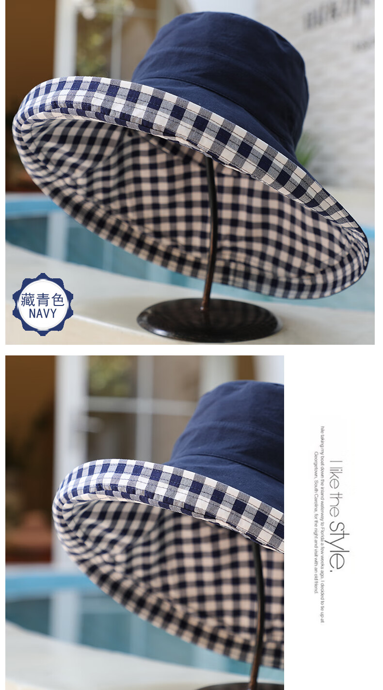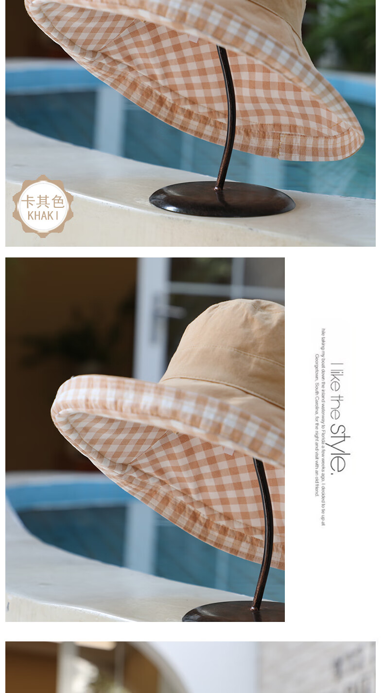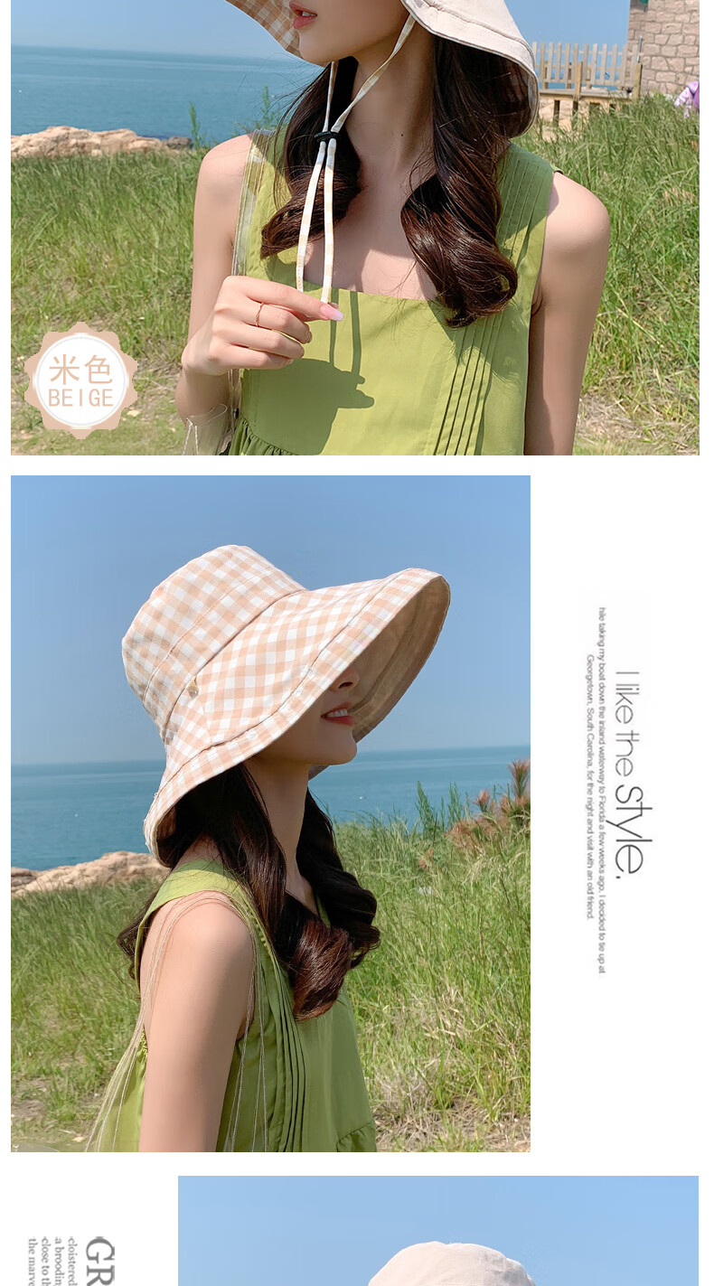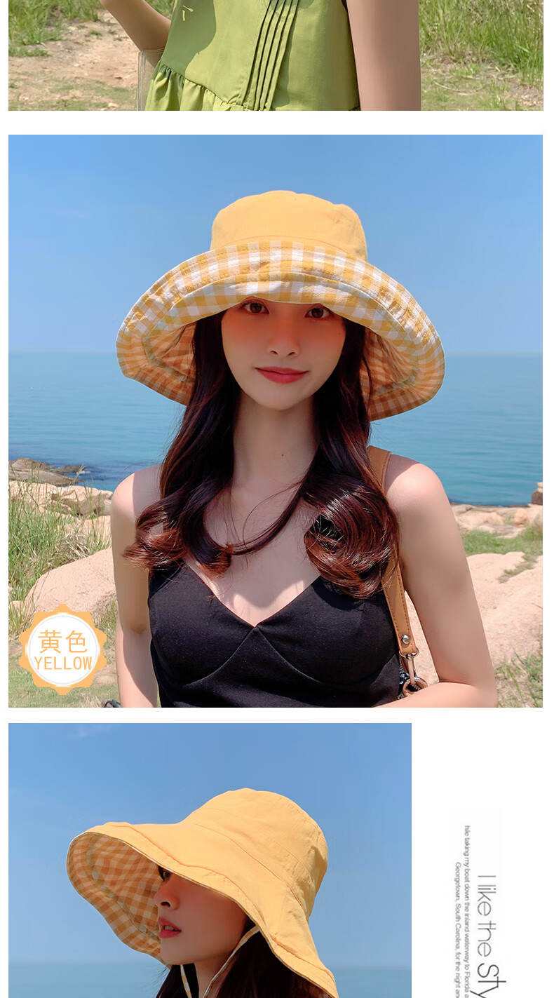 Woodpecker (TUCANO) double-sided plaid fisherman hat for women, spring and summer foldable sun visor, large brim sun hat to cover face, Korean version, trendy, khaki, double-sided (55-60cm)