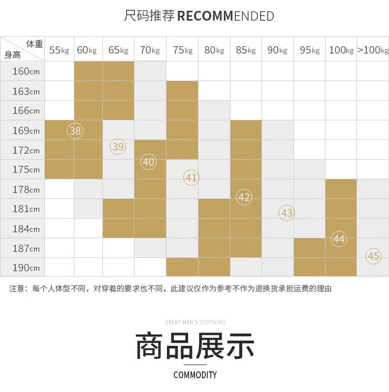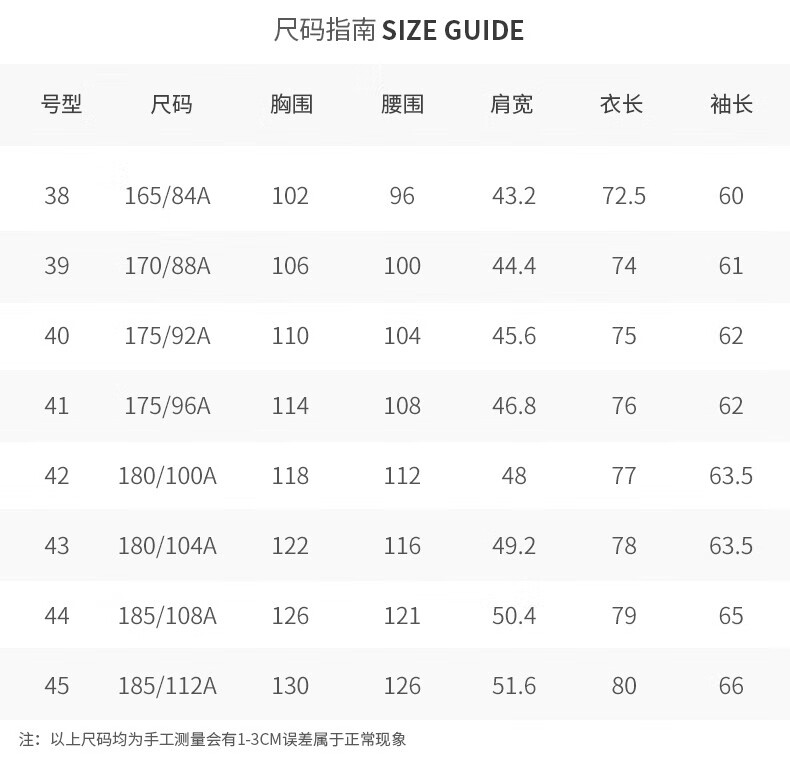 China (cm) 165 / 88-90 170 / 96-98 175 / 108-110 180 / 118-122 185 / 126-130