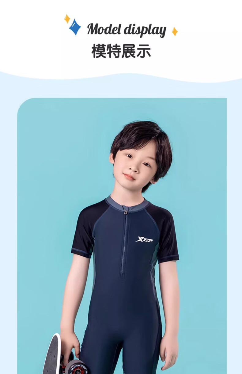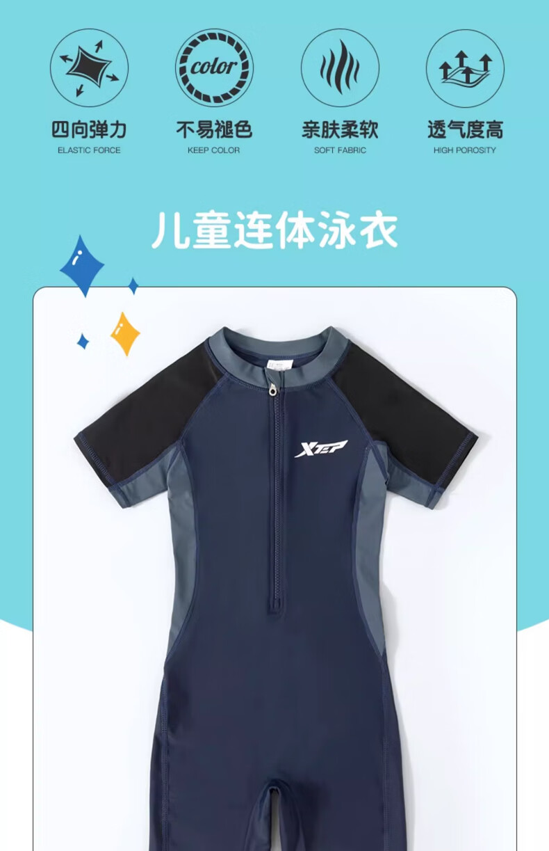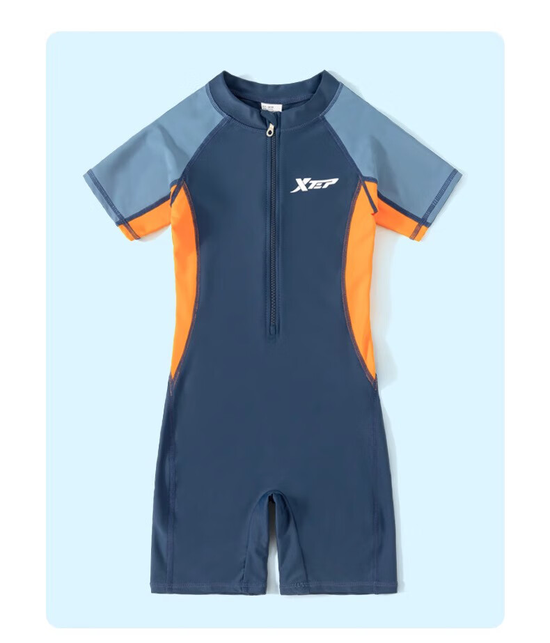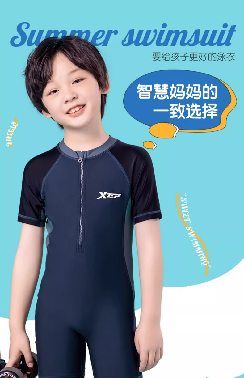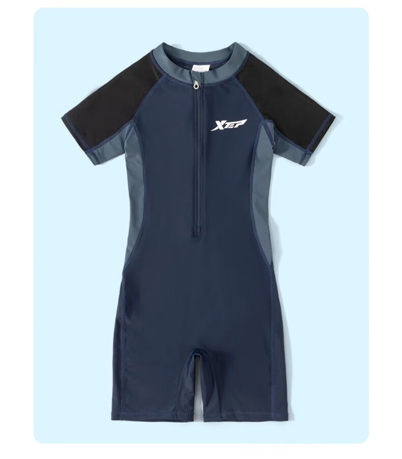 Xtep Children's Swimsuit Boys 2025 New One-piece Sunscreen Baby Swimming Pants Professional Swimming Training Boys Swimwear Gray Blue One-piece Size 125/14 (recommended height 125-135cm)