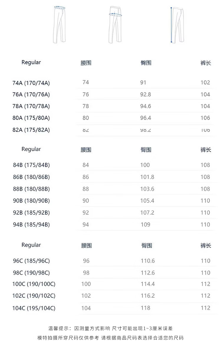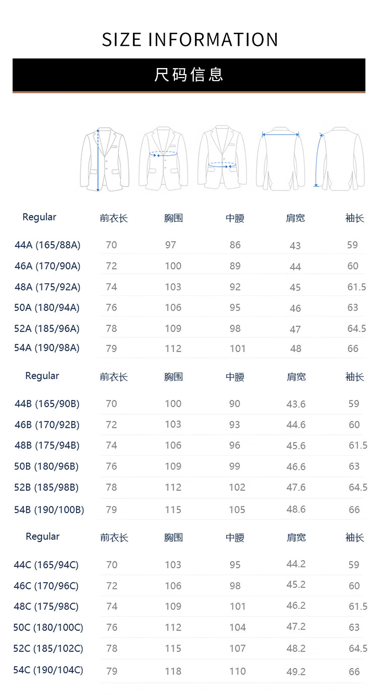 China (cm) 160-165/84-86 165-170 / 88-90 167-172 / 92-96 168-173 / 98-102 170-176 / 106-110