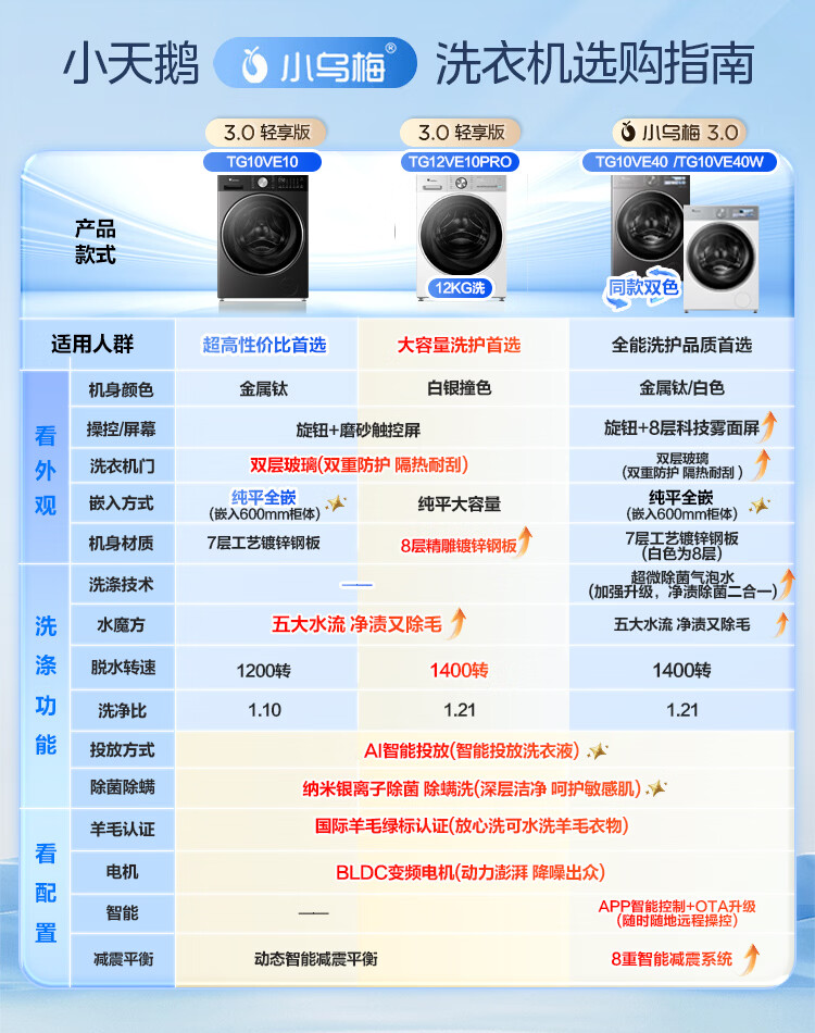 小天鹅(LittleSwan)12公斤滚筒洗衣机全自动家用纯平全嵌大容量净屑除毛一级能效补贴折扣 TG12VE10PRO【小乌梅3.0 轻享版】 滚筒