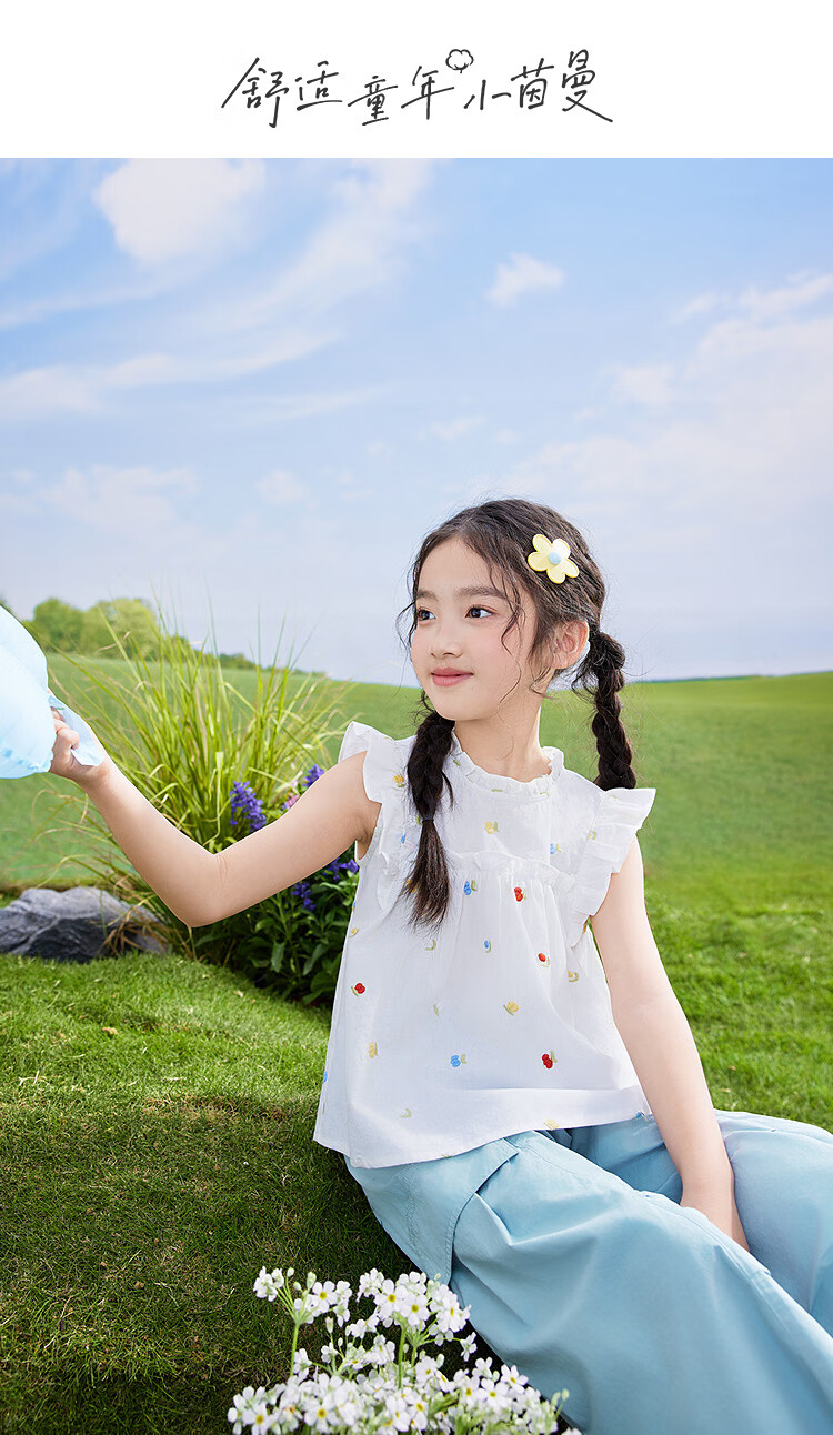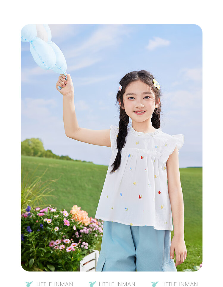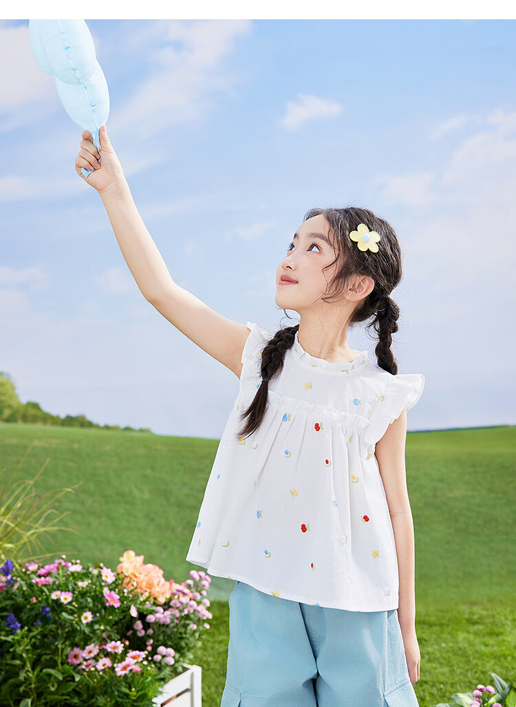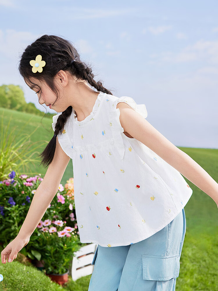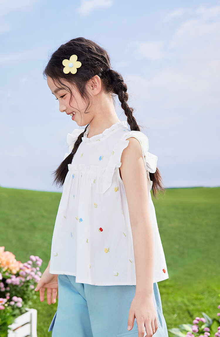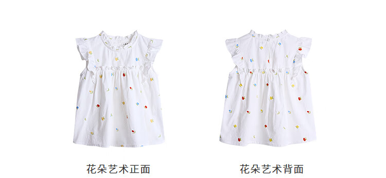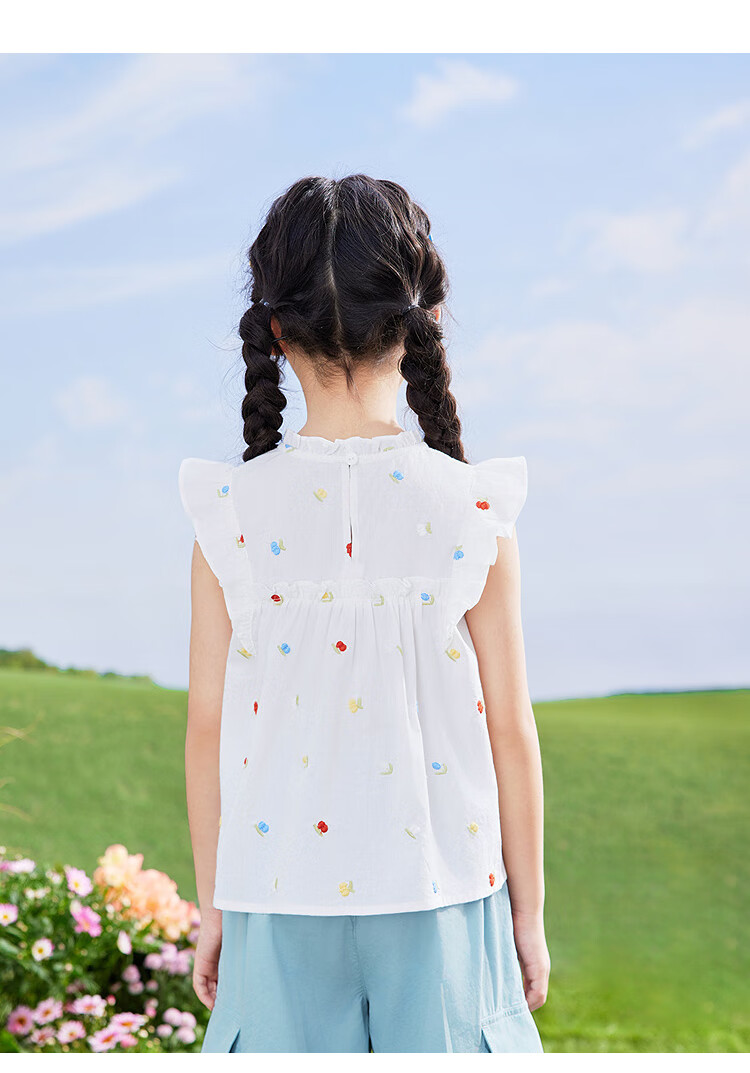 Xiaoyinman girls' shirt ruffled small flying sleeves summer children's middle and large children's fungus round neck casual top flower art 150