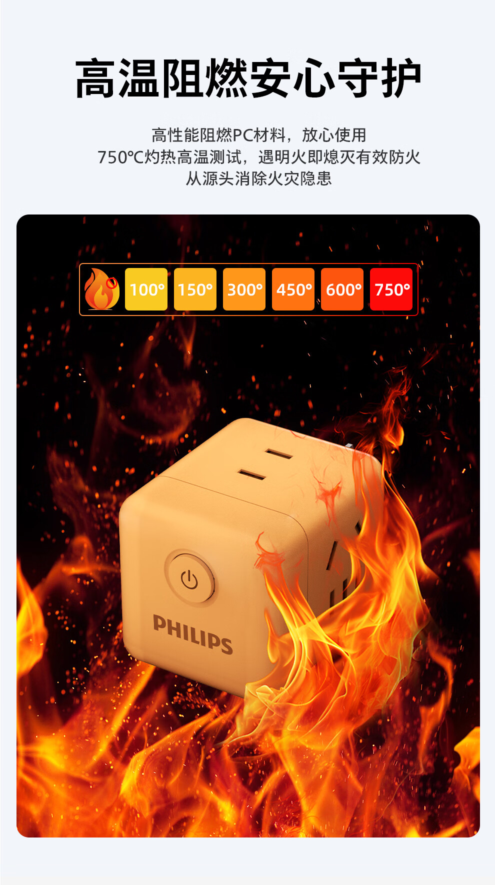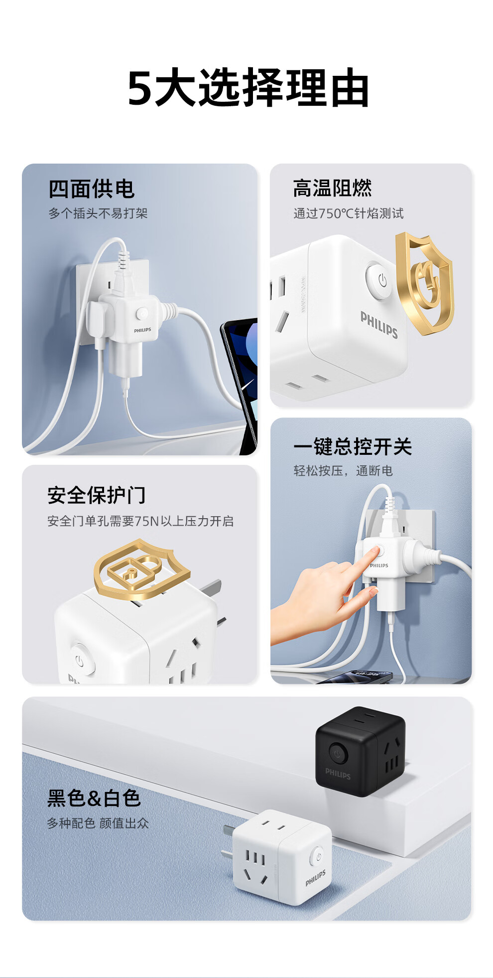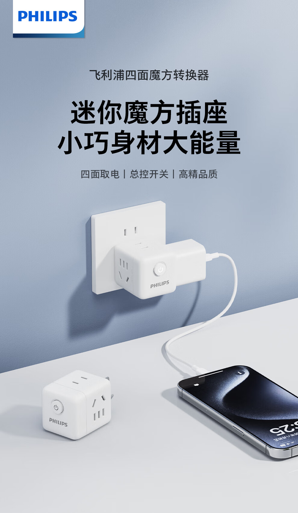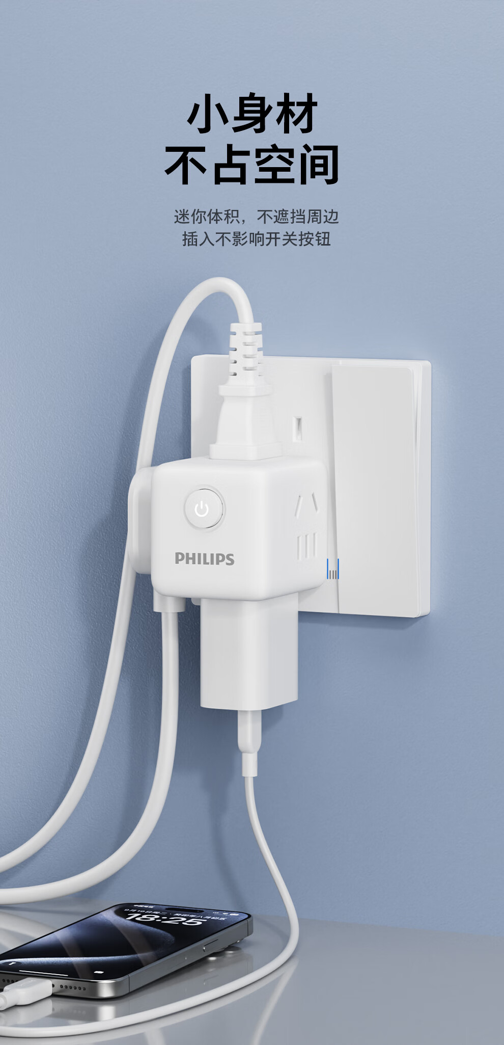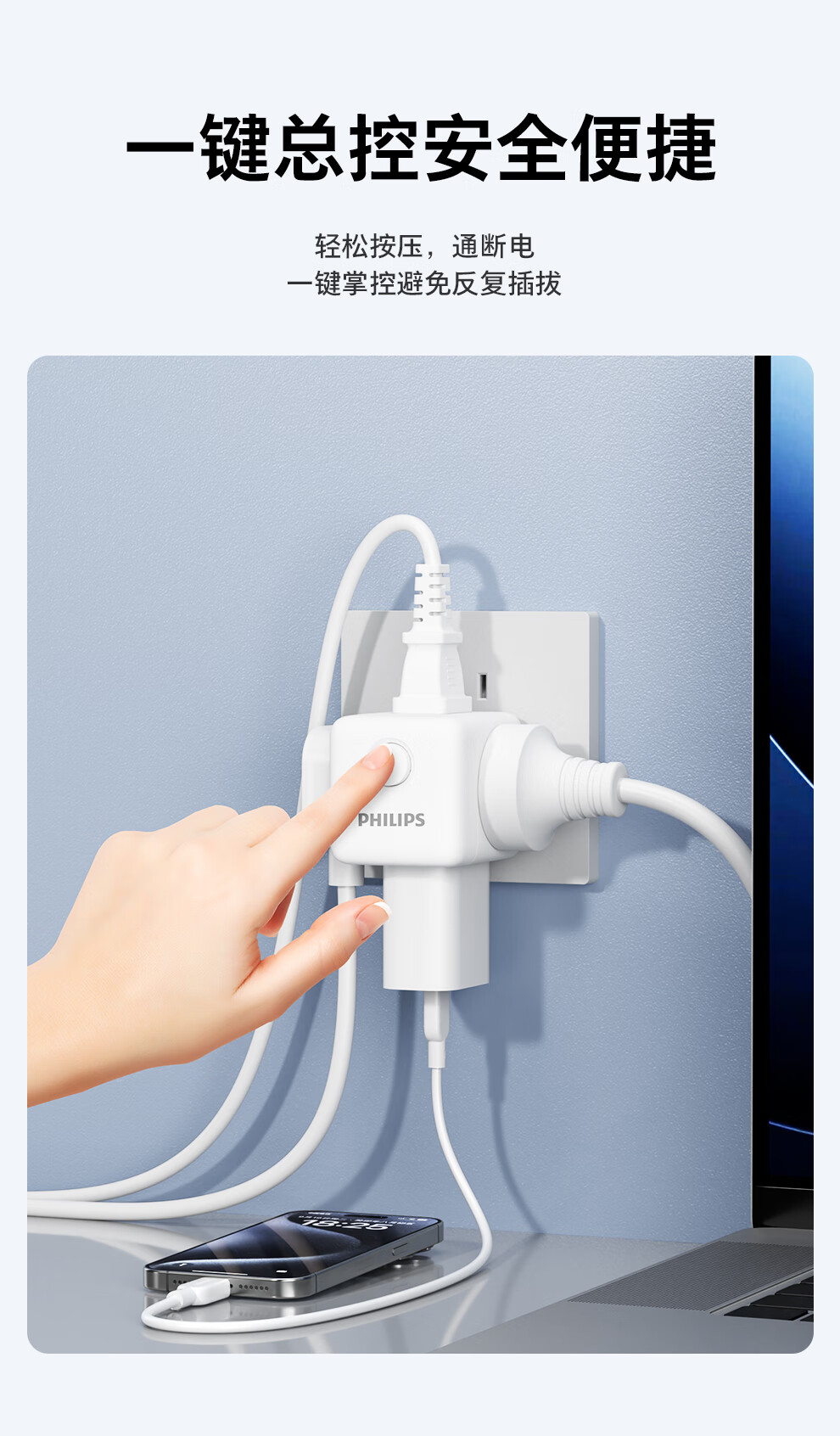 Philips (PHILIPS) socket conversion one-turn three-point control multi-functional extension conversion plug multi-head three-hole to two-hole household multi-hole power conversion socket three-pin to two-pin multi-purpose plug hot style one-turn 5 including Type-c