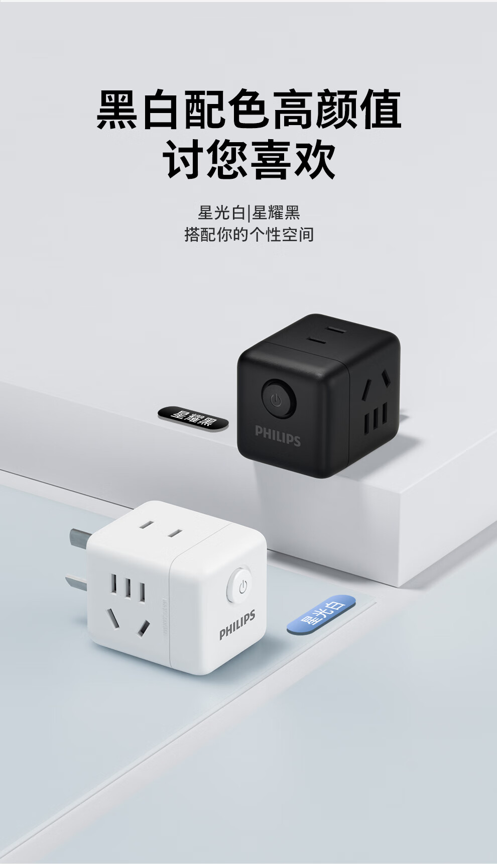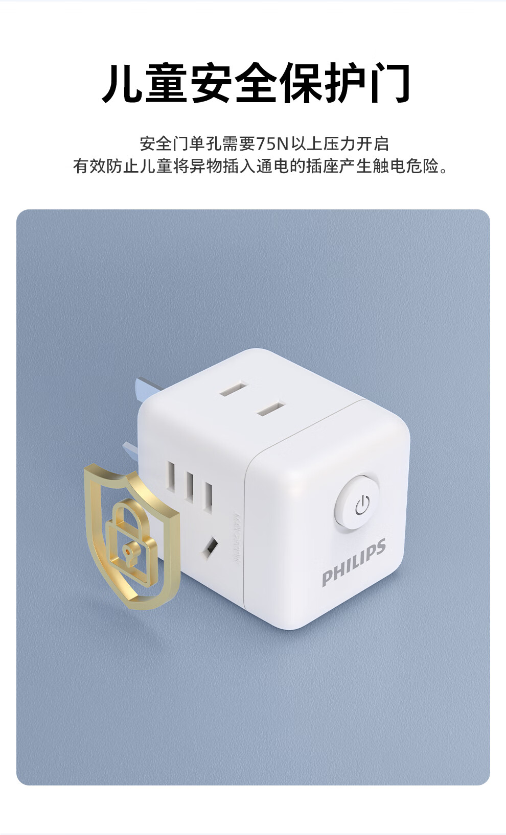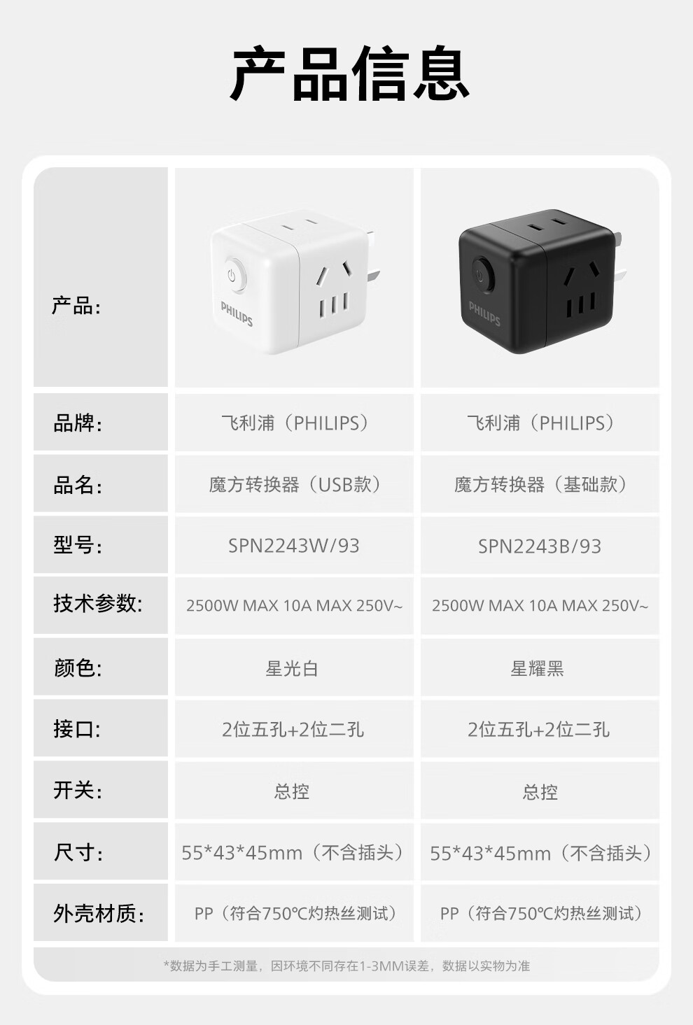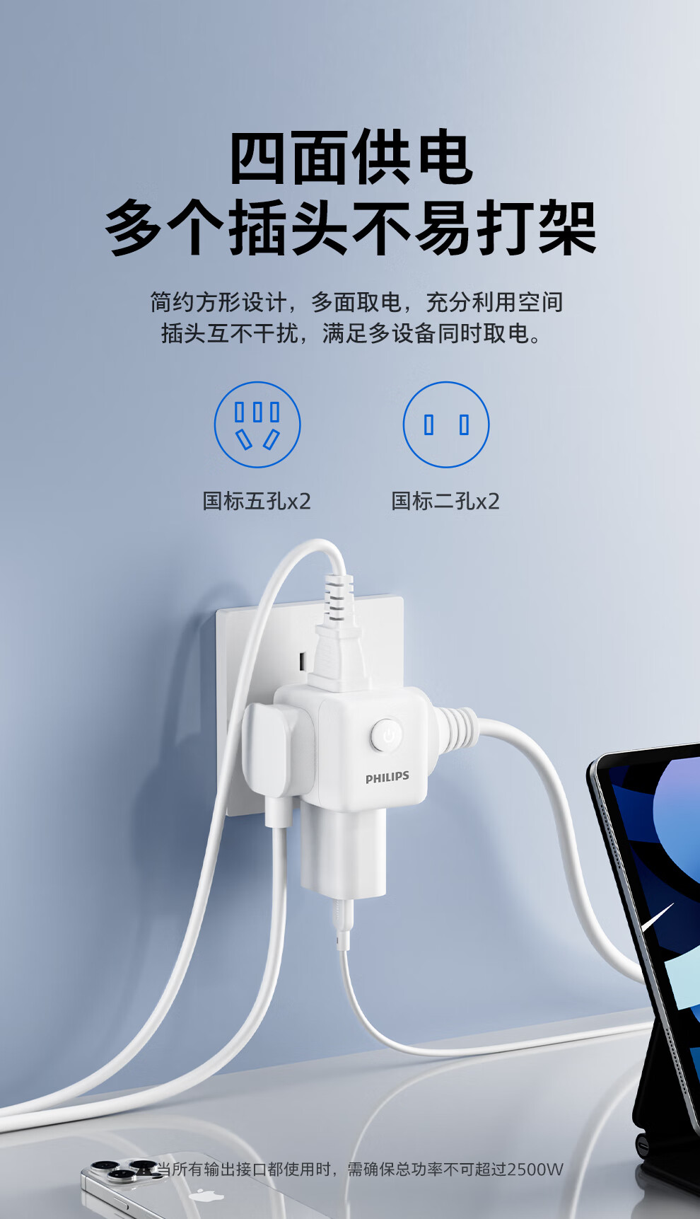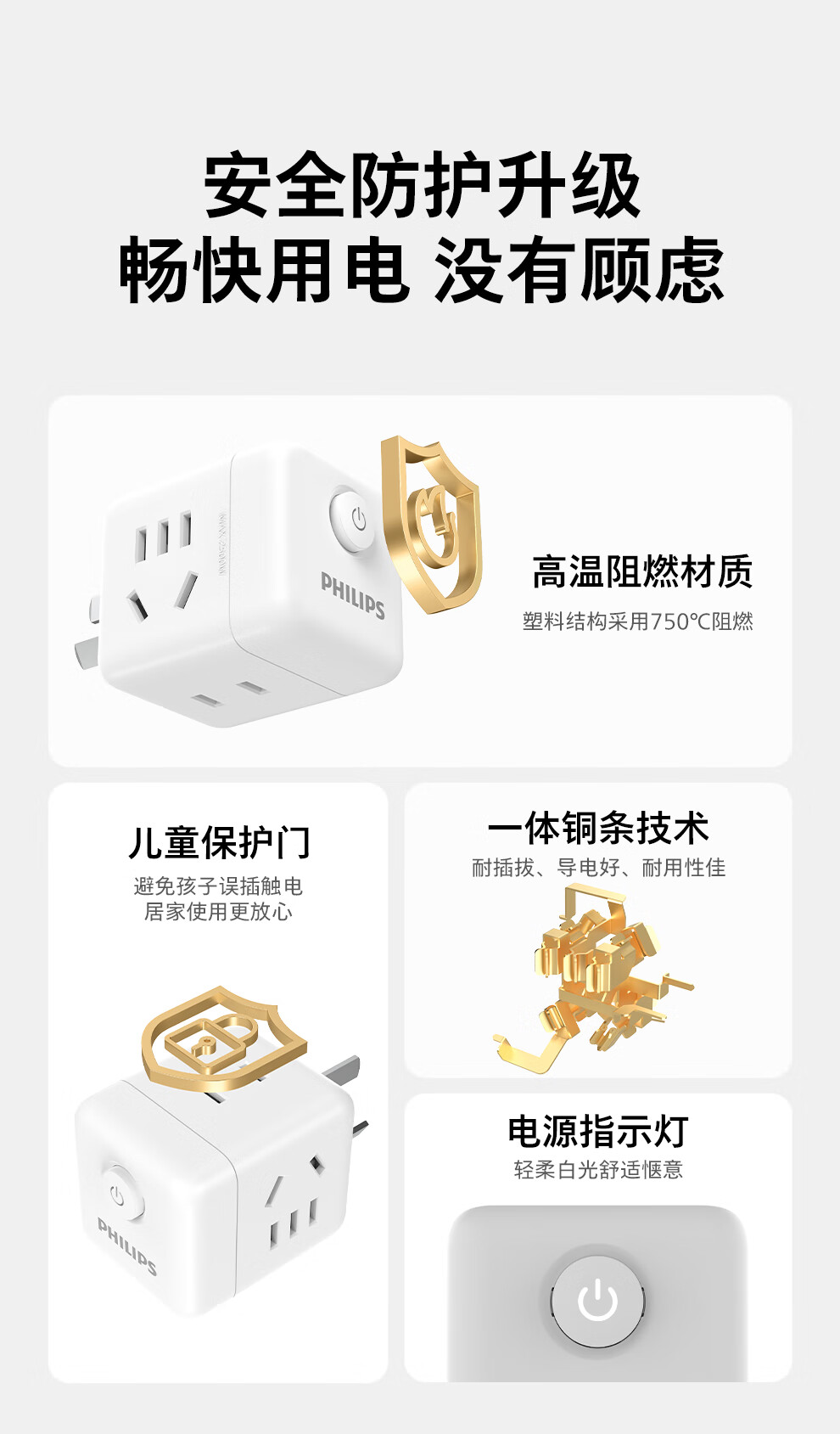 Philips (PHILIPS) socket conversion one-turn three-point control multi-functional extension conversion plug multi-head three-hole to two-hole household multi-hole power conversion socket three-pin to two-pin multi-purpose plug hot style one-turn 5 including Type-c