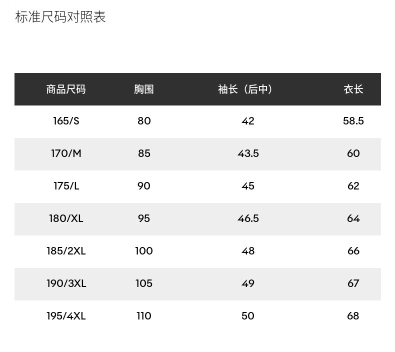 China (cm) 160-165/84-86 165-170 / 88-90 167-172 / 92-96 168-173 / 98-102 170-176 / 106-110