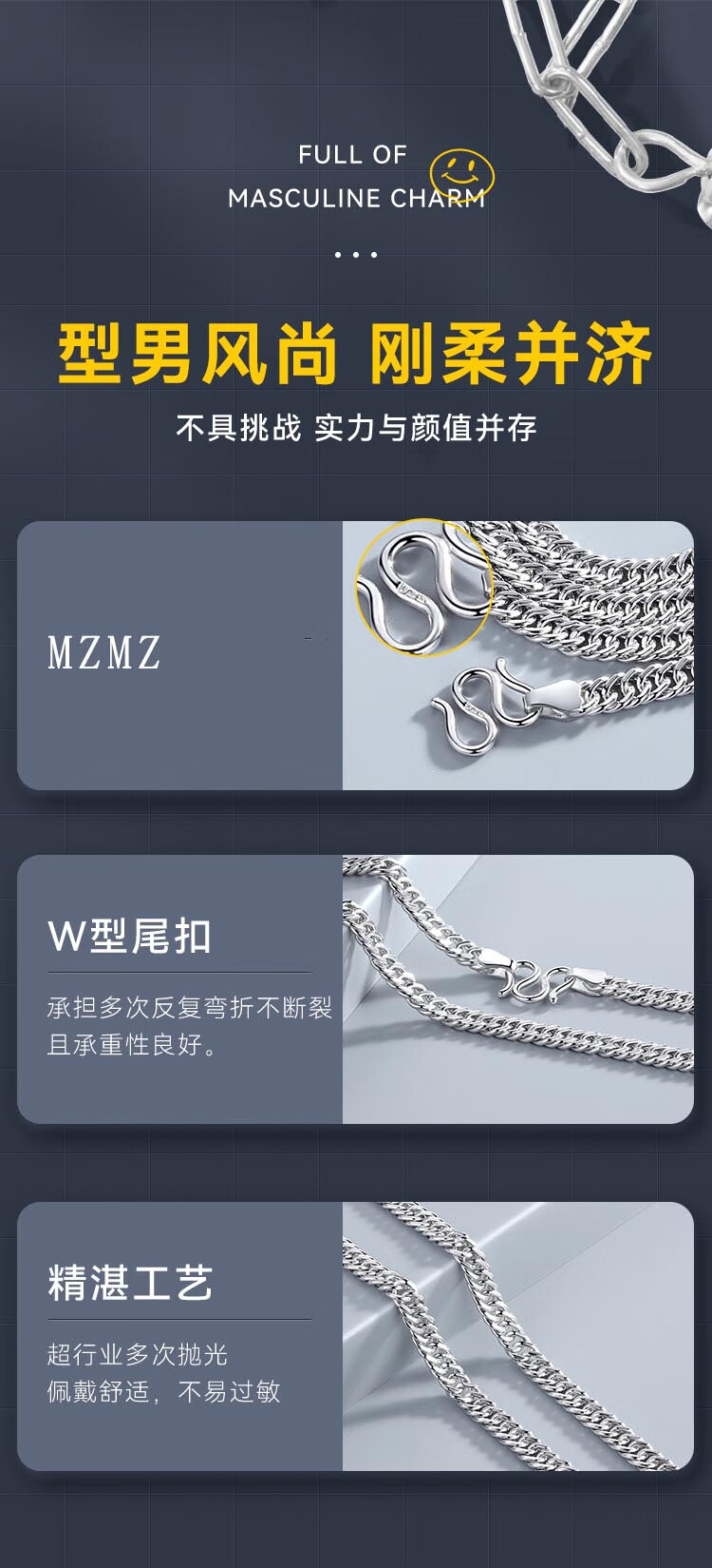 MZMZ platinum necklace men's pt950 platinum chain decorative trendy accessories Valentine's Day birthday gift for boyfriend and girlfriend Light luxury W buckle adjustment width 4mm chain length 50cm (gift box)