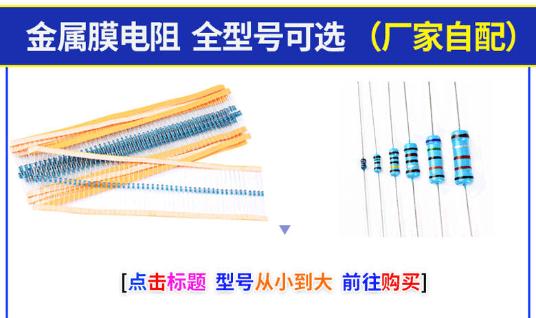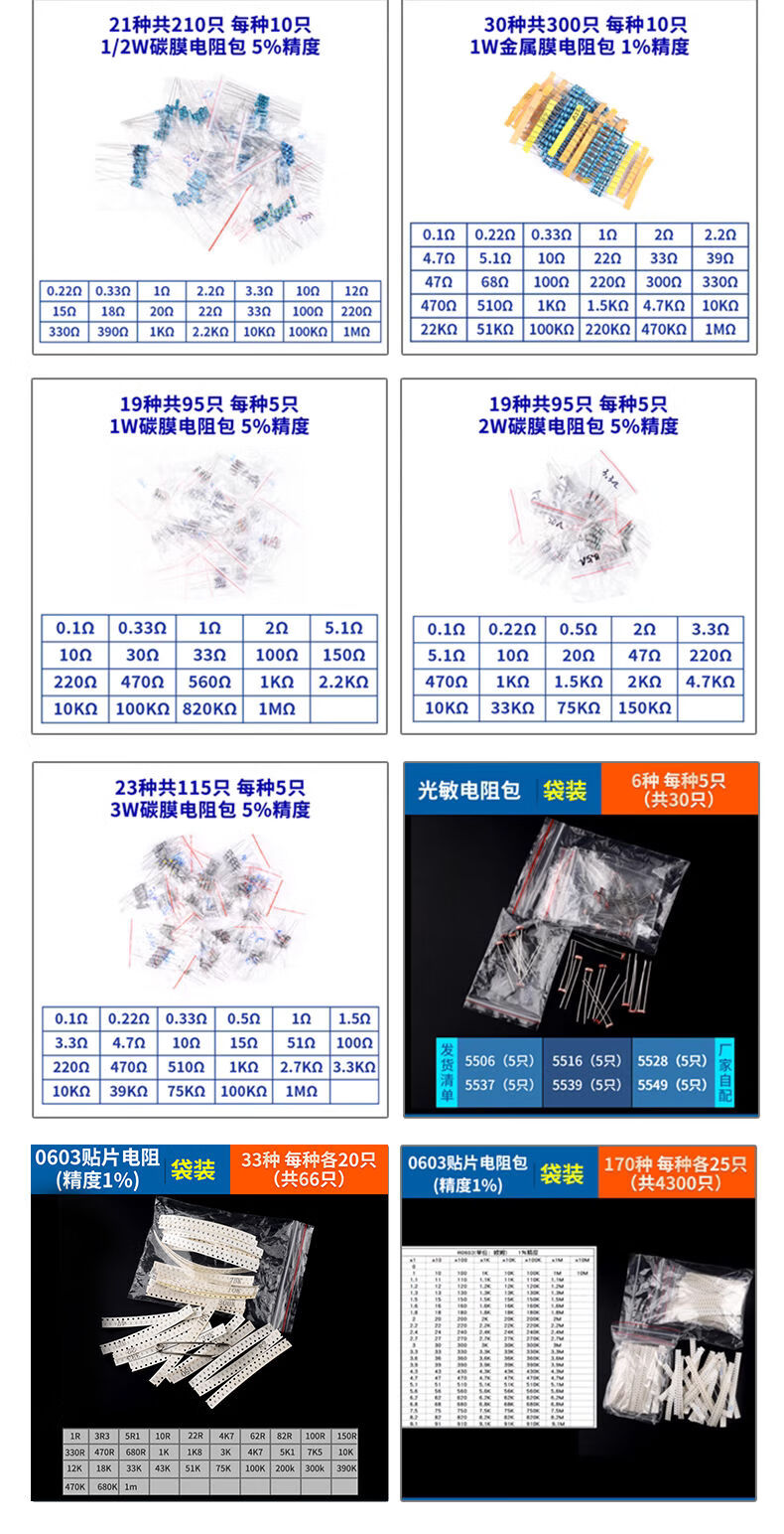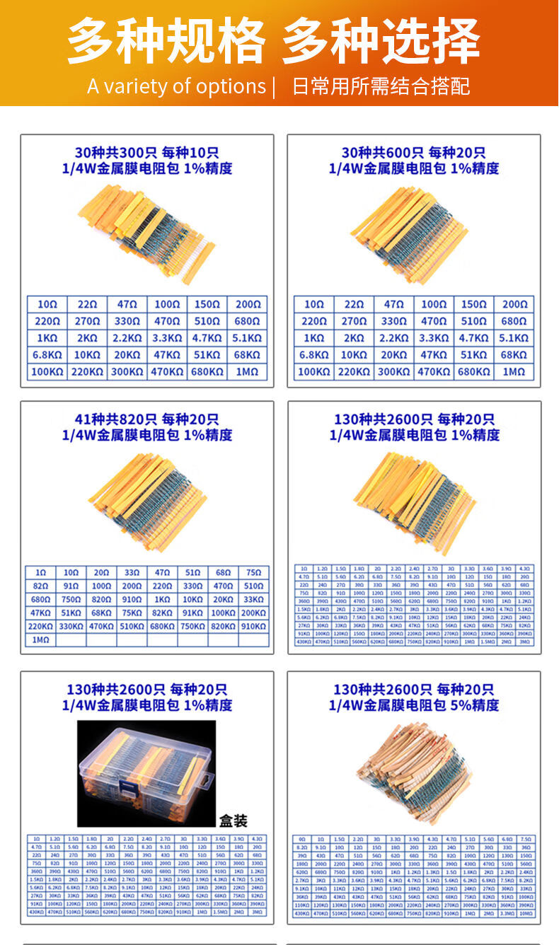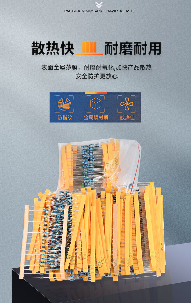1/4W metal film resistor pack 1/2W1W2W3W5W direct plug electronic component pack 30/41/130 kinds 1% commonly used 1/4W metal film 30 kinds 10 pieces each (boxed)