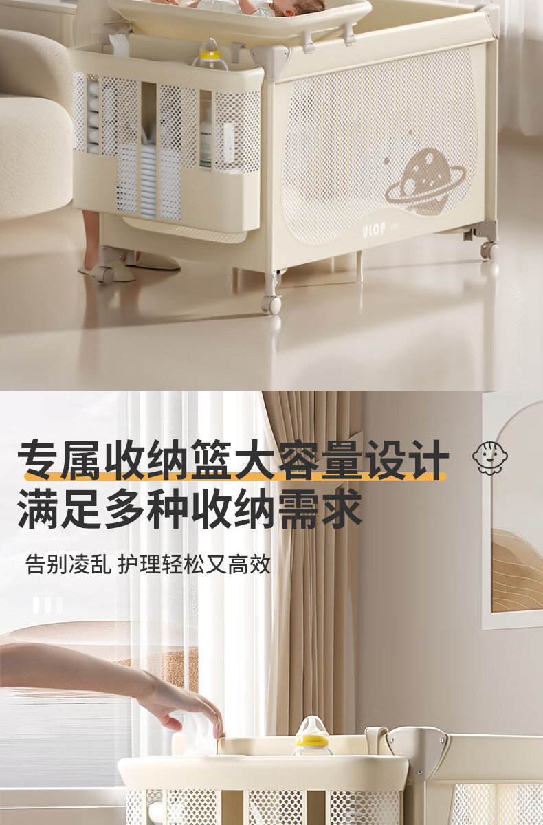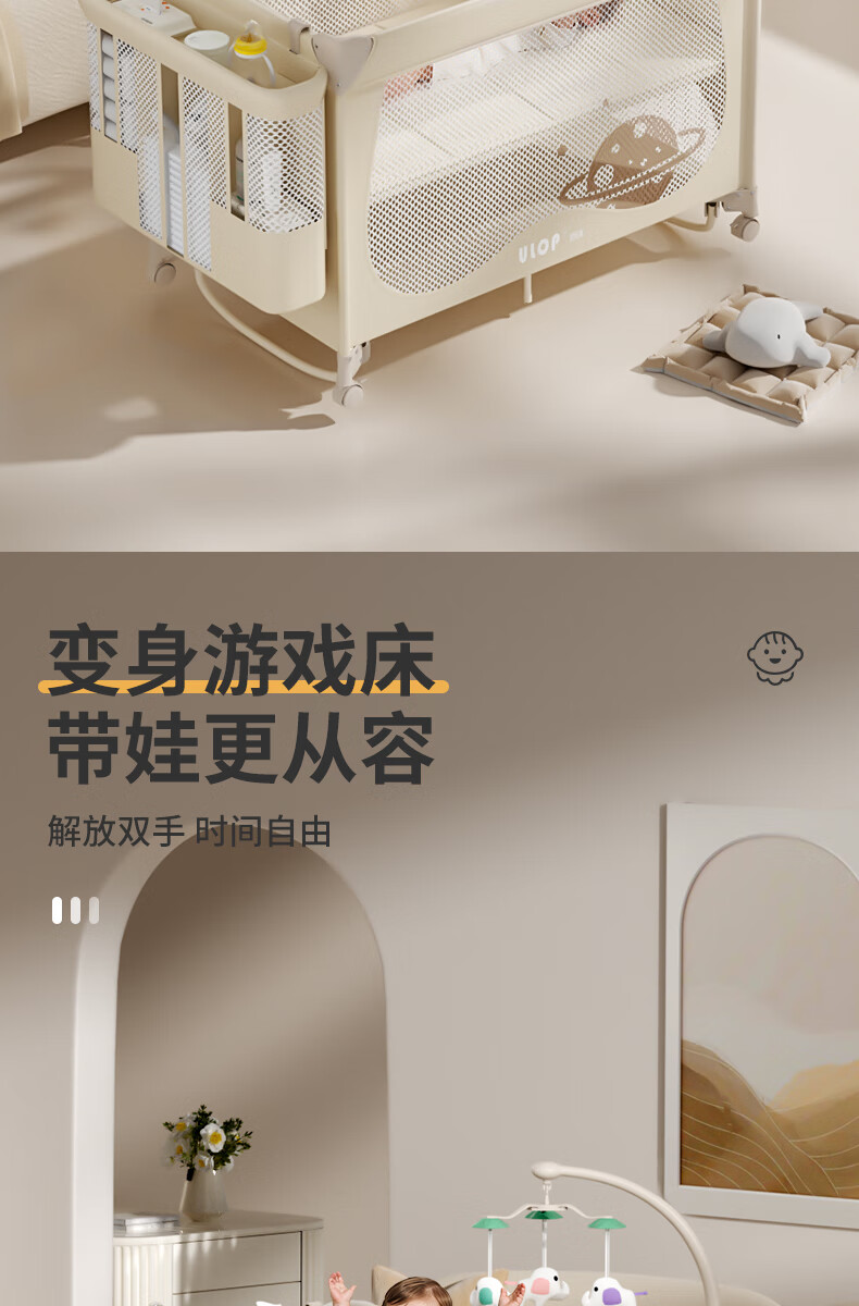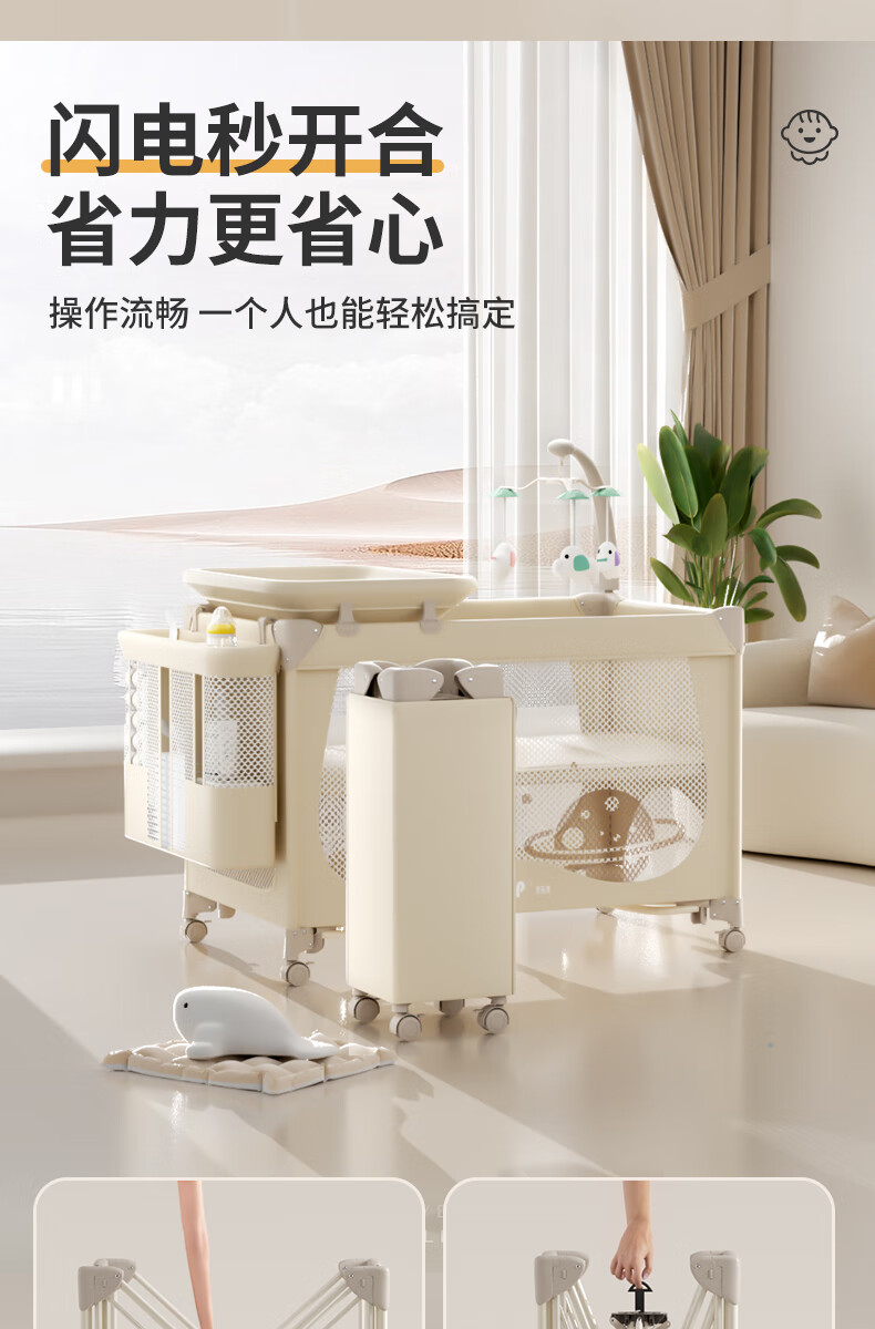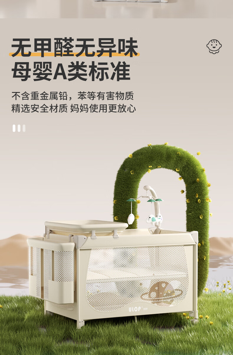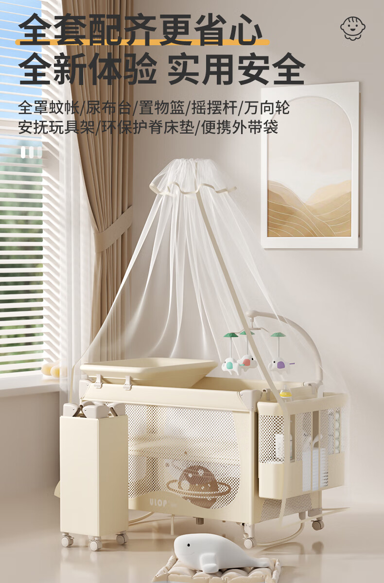 ULOP crib removable splicing crib multifunctional portable foldable baby bed with changing table mosquito net Yunmeng one-click folding baby rocking bed - light khaki baby supplies baby sleeping artifact