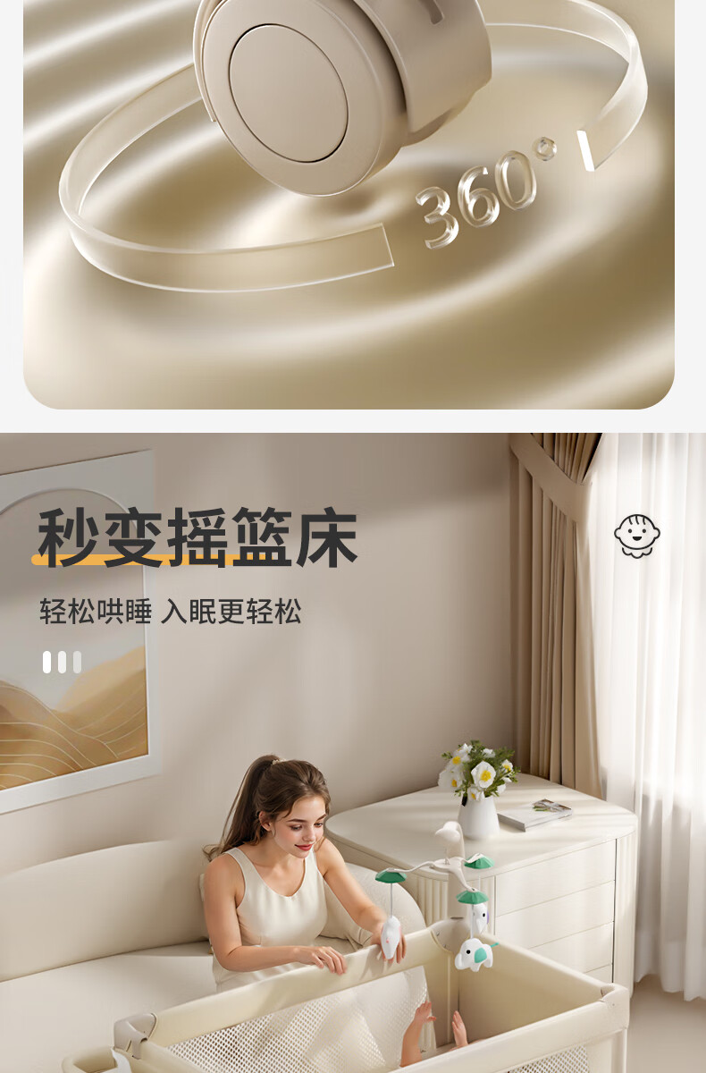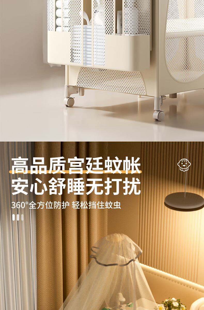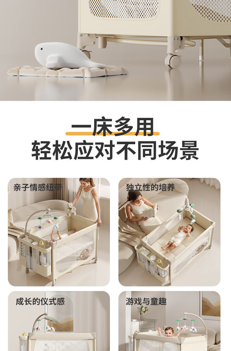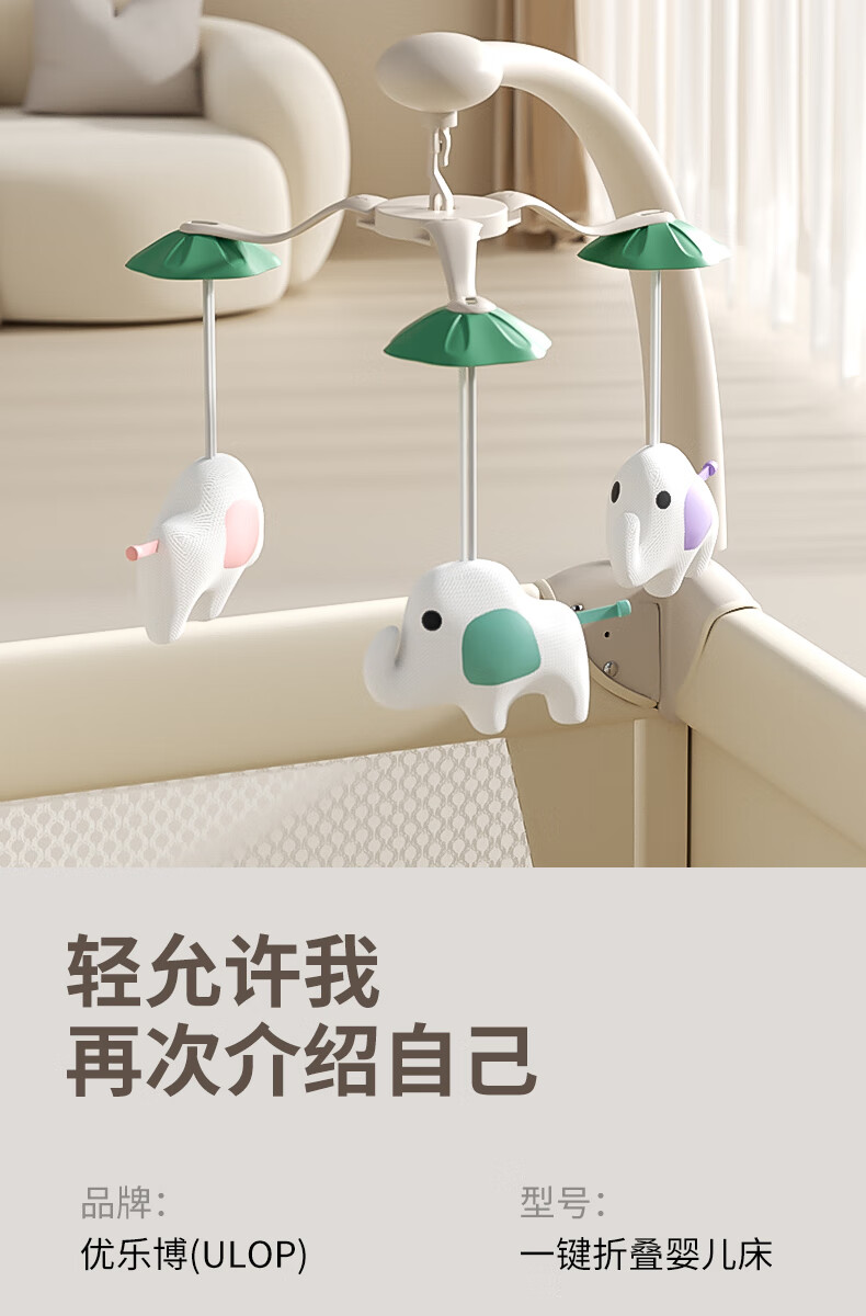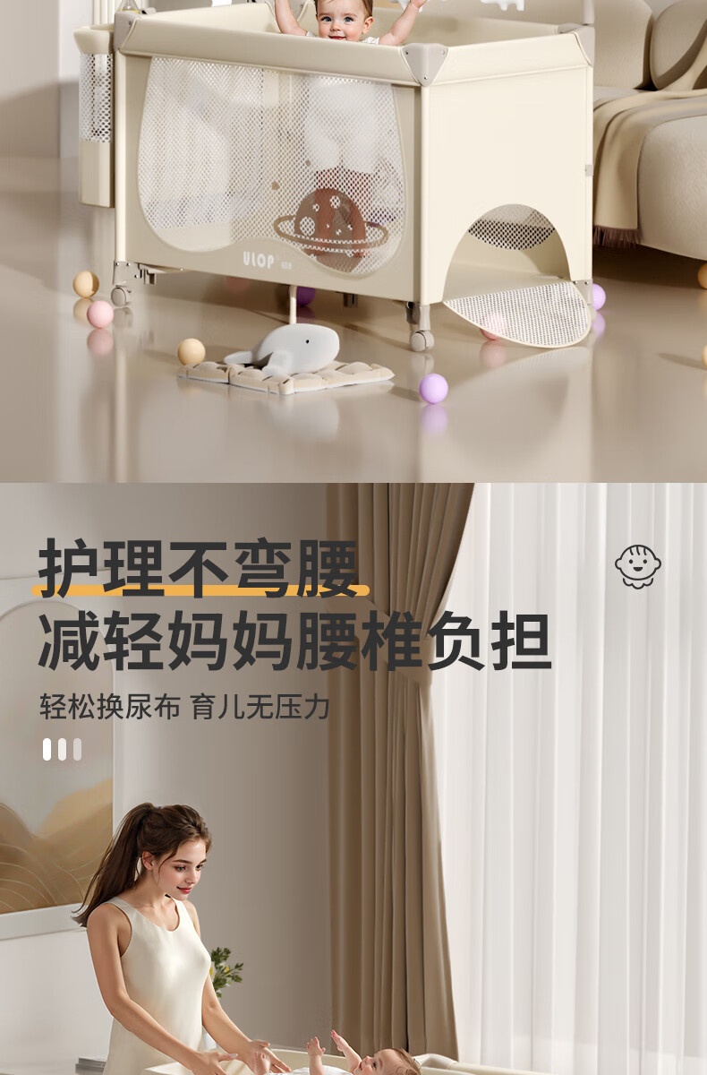 ULOP crib removable splicing crib multifunctional portable foldable baby bed with changing table mosquito net Yunmeng one-click folding baby rocking bed - light khaki baby supplies baby sleeping artifact