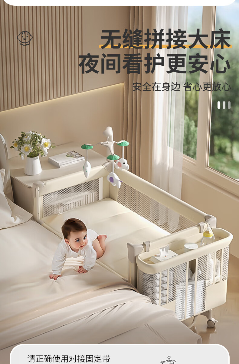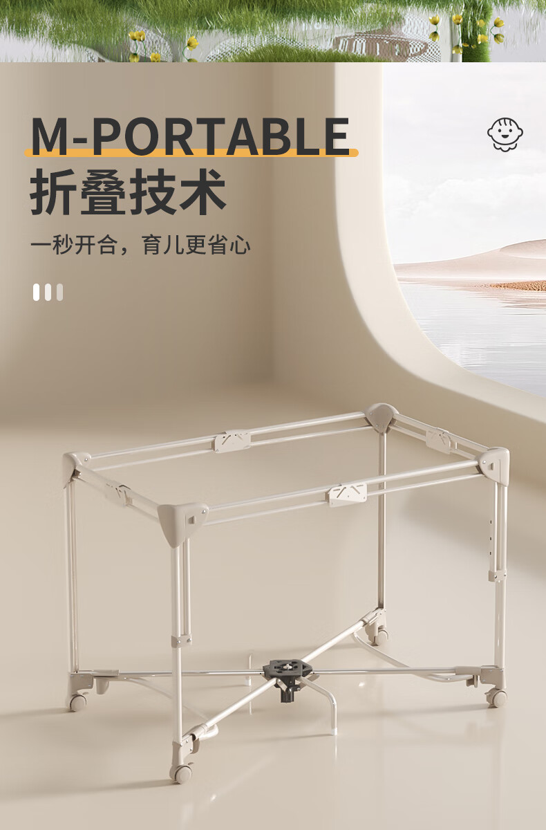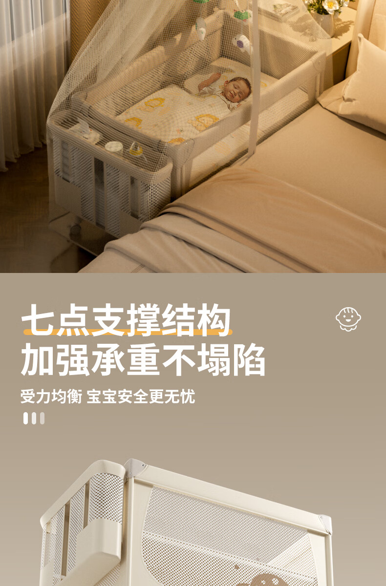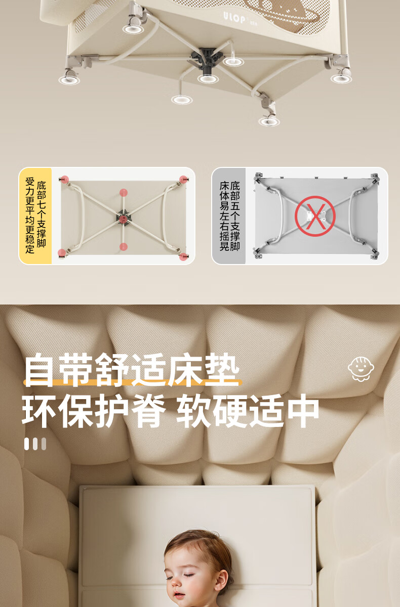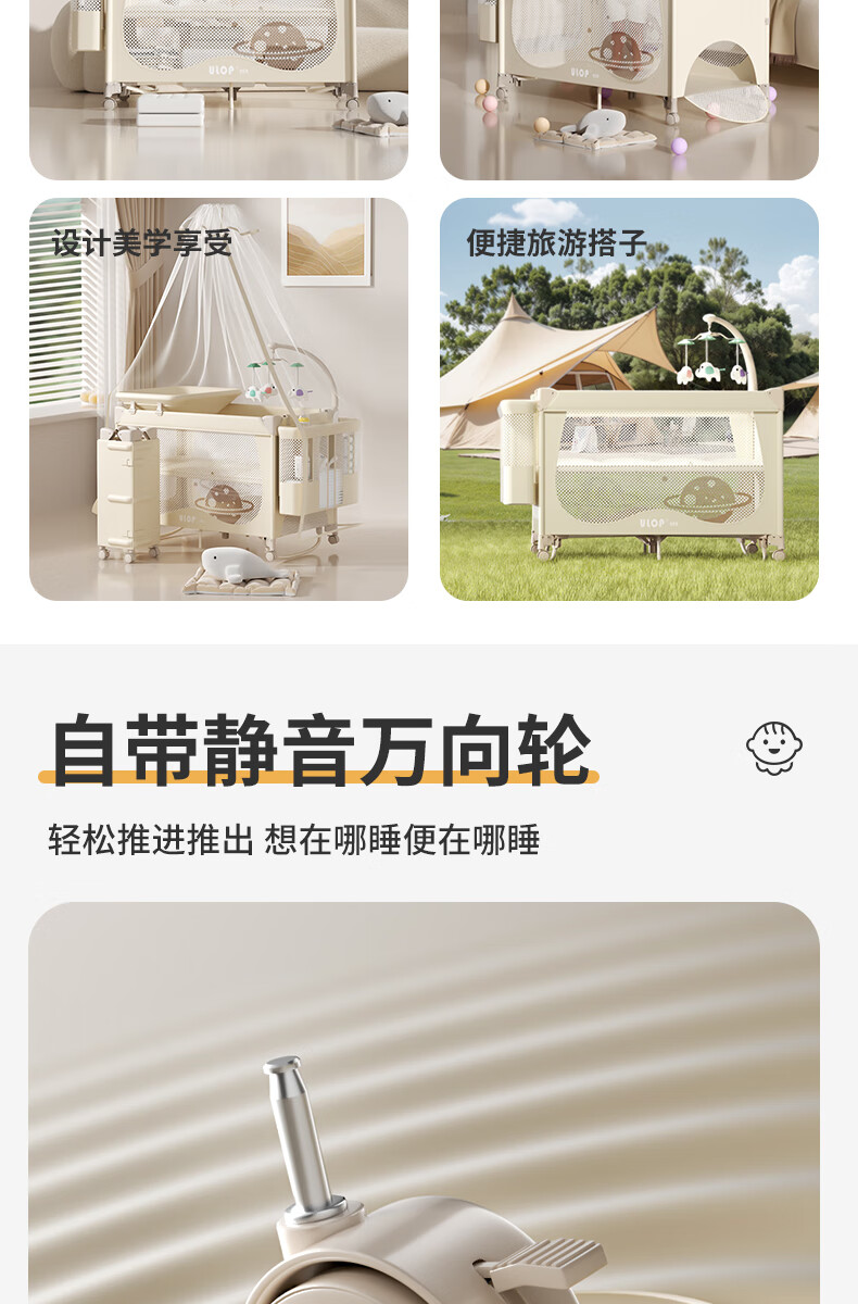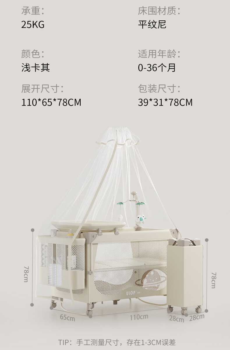 ULOP crib removable splicing crib multifunctional portable foldable baby bed with changing table mosquito net Yunmeng one-click folding baby rocking bed - light khaki baby supplies baby sleeping artifact