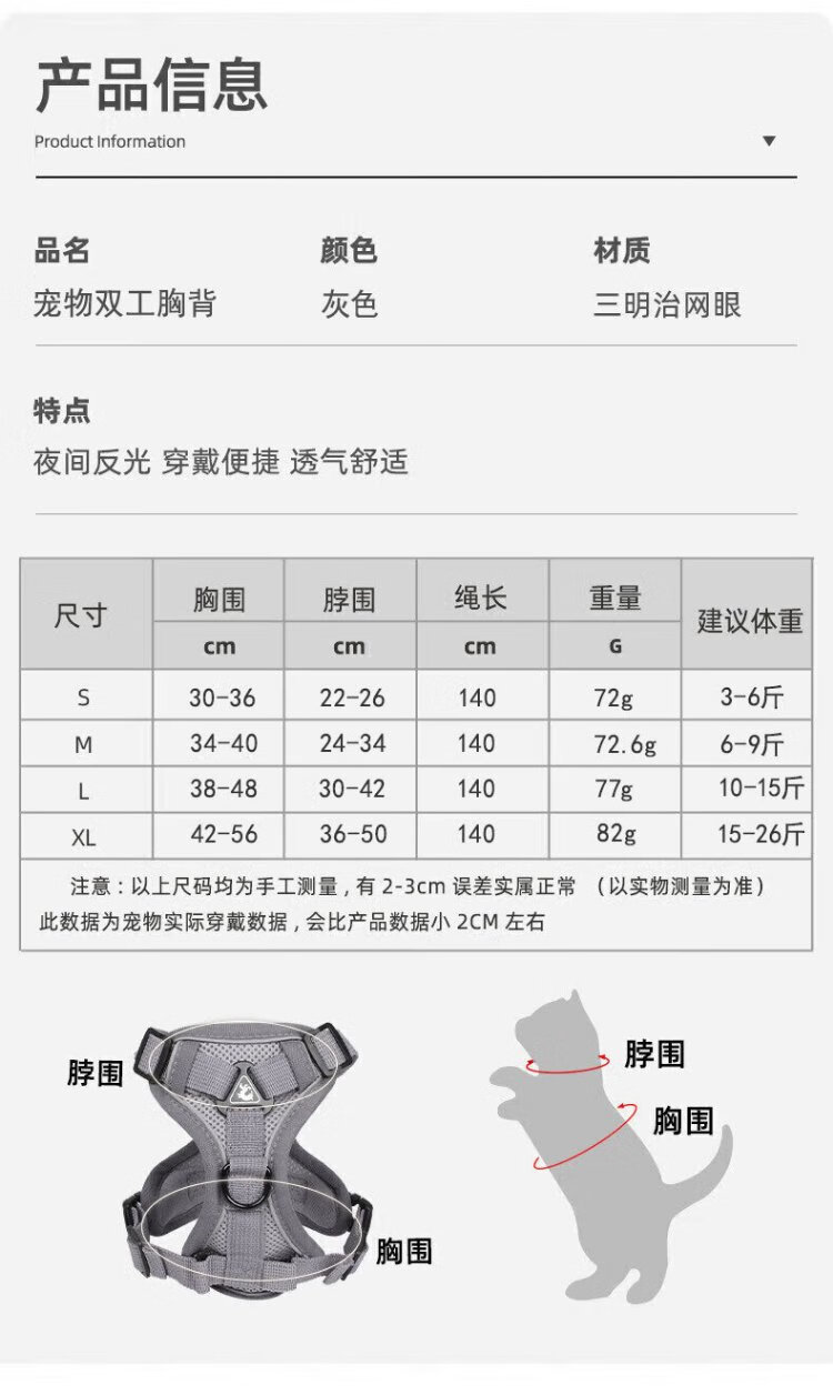 Cat traction rope anti-breakaway vest-style harness reflective and breathable outdoor cat leash pet adjustable artifact upgraded model gray + 1.5m flat rope M size