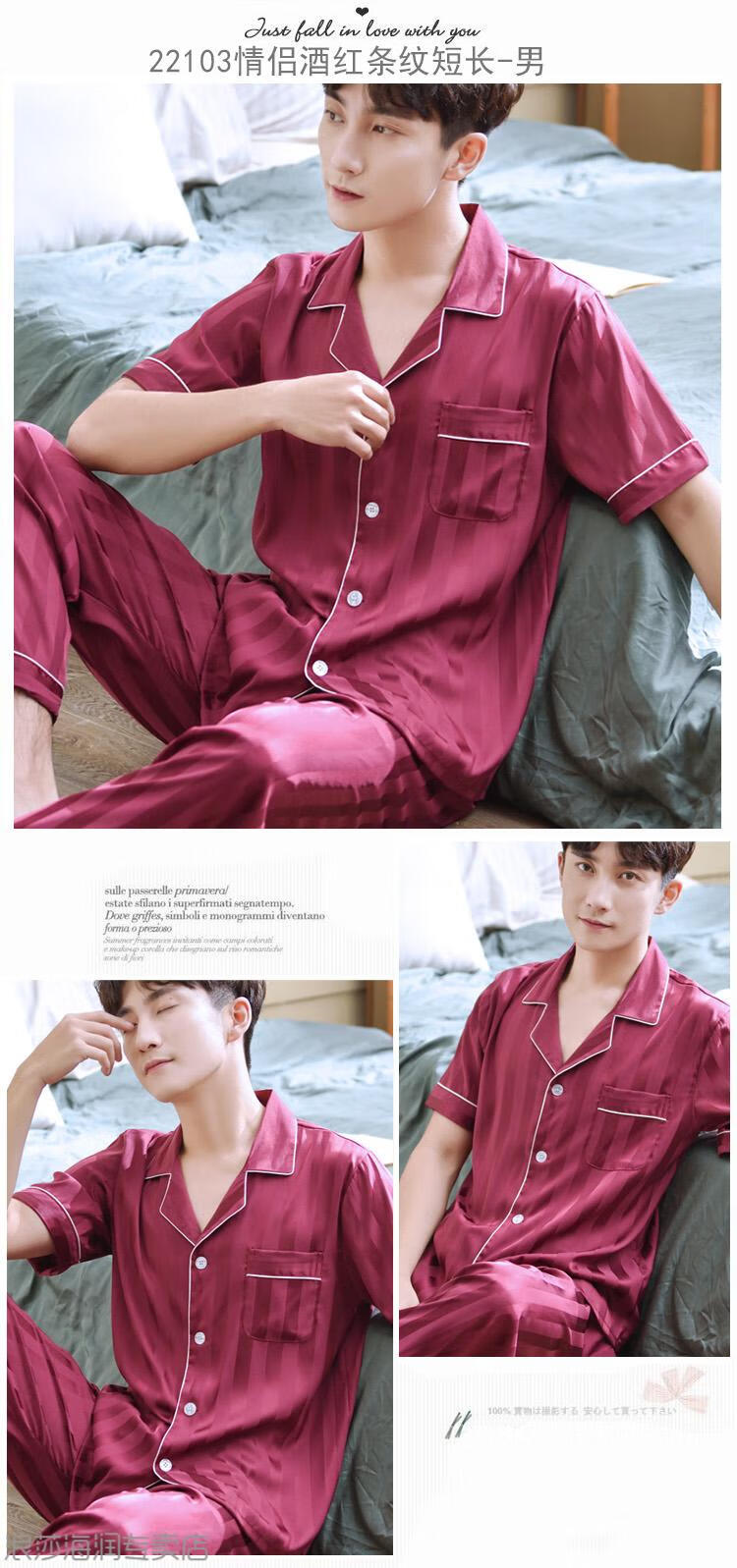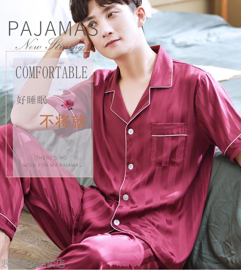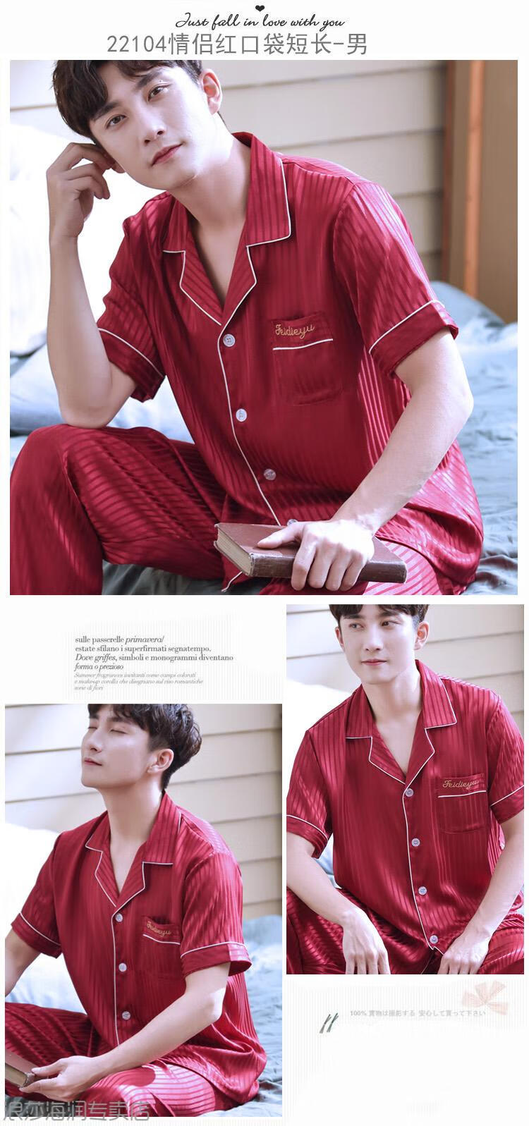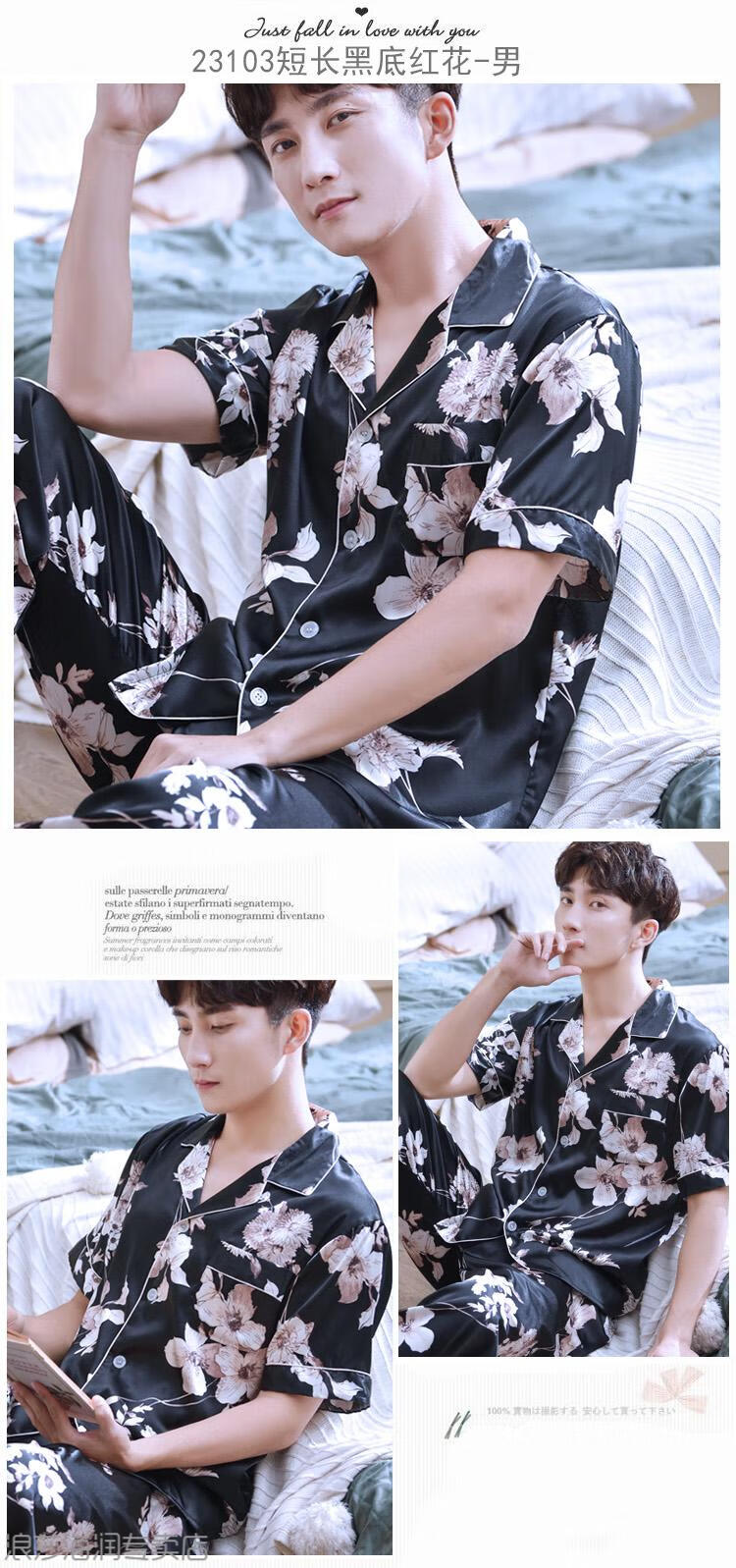LangSha Light Luxury Summer Men's Pajamas Men's Summer Thin Short-Sleeved Ice Silk Suit Home Clothes Large Size Trousers Spring and Autumn Cardigan 23103 Short Long Black Bottom Red Flower-Male 2XL (145~160Jin Jin is equal to 0.5 kg)
