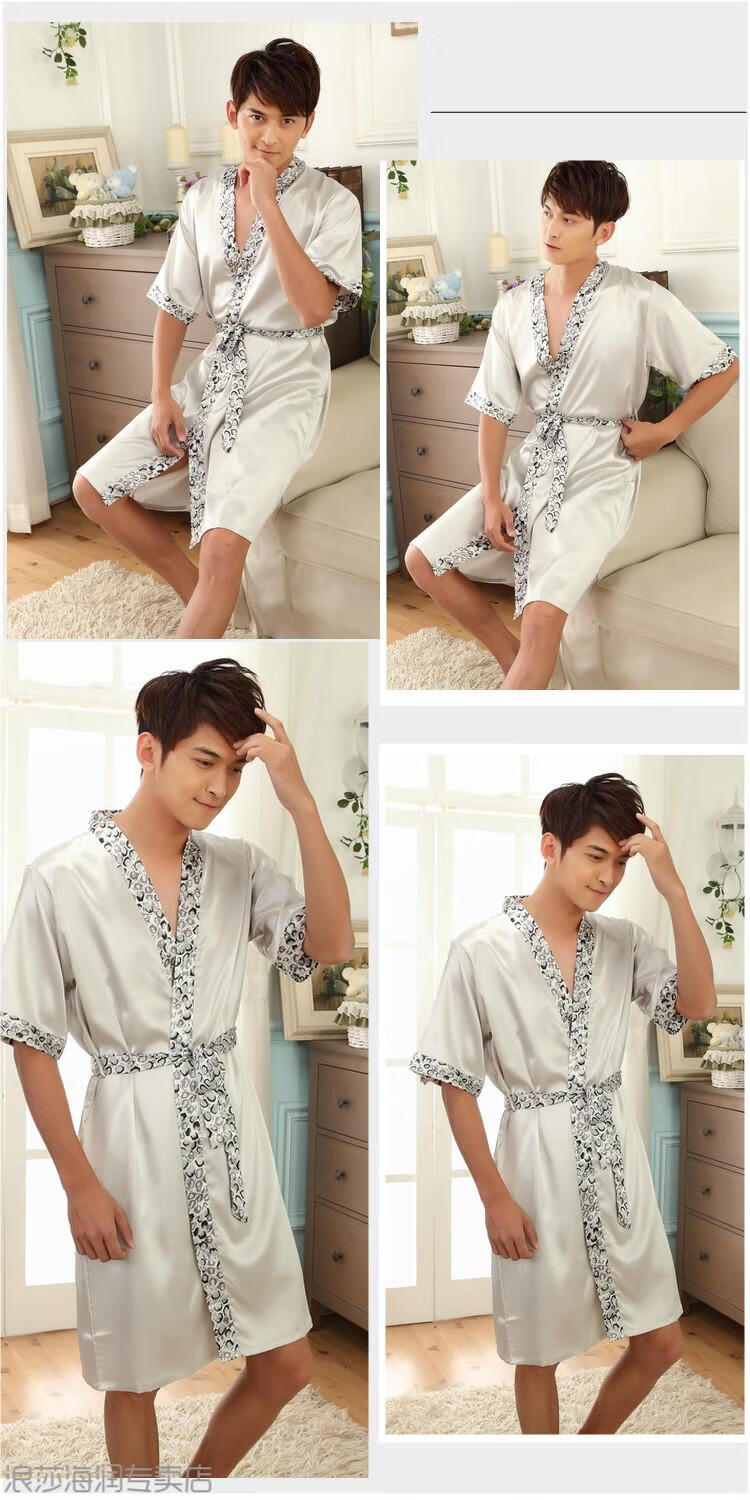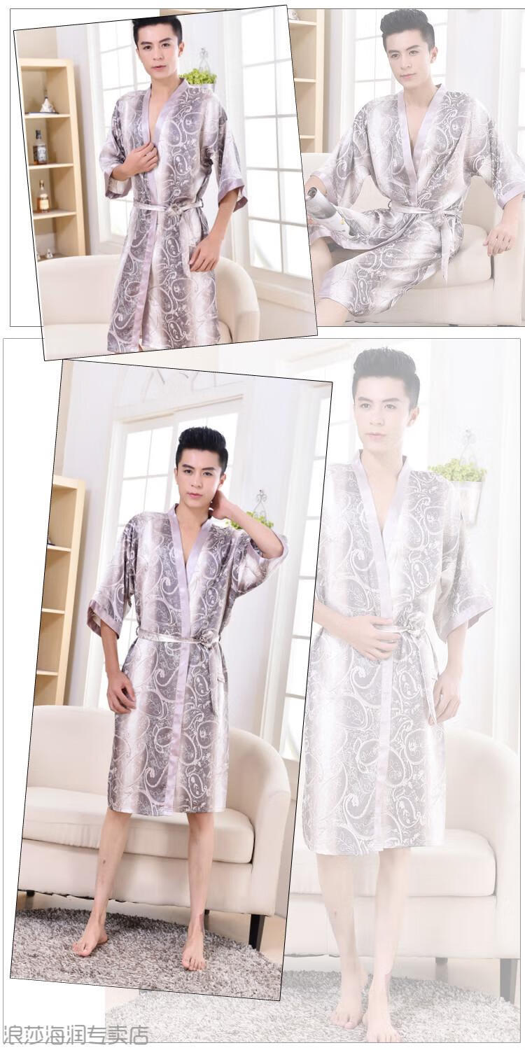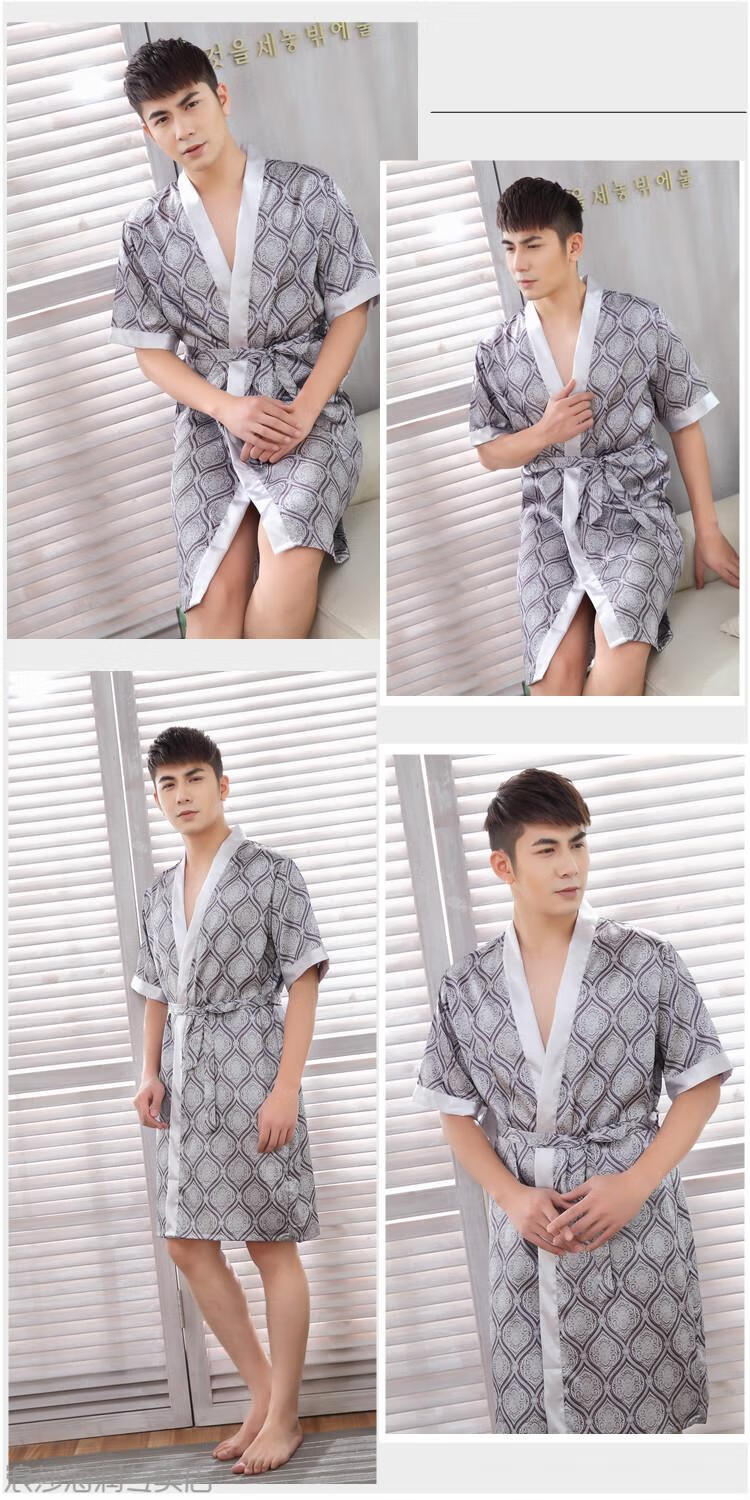 LangSha light luxury nightgown men's summer short-sleeved thin ice silk bathrobe men's mid-length sexy pajamas spring and autumn home clothes 13006 dark gray letter robe short-sleeved 3XL 185 170-200Jin Jin equals 0.5 kg