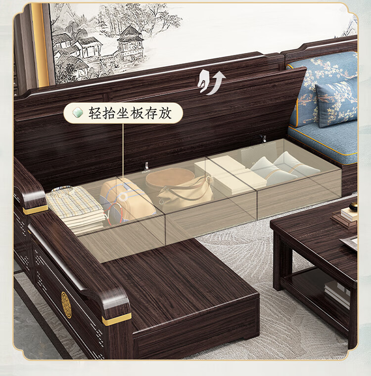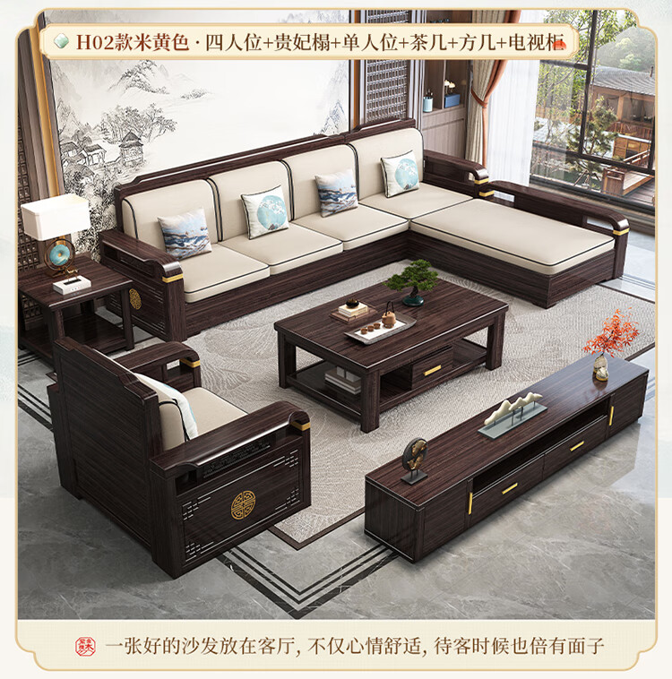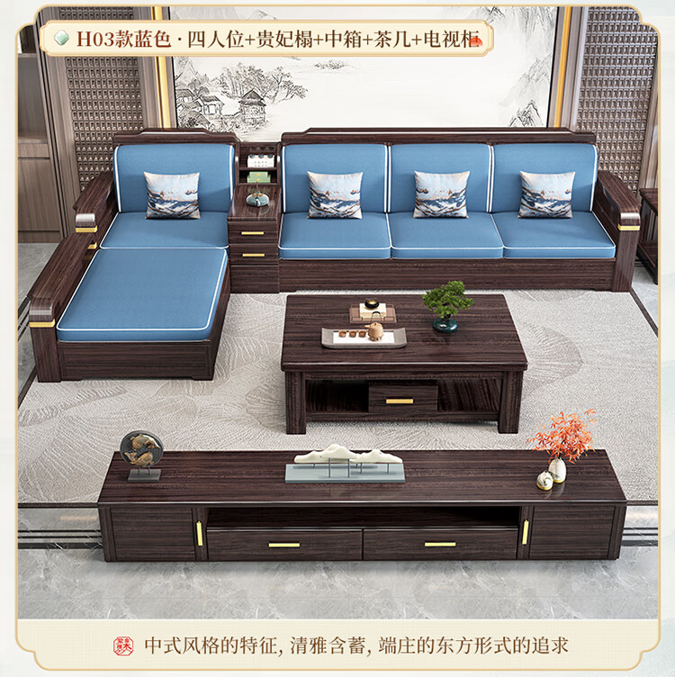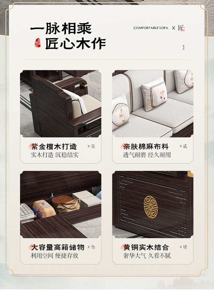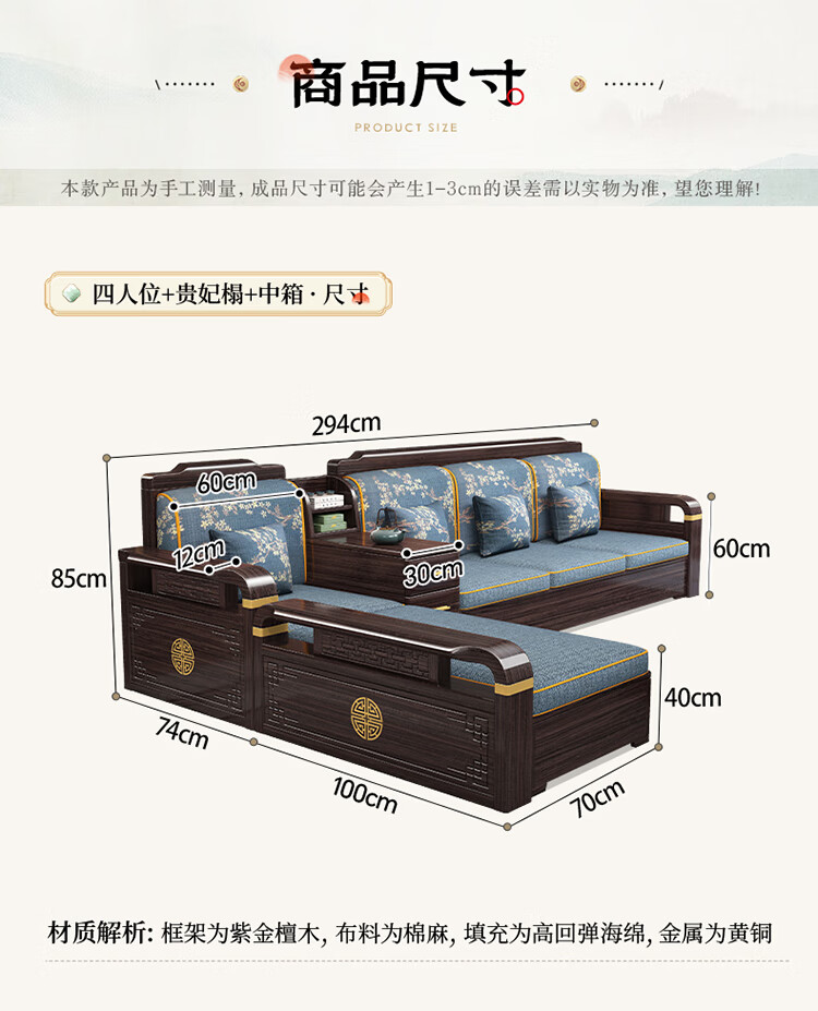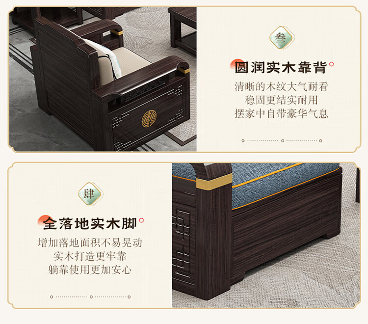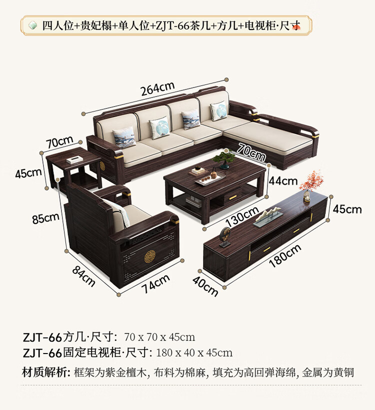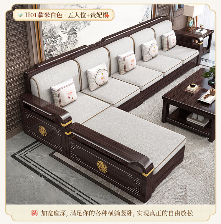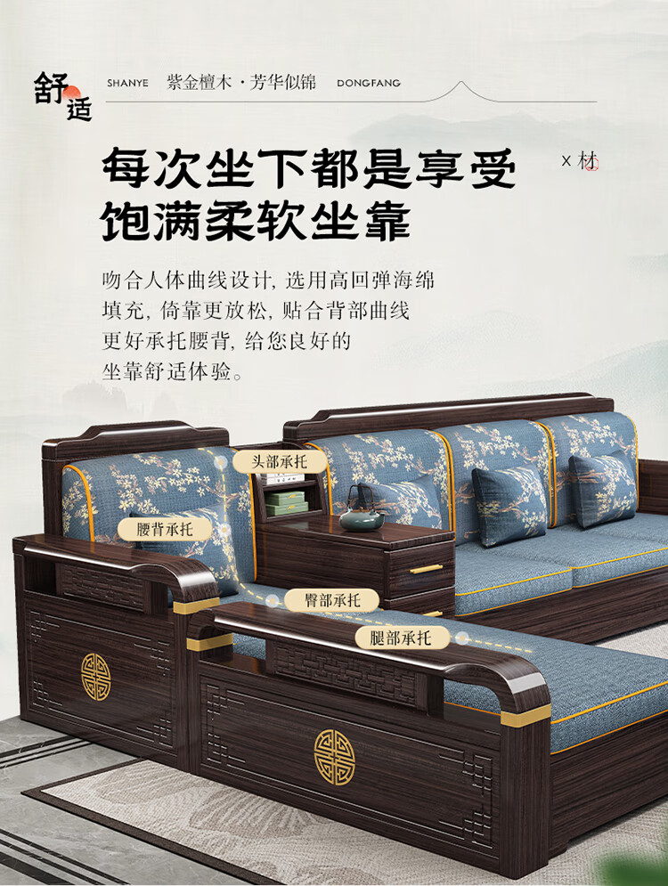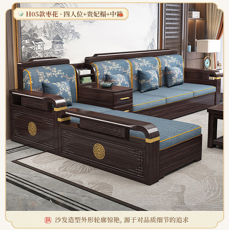 Chinese Family Sofa Solid Wood Sofa Purple Gold Sandalwood New Chinese Style Living Room Large and Small Household Winter and Summer Storage Furniture Four Seats + Imperial Concubine + Long Coffee Table Limited Loss of 10 Sets Combination Free Upgrade Cat Scratch Leather Cushion