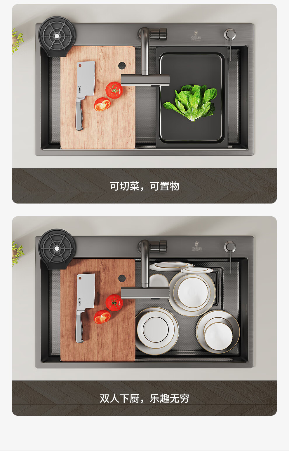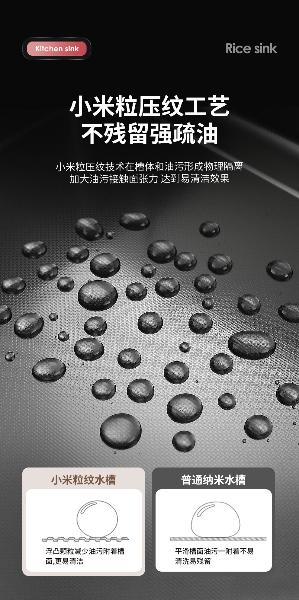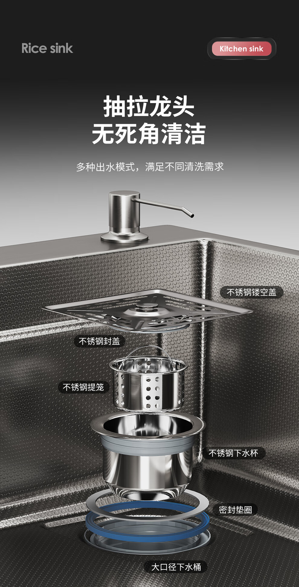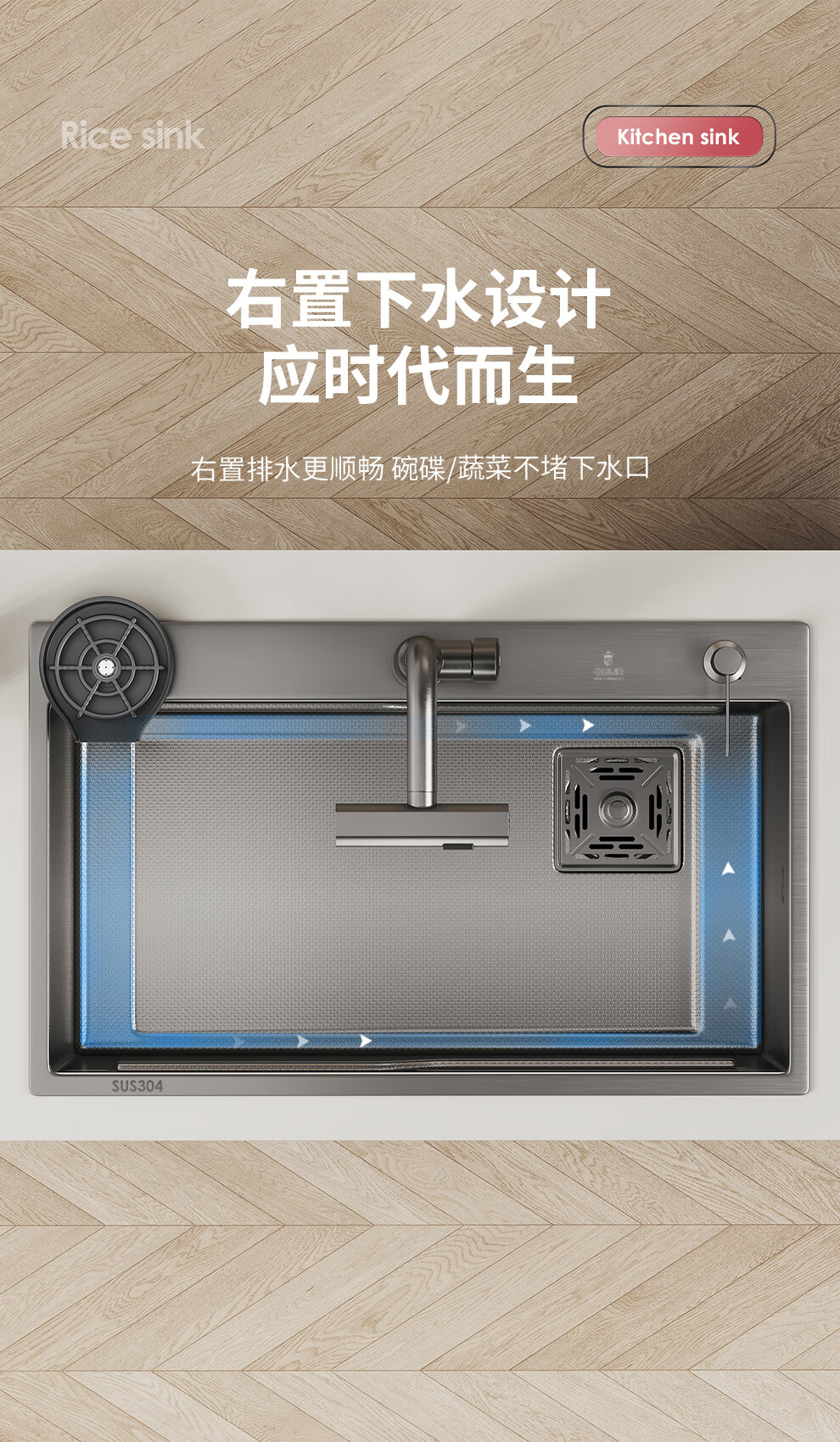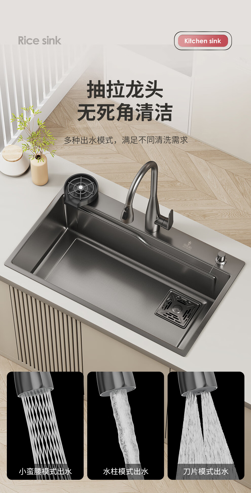 OULIN sink gun gray large single tank kitchen SUS304 stainless steel handmade basin sink sink vegetable sink table middle and lower rice grain embossed 68*45+ small waist pull-out faucet cover