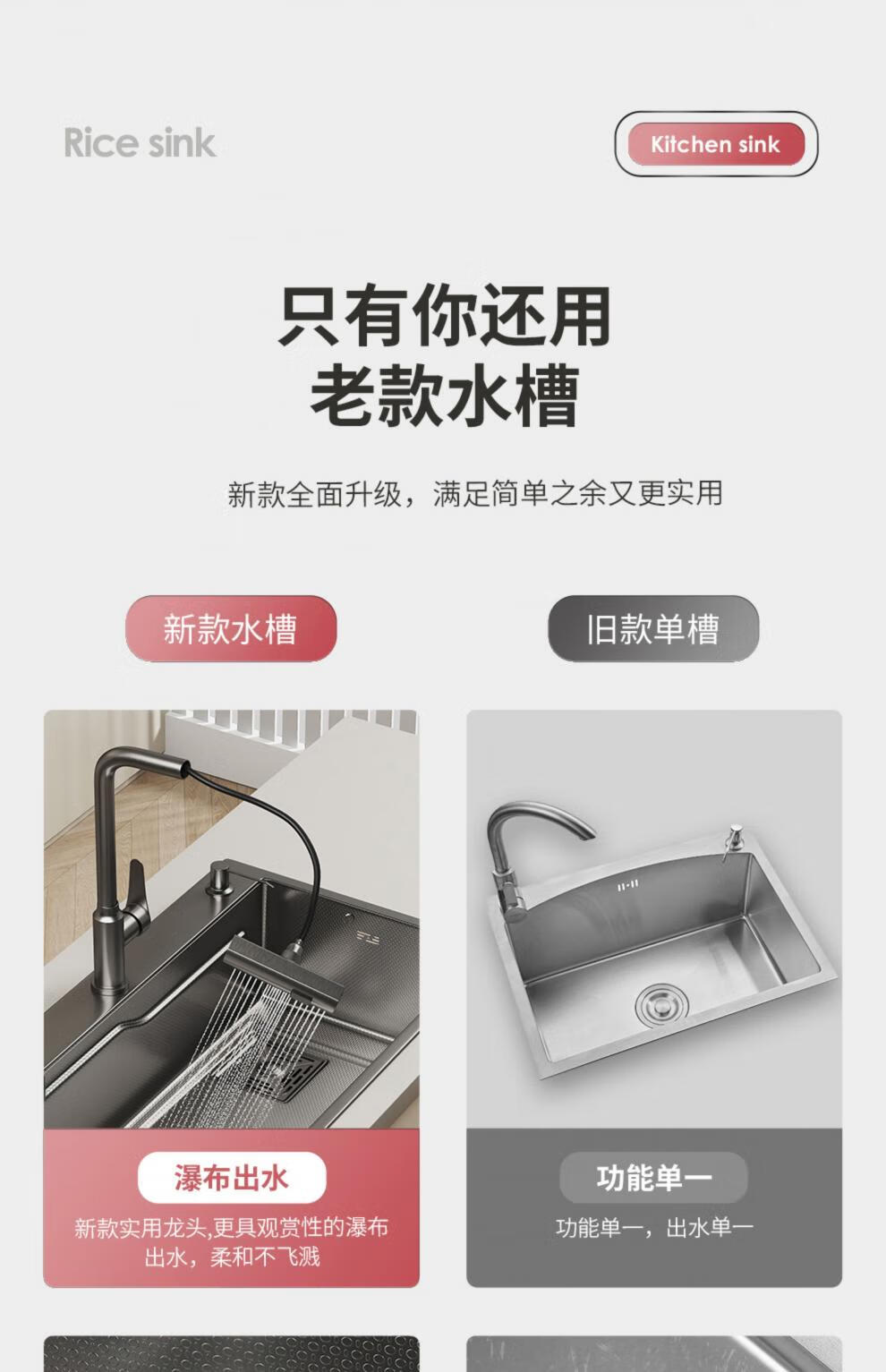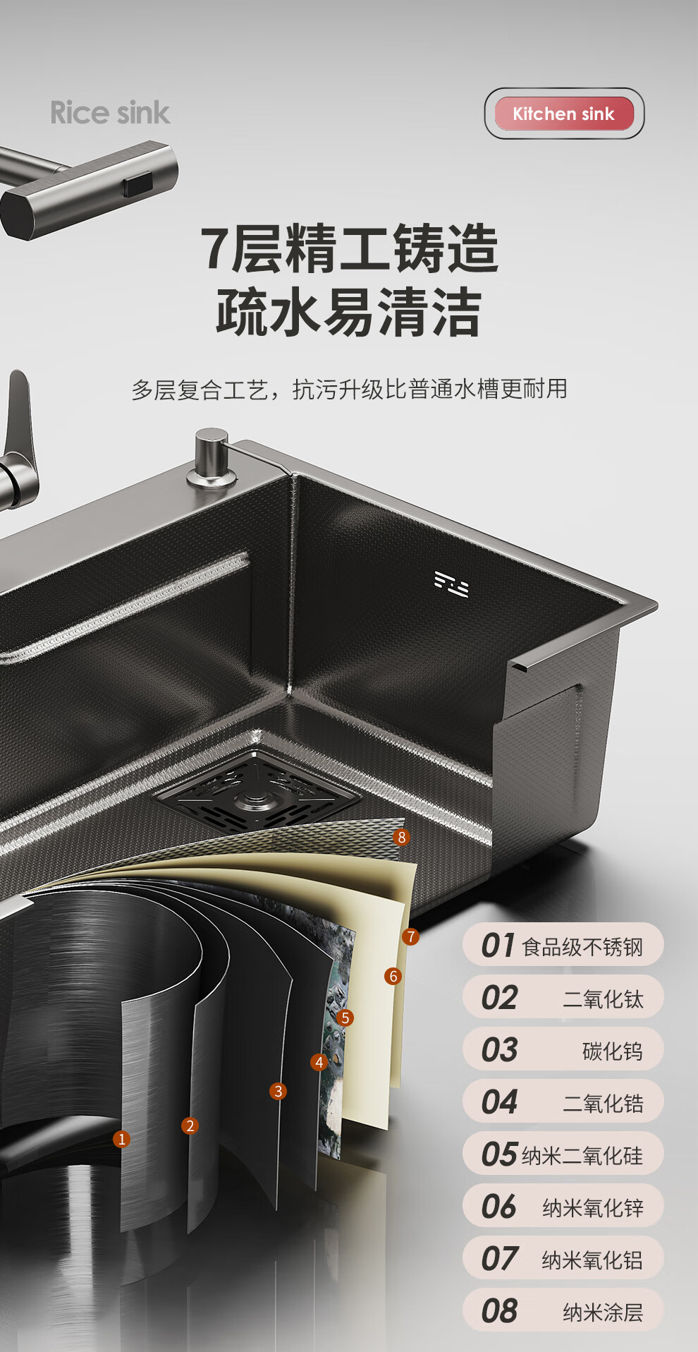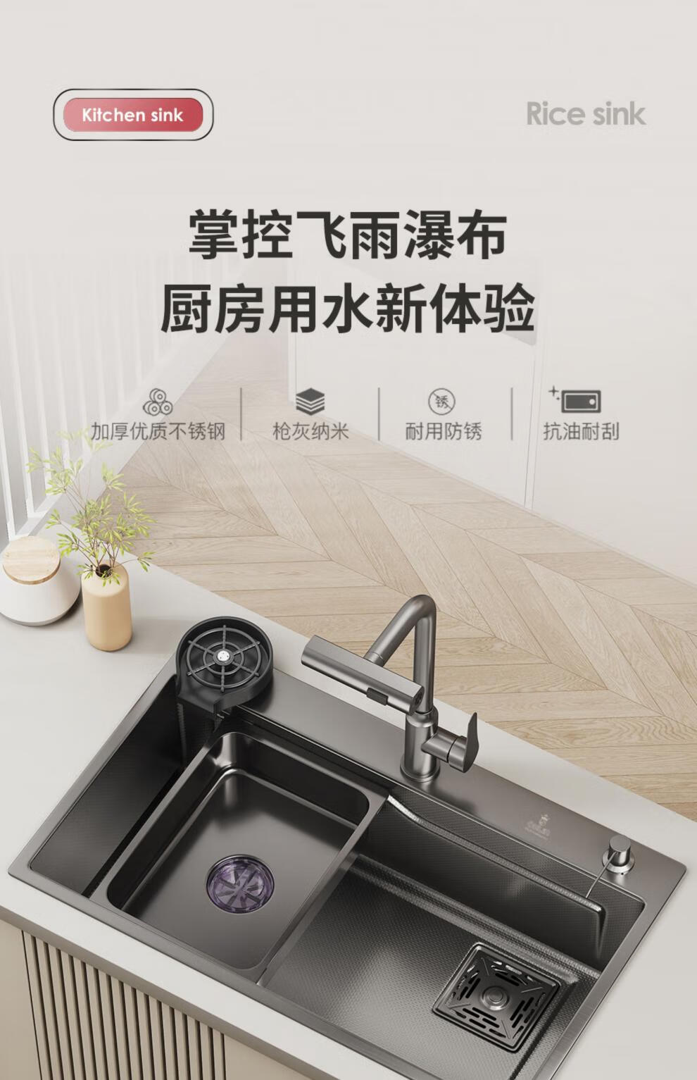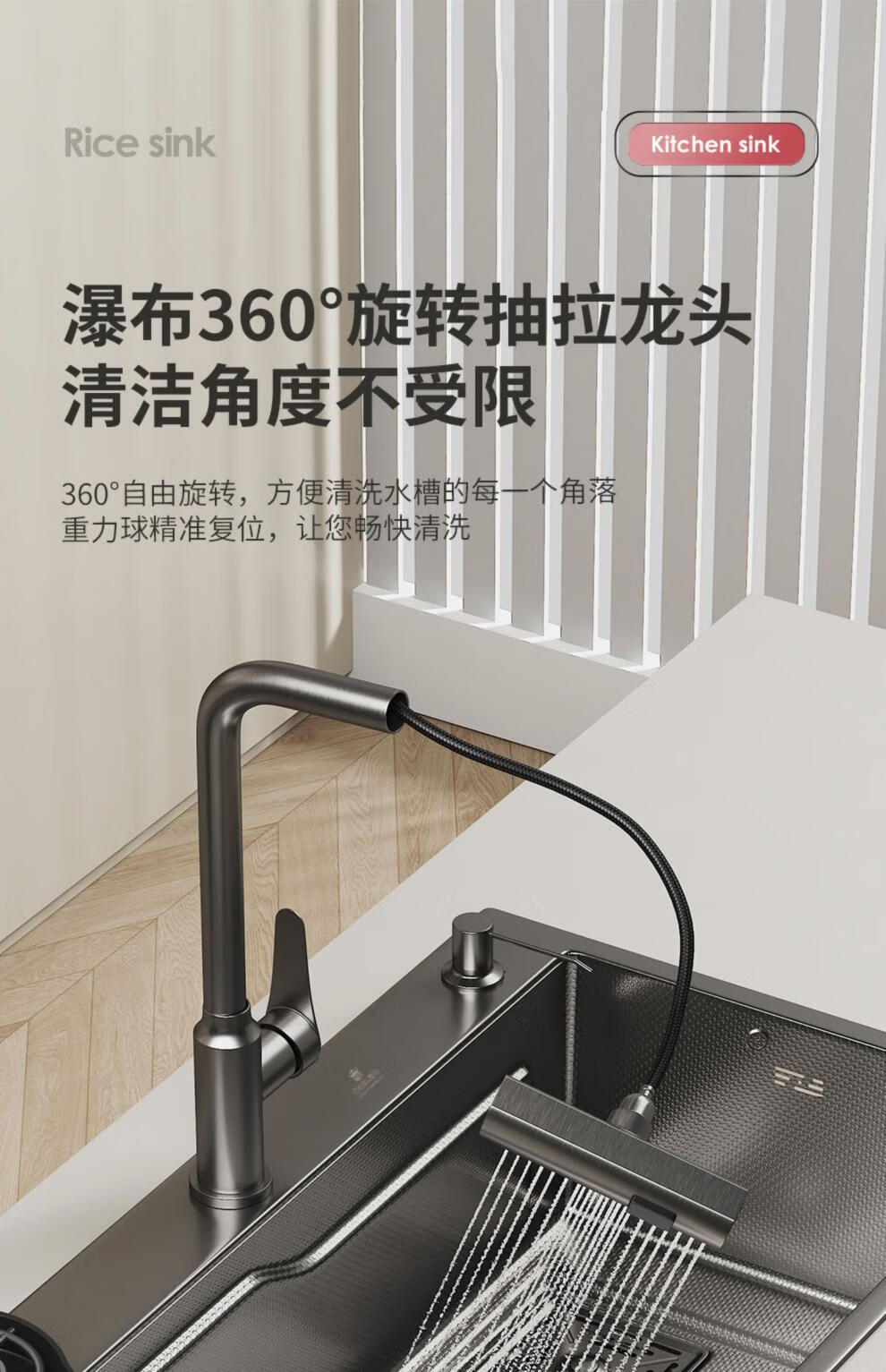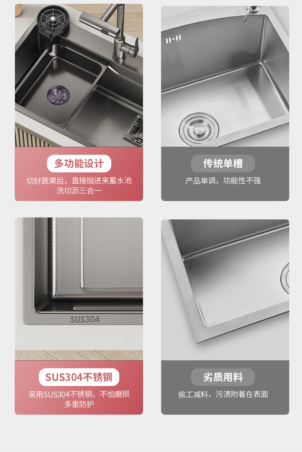 OULIN sink gun gray large single tank kitchen SUS304 stainless steel handmade basin sink sink vegetable sink table middle and lower rice grain embossed 68*45+ small waist pull-out faucet cover