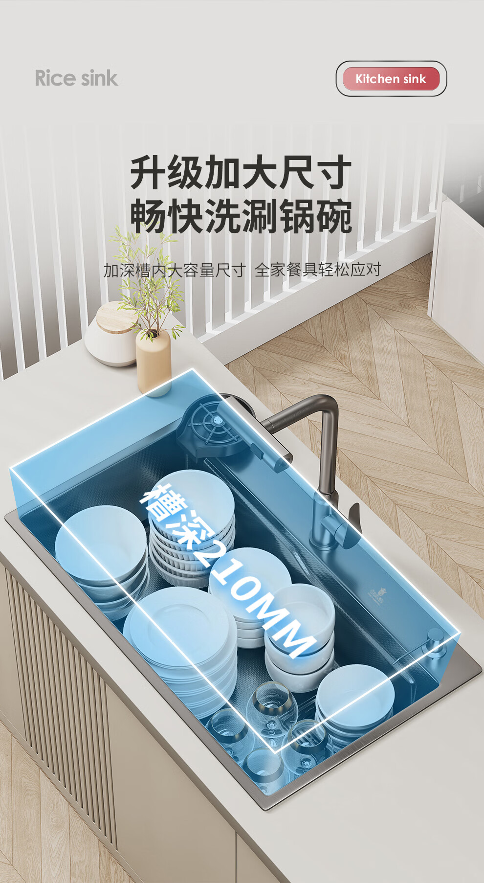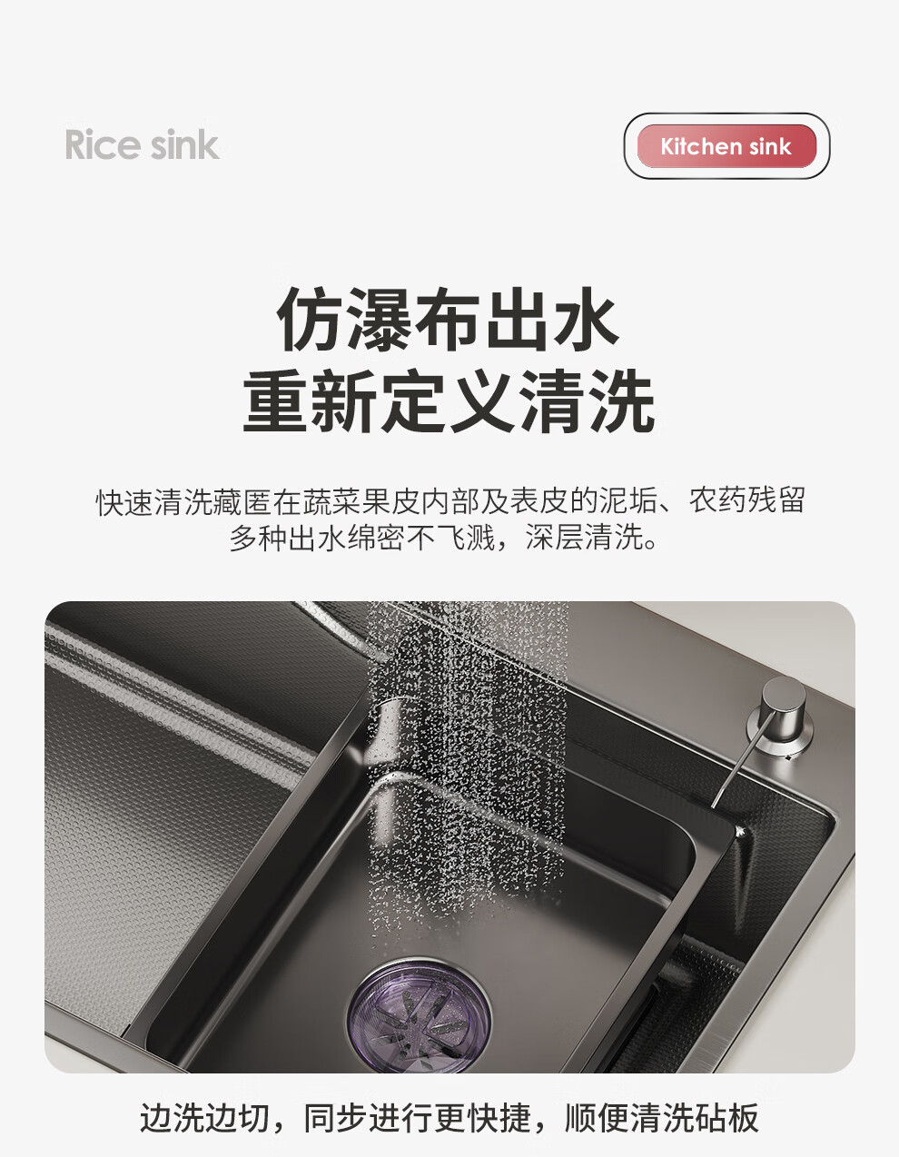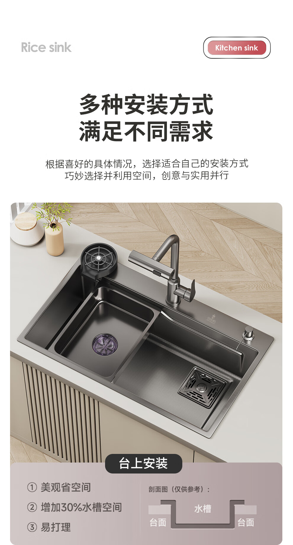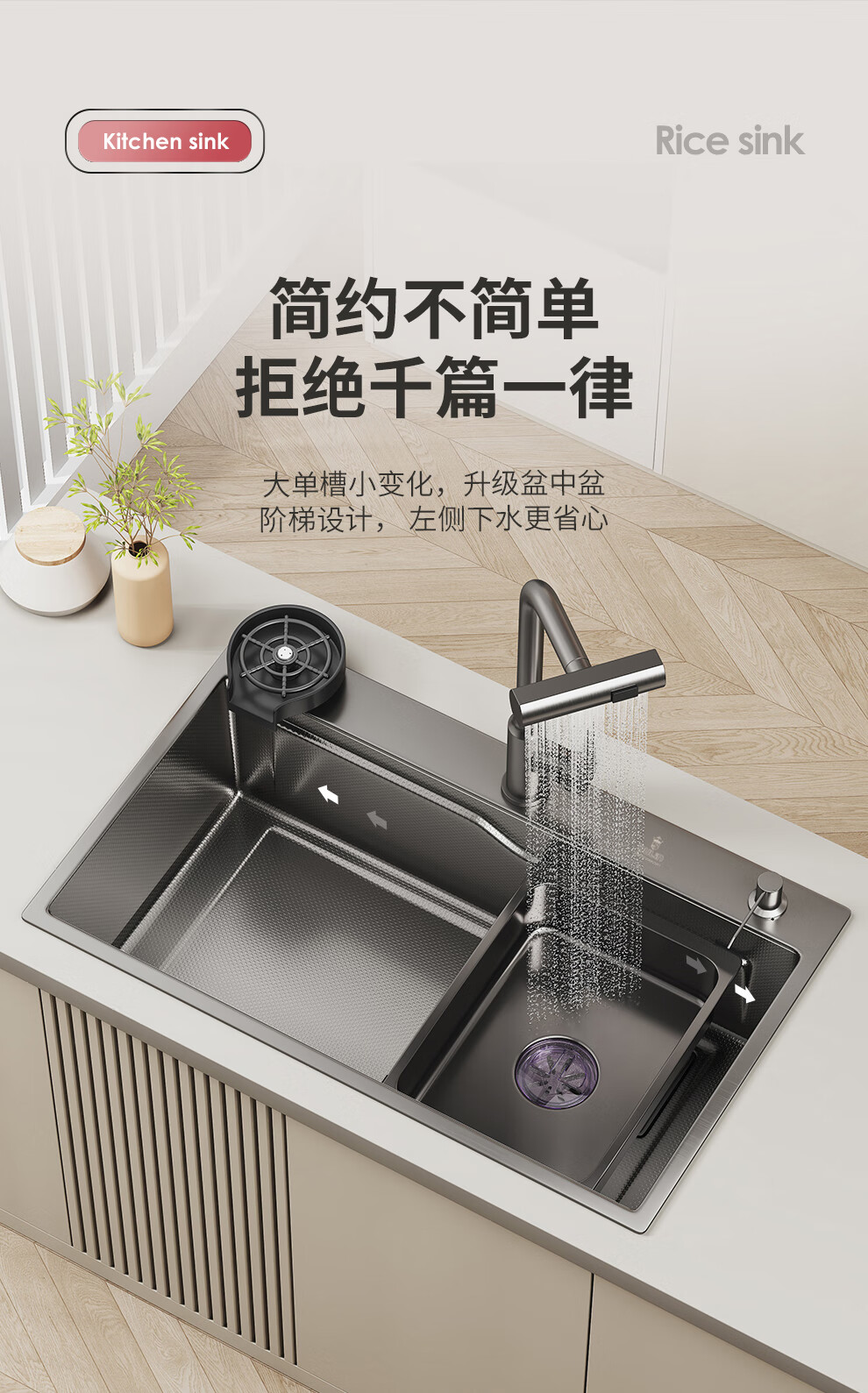 OULIN sink gun gray large single tank kitchen SUS304 stainless steel handmade basin sink sink vegetable sink table middle and lower rice grain embossed 68*45+ small waist pull-out faucet cover